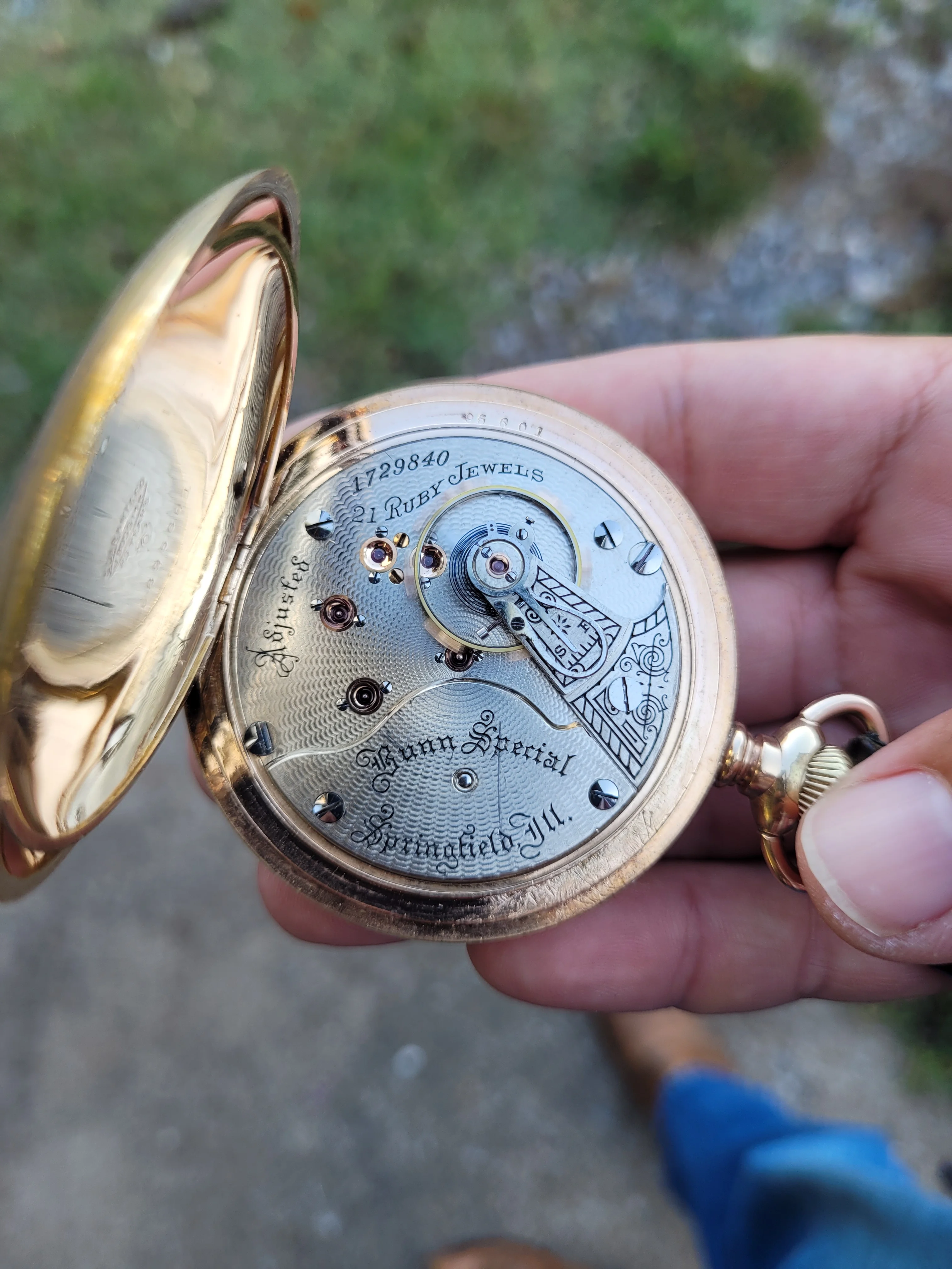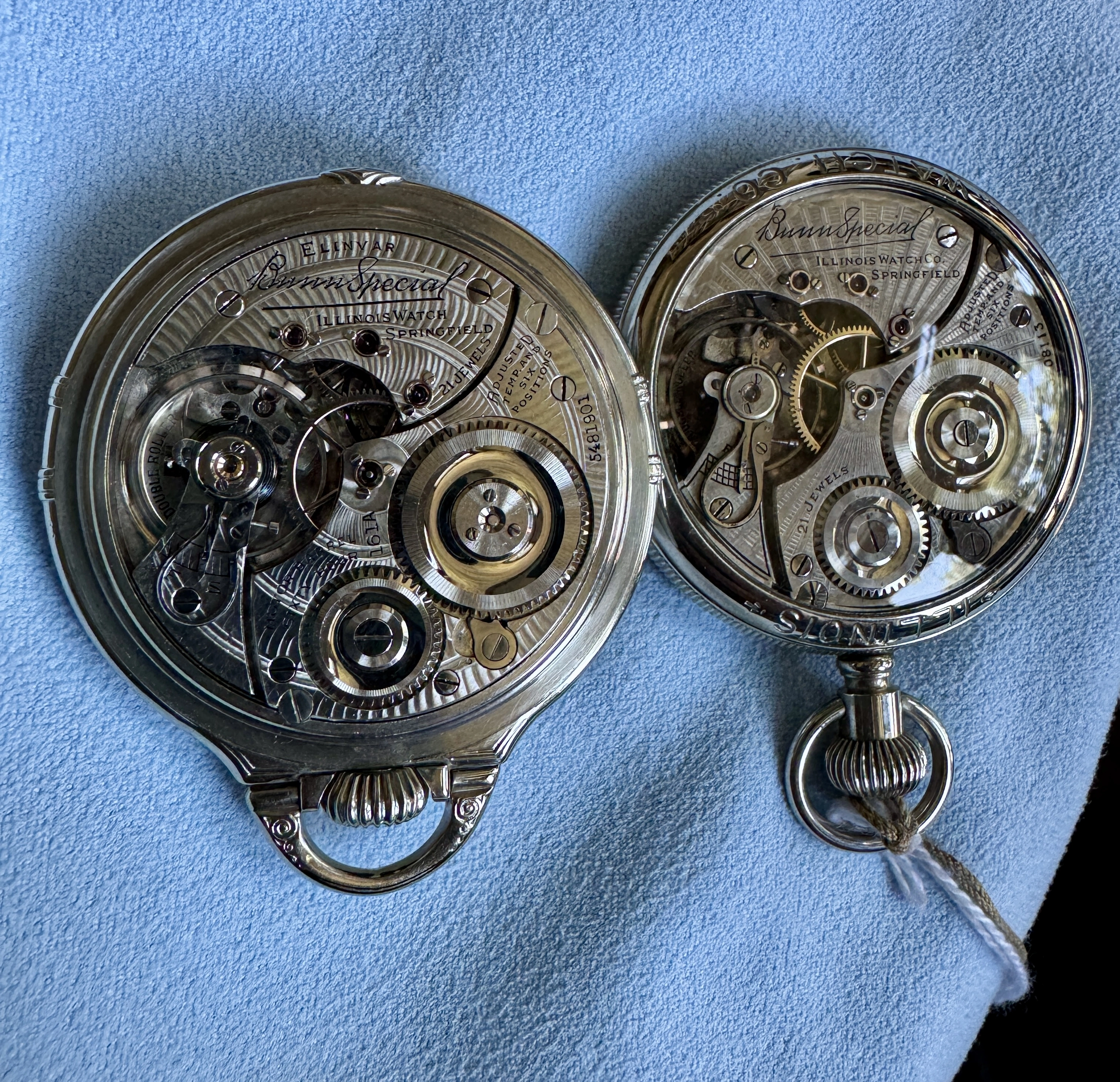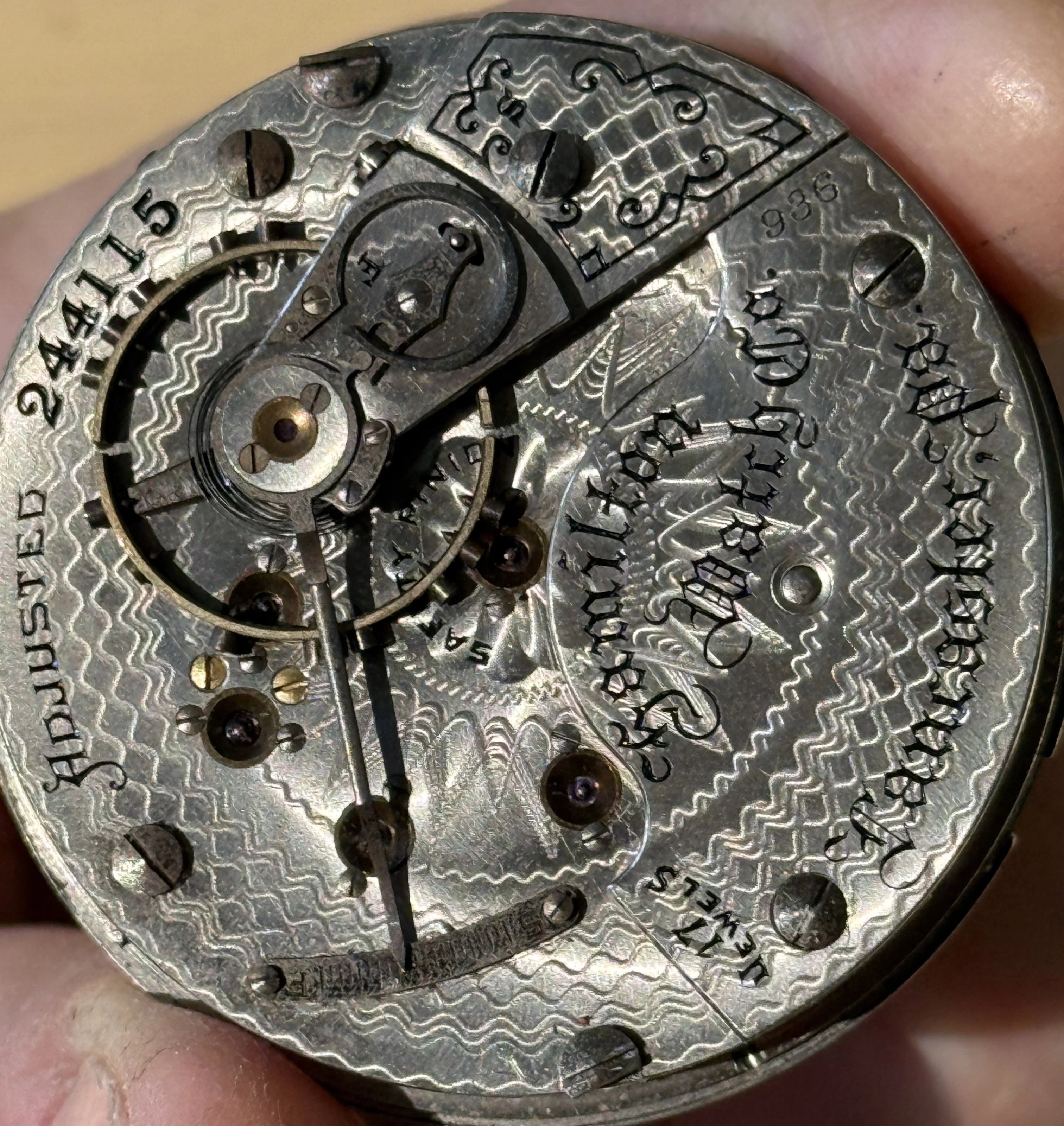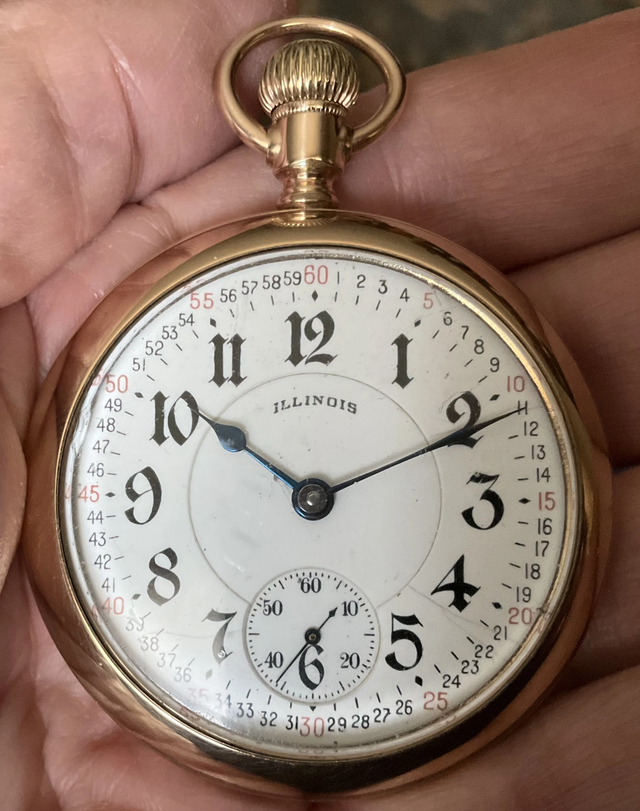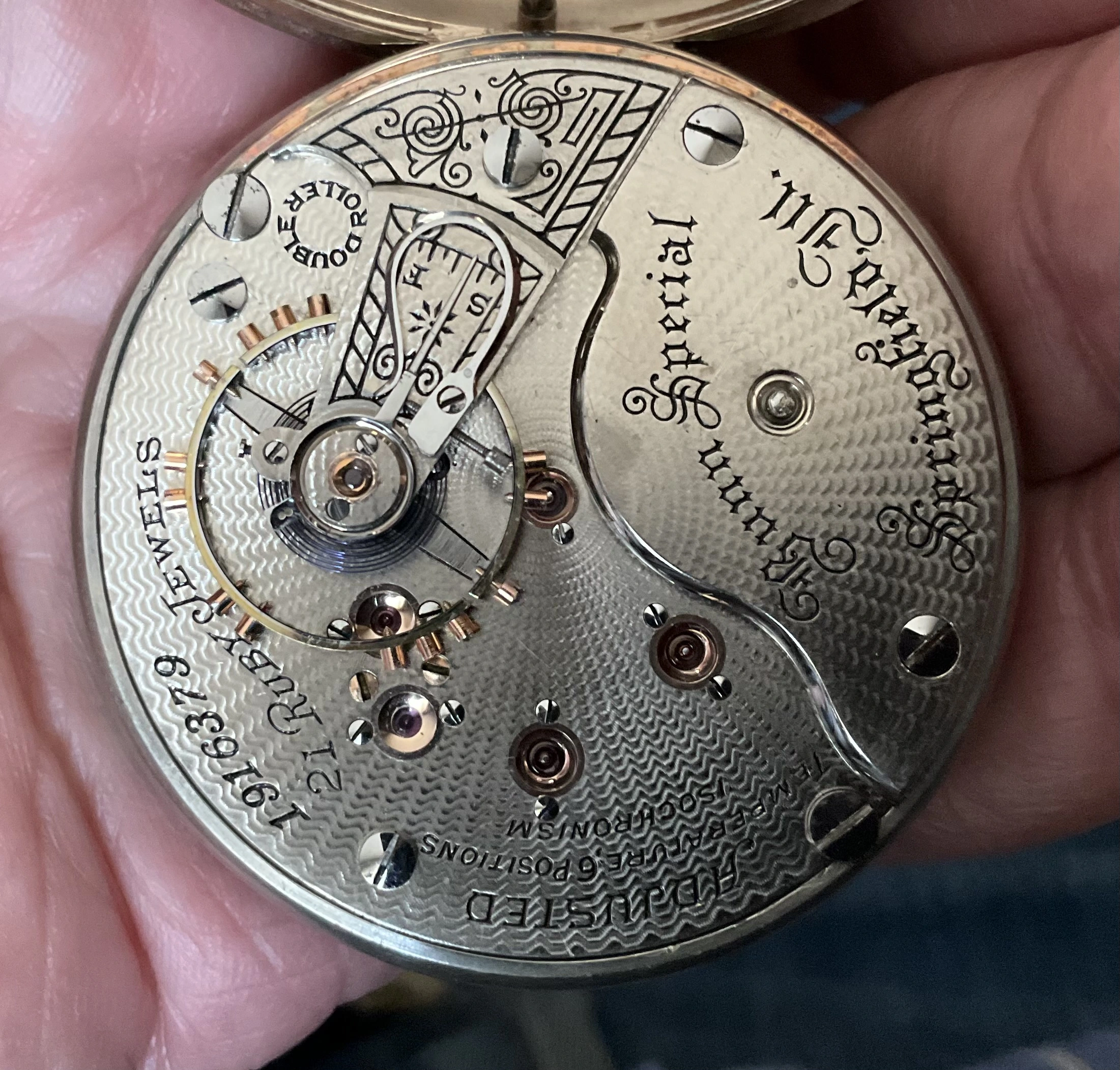 路I think I have the details correct. B W Raymond was the chap who helped set up the land deal where Elgin initially built its factory. Your Elgin is a manual winder. These are free sprung. That is, there is no traditional regulator on them. The arms on the balance wheel are in the shape of two semi-circular volute curves, each with a tiny weight on them which are moved over the balance arms, speeding up or slowing down the rate. These watches are not designed to be shock resistant, but the unusual balance arms are known to flex a bit in the event of a blow. In the photo I showed, there are 4 Accutron 214 models like yours. These were not the first railroad standard wrist watches, but they revolutionized the market for wrist watches for railroaders. They were the first widely accepted, and very successful railroad standard wrist watches. I have often had occasion to wonder how these Accutrons performed for crews that operated diesel/electric locomotives.