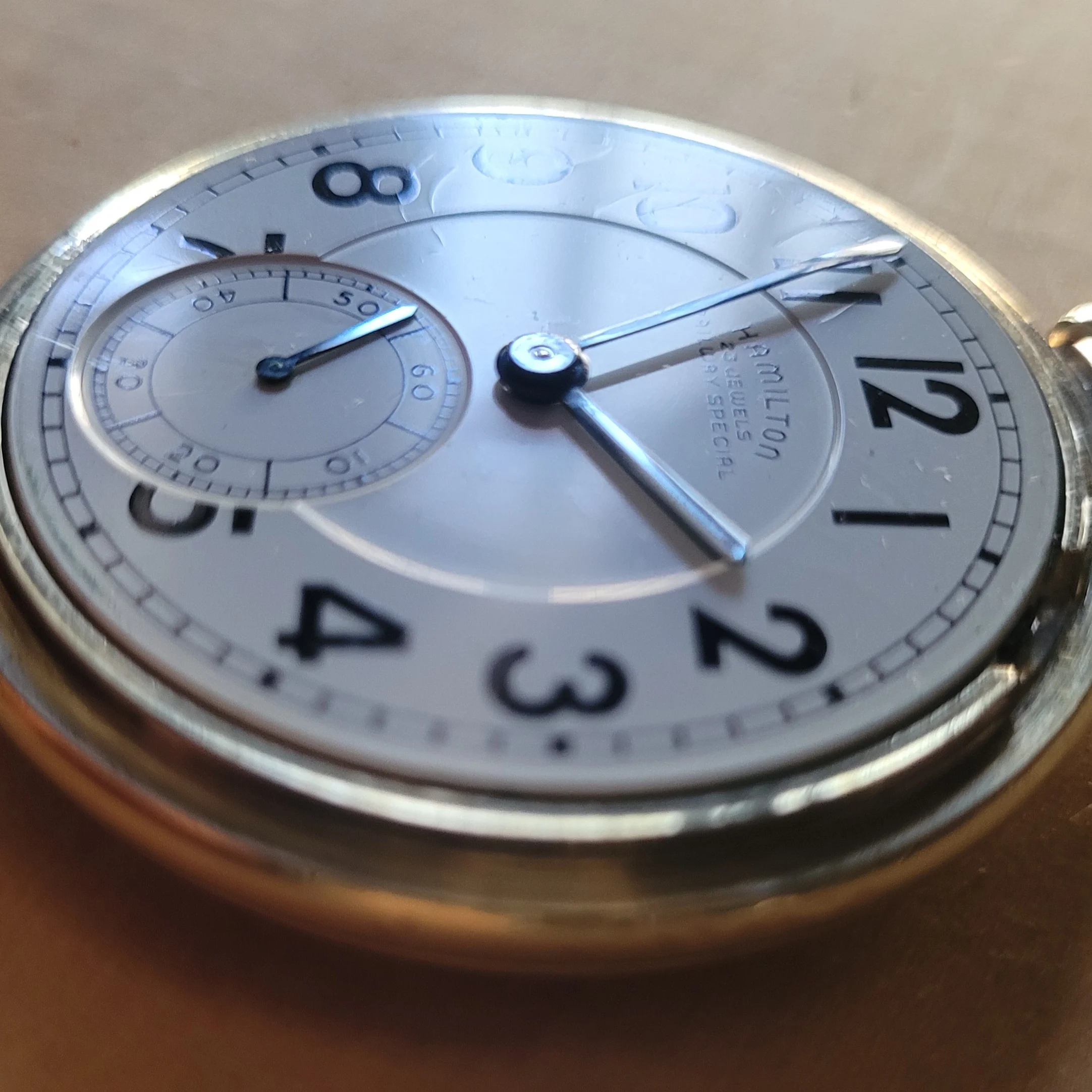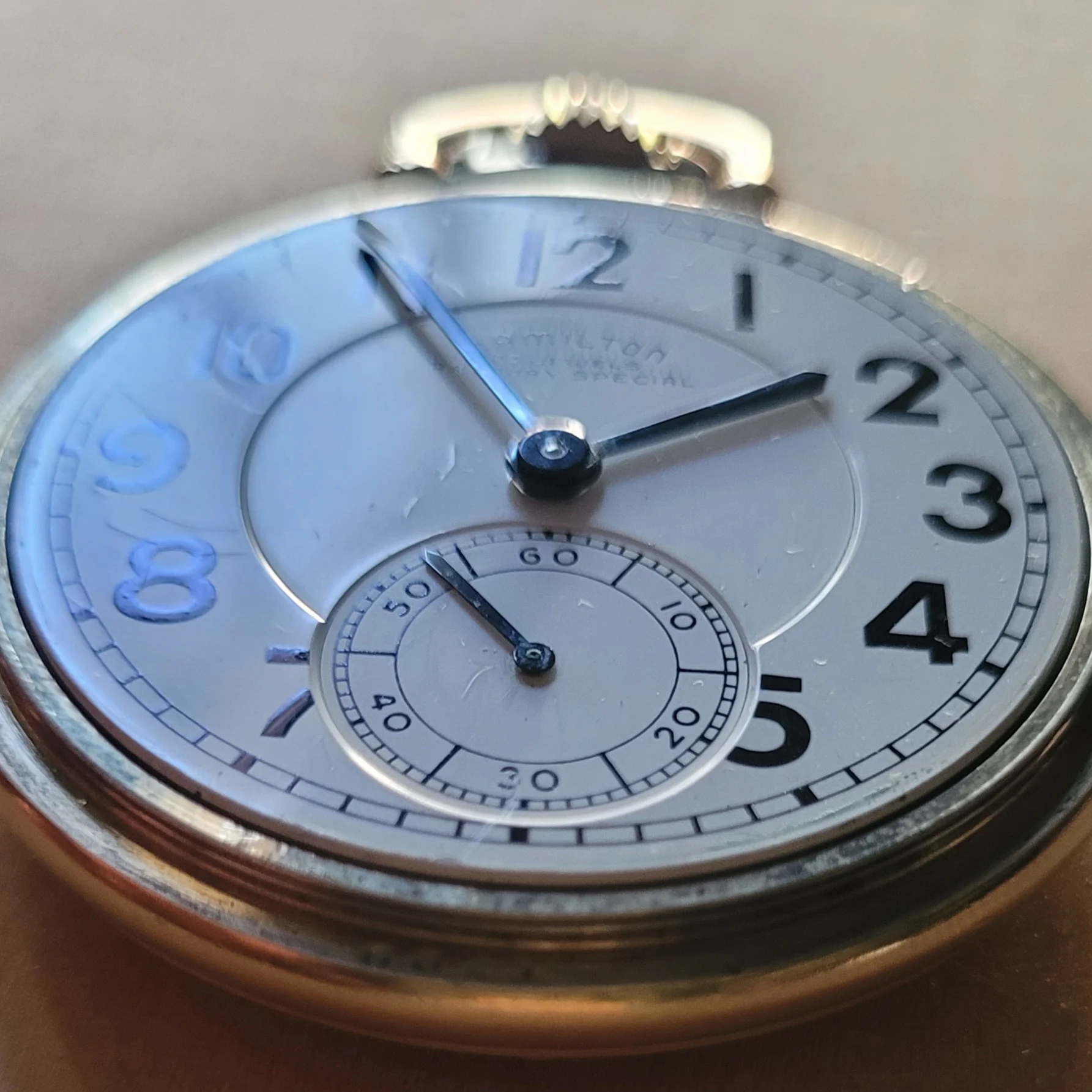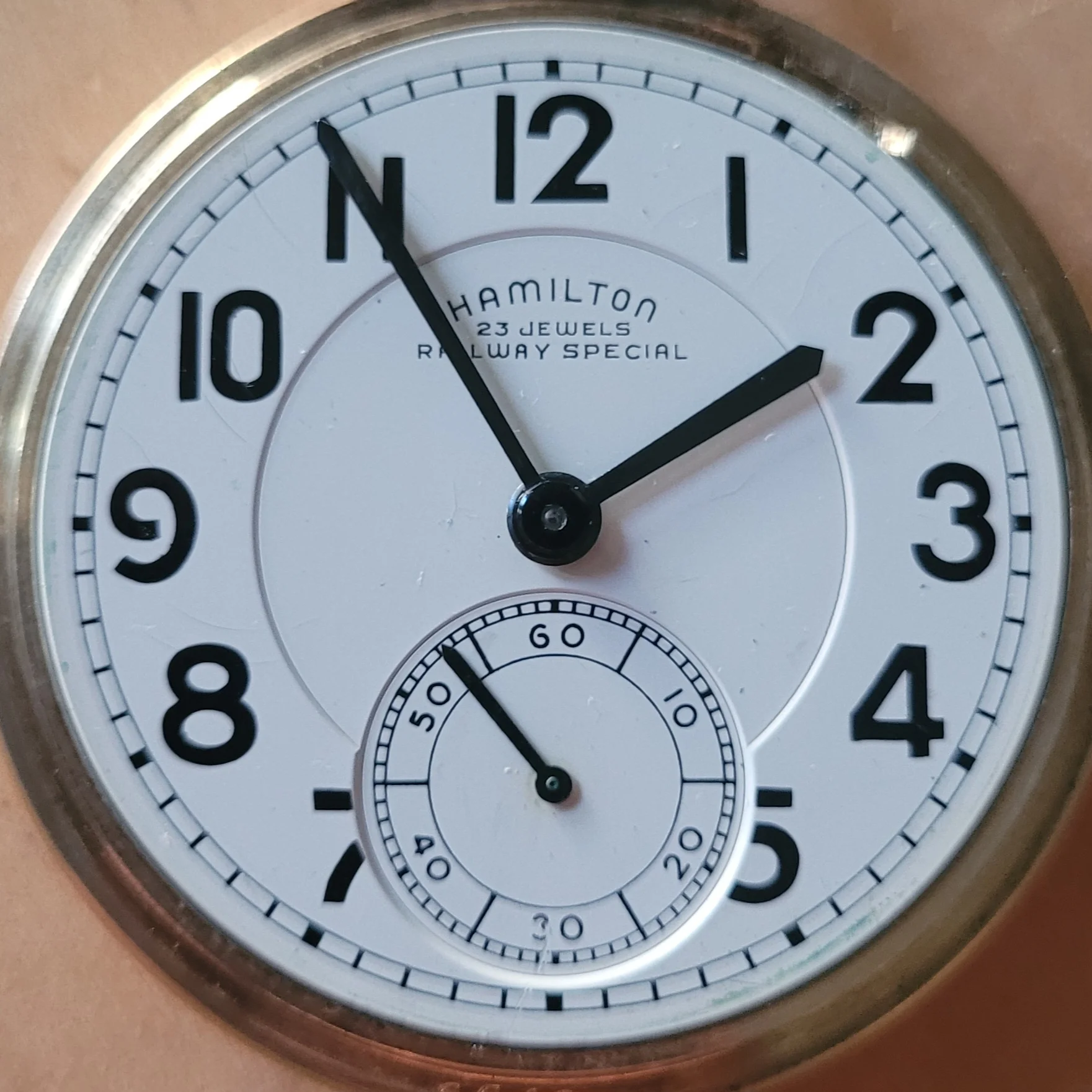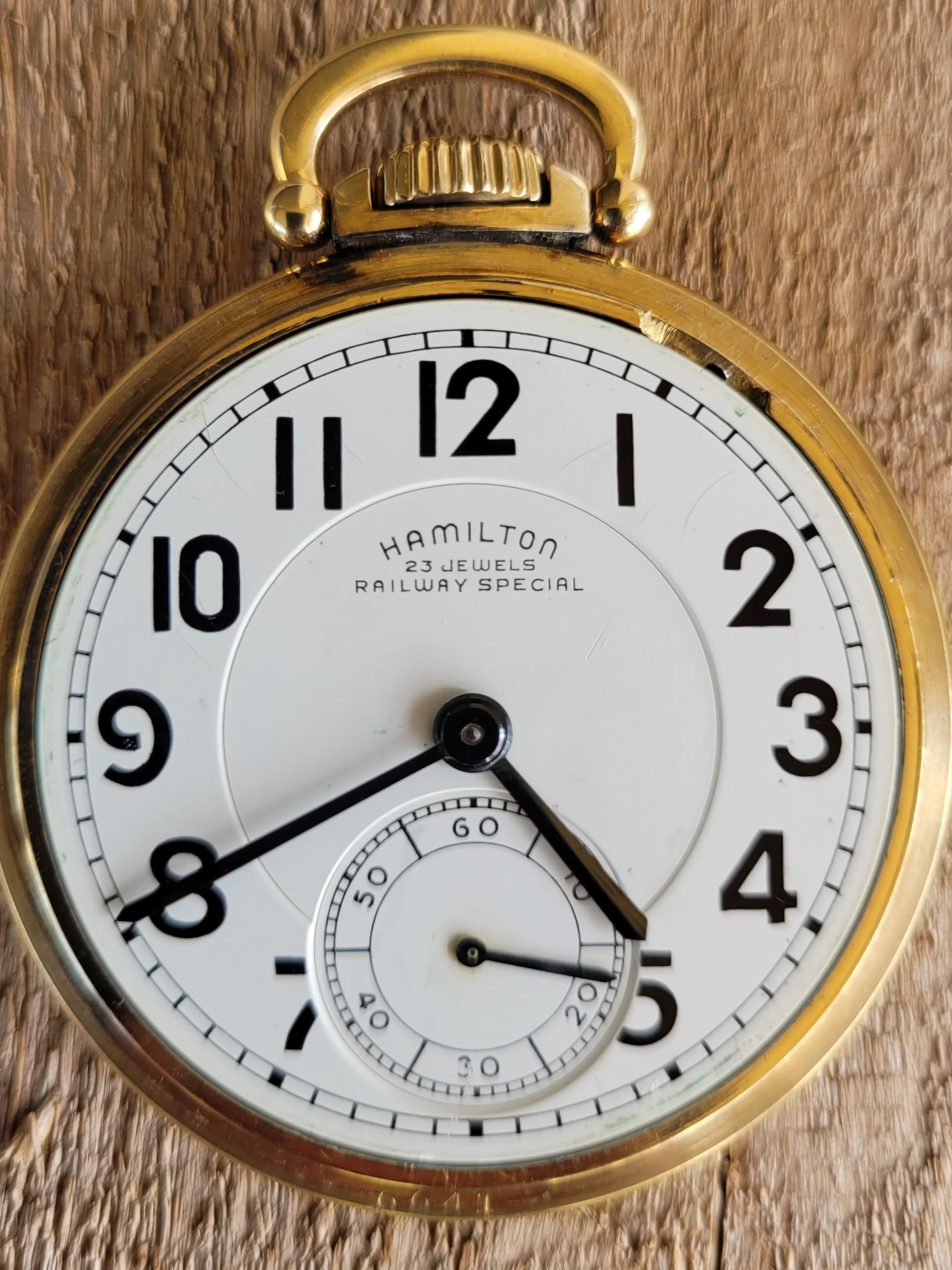 Earlier in this thread, I posted a picture of my Hamilton 950B which has had a double sunk vitreous enamel dial fitted to it. It came to me with a melamine dial which was factory original. When the vitreous enamel dial became available, I liked it better. I have saved the original melamine dial. I am showing my Hamilton 950B with the vitreous enamel dial again, along with a picture of the original melamine dial. The 950B posted by @Waltesefalcon sure appears to me to have a vitreous enamel dial, not melamine. You sure it is melamine?