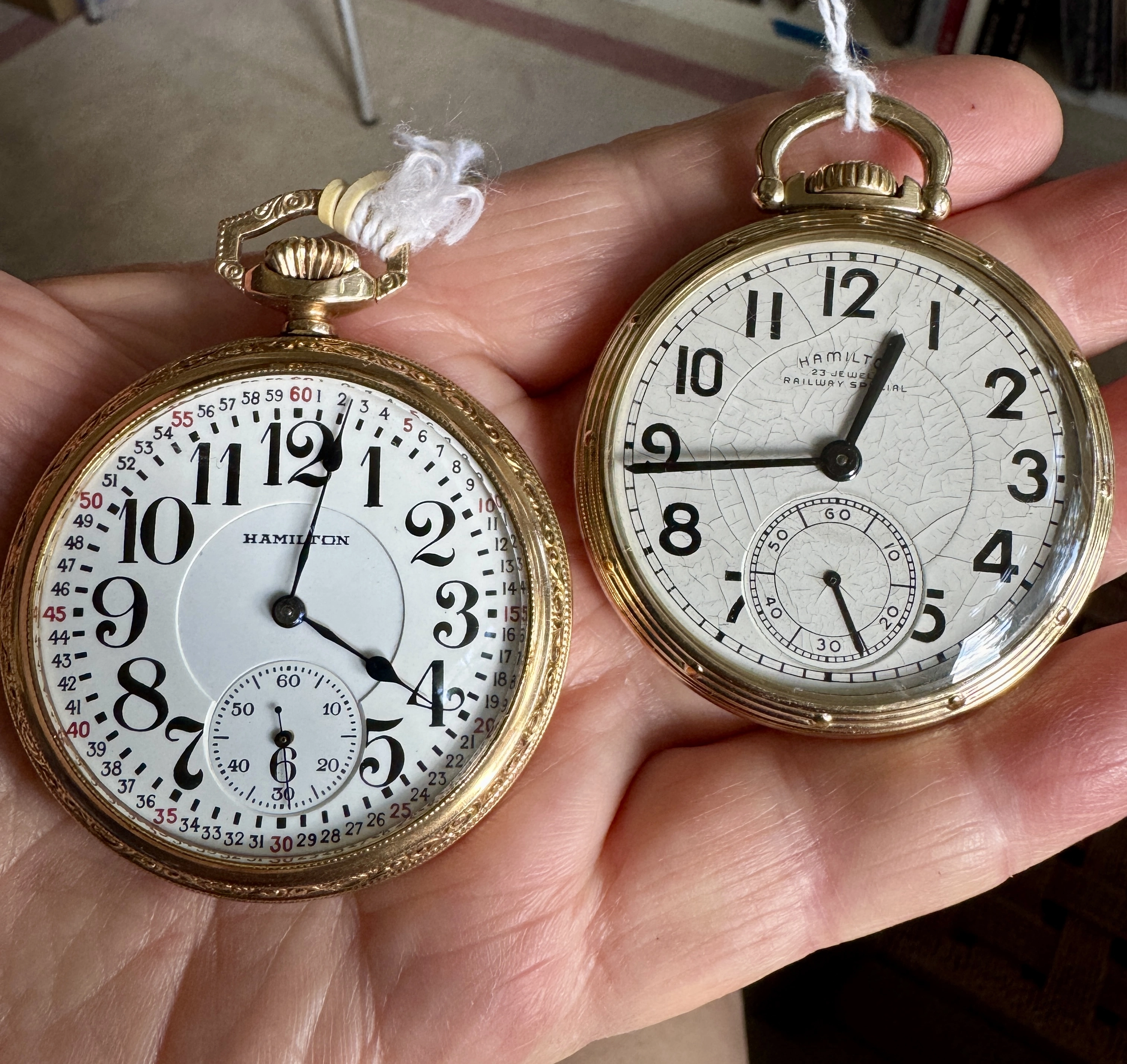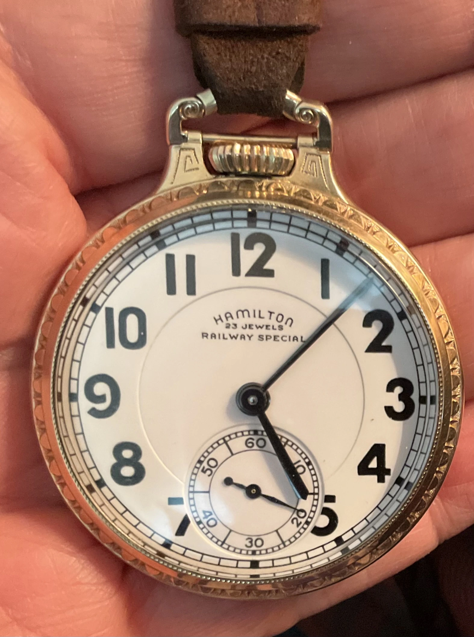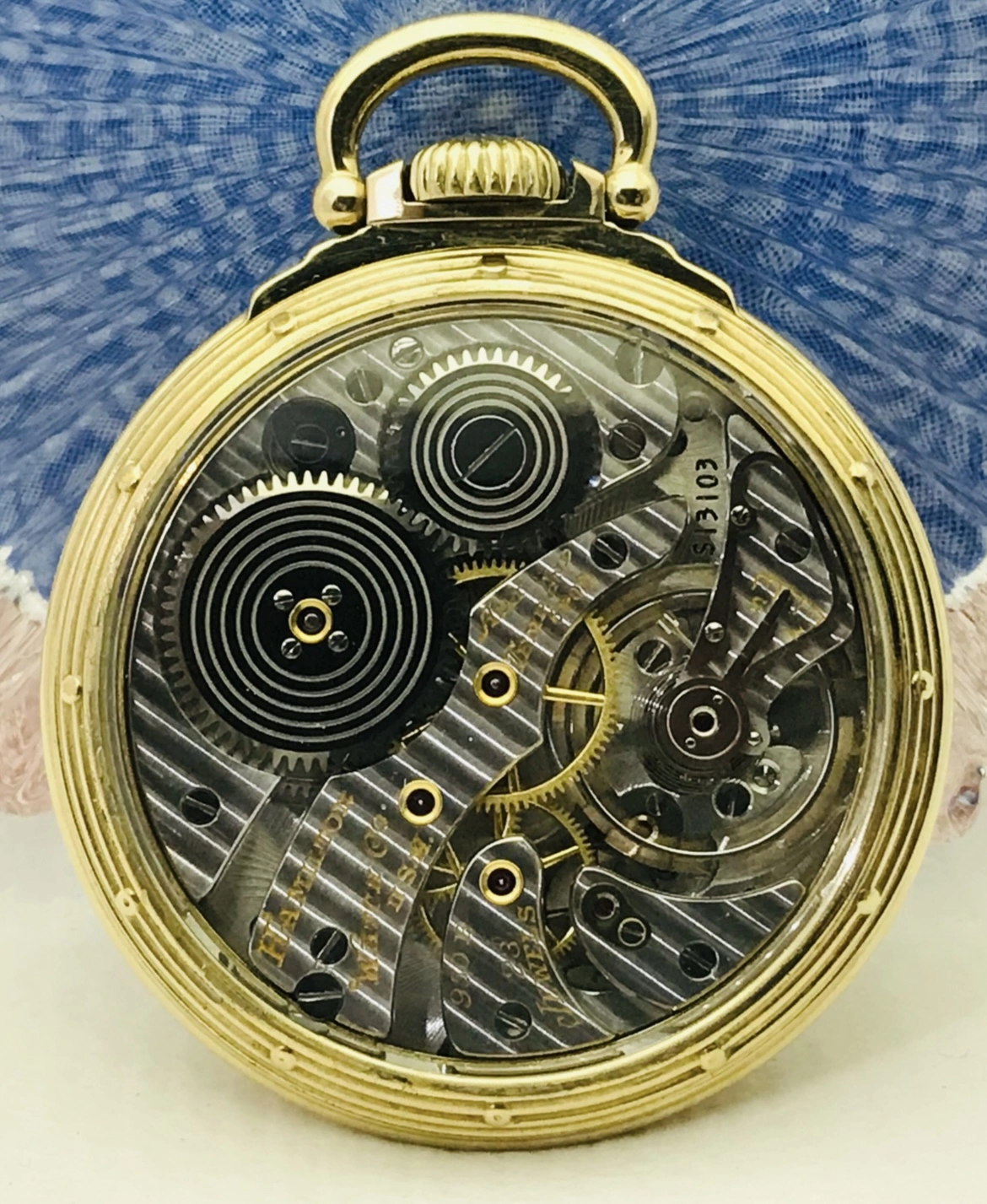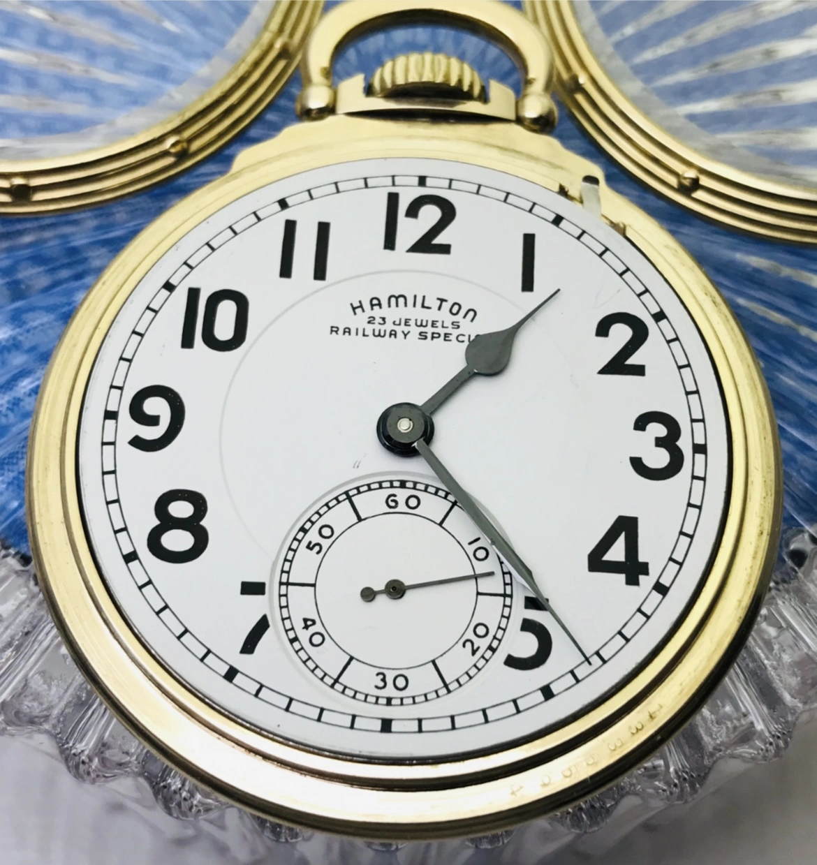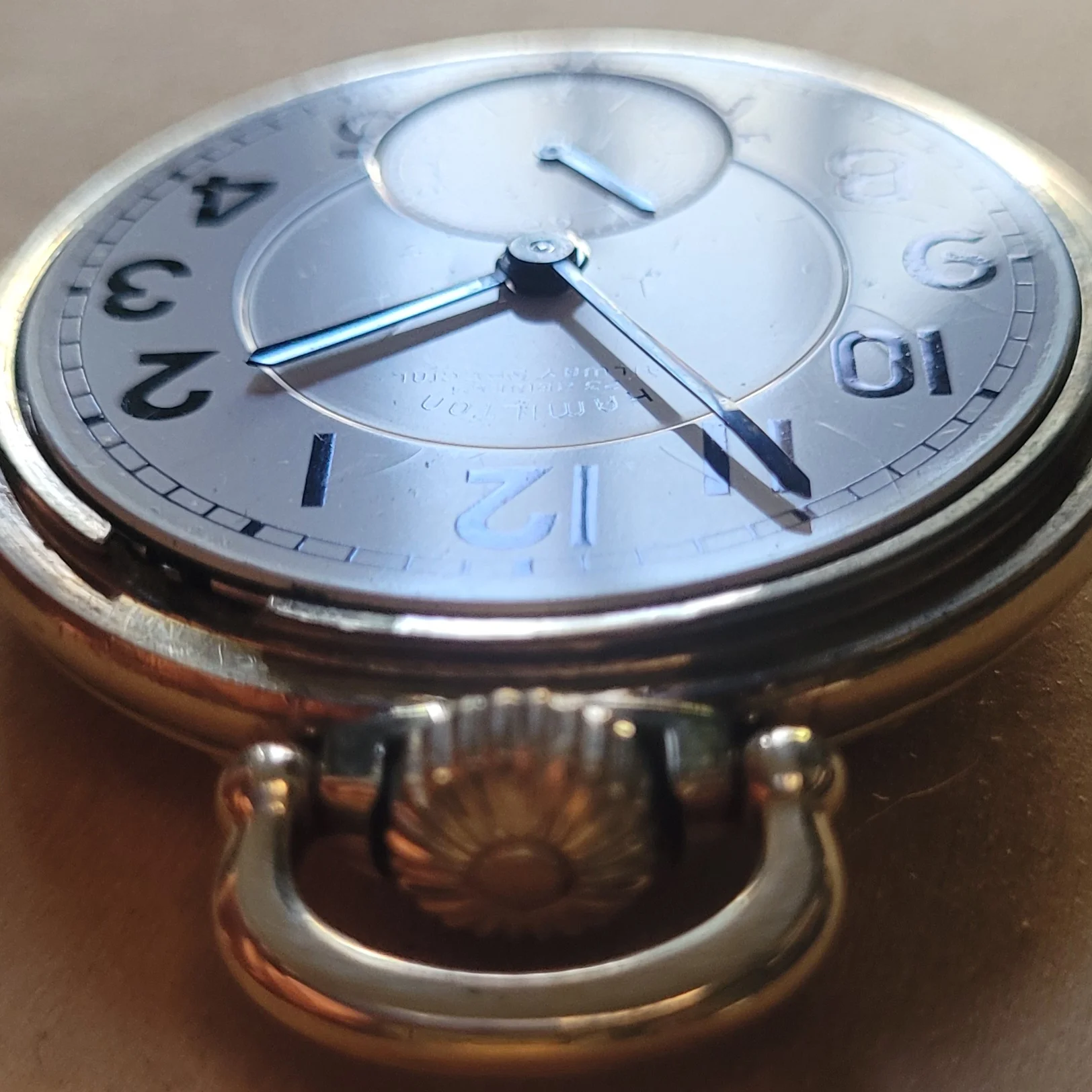 Earlier in this thread, I posted a picture of my Hamilton 950B which has had a double sunk vitreous enamel dial fitted to it. It came to me with a melamine dial which was factory original. When the vitreous enamel dial became available, I liked it better. I have saved the original melamine dial. I am showing my Hamilton 950B with the vitreous enamel dial again, along with a picture of the original melamine dial. The 950B posted by @Waltesefalcon sure appears to me to have a vitreous enamel dial, not melamine. You sure it is melamine?