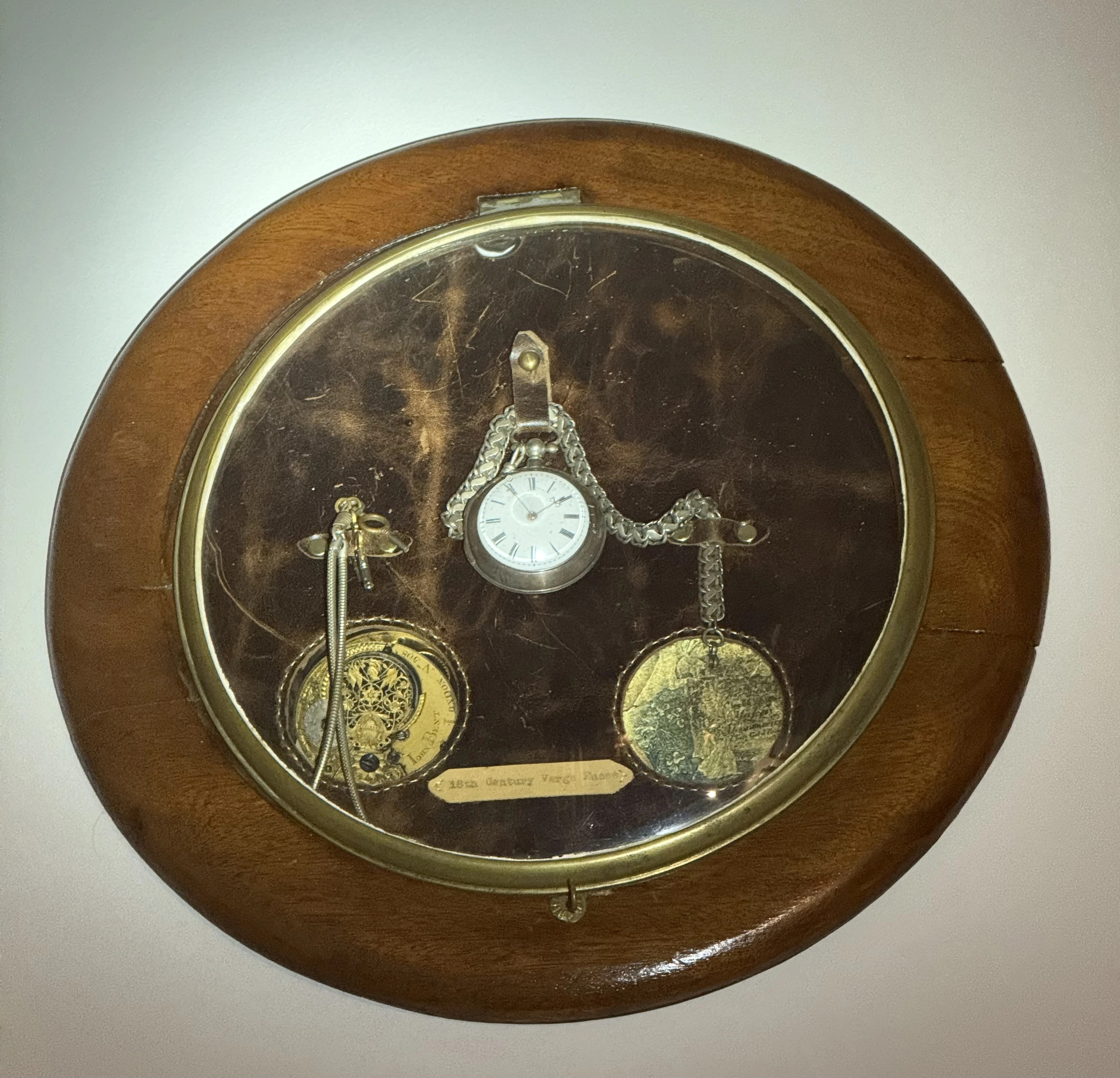 The pocketwatchdatabasebase site calls this regulator a “Ball” regulator. Not the same as the Goldthwait regulator used on the grade 936, 940, all the way to grade 946. Seems it was added to the base Hamilton movement that was modified when the movement got to the Ball Watch Co. in Cleveland. Try as I may, I am unable to translate the lettering on the bezel of that display case. Indeed, a movement worthy of being shown in a display case.