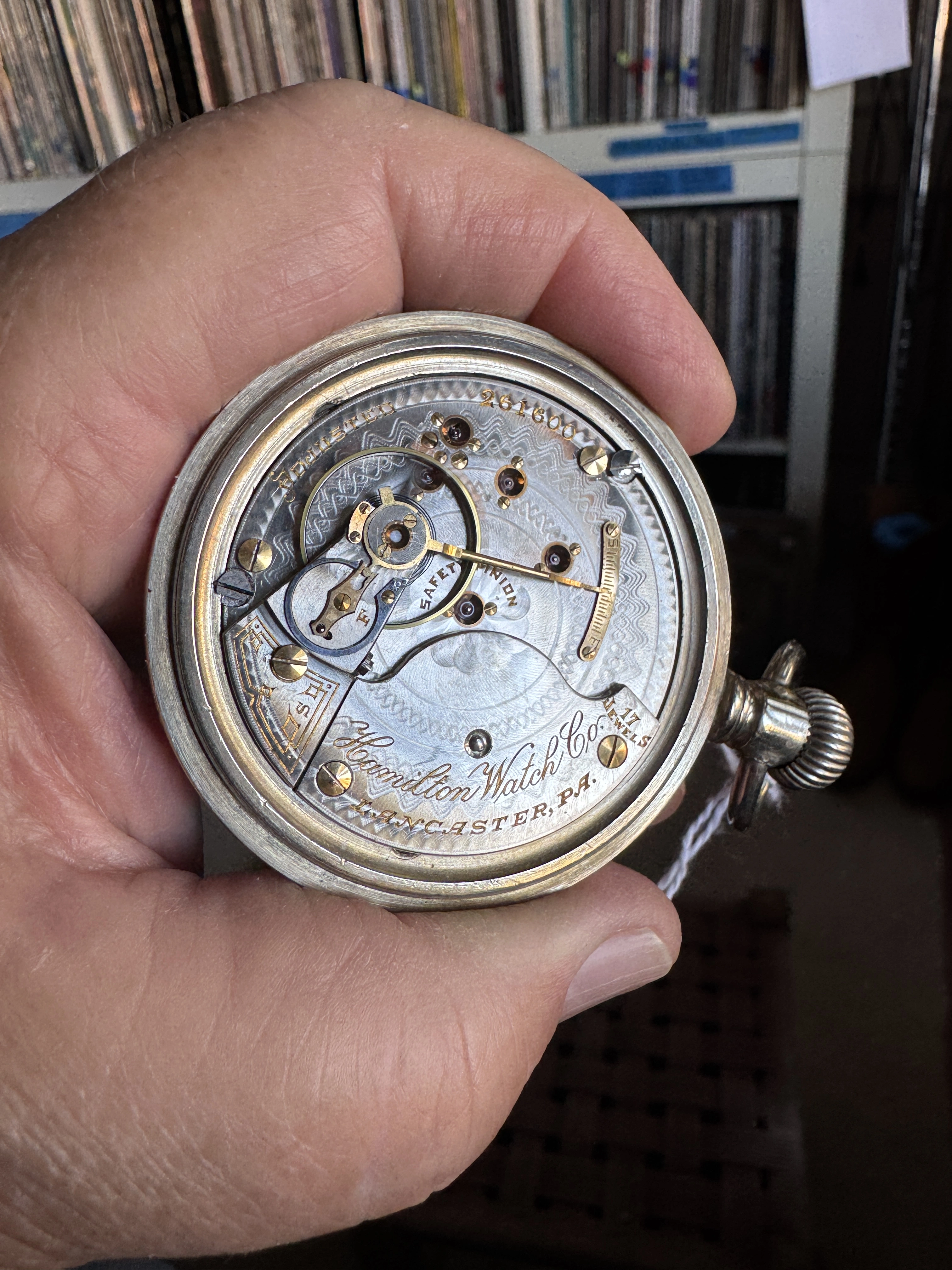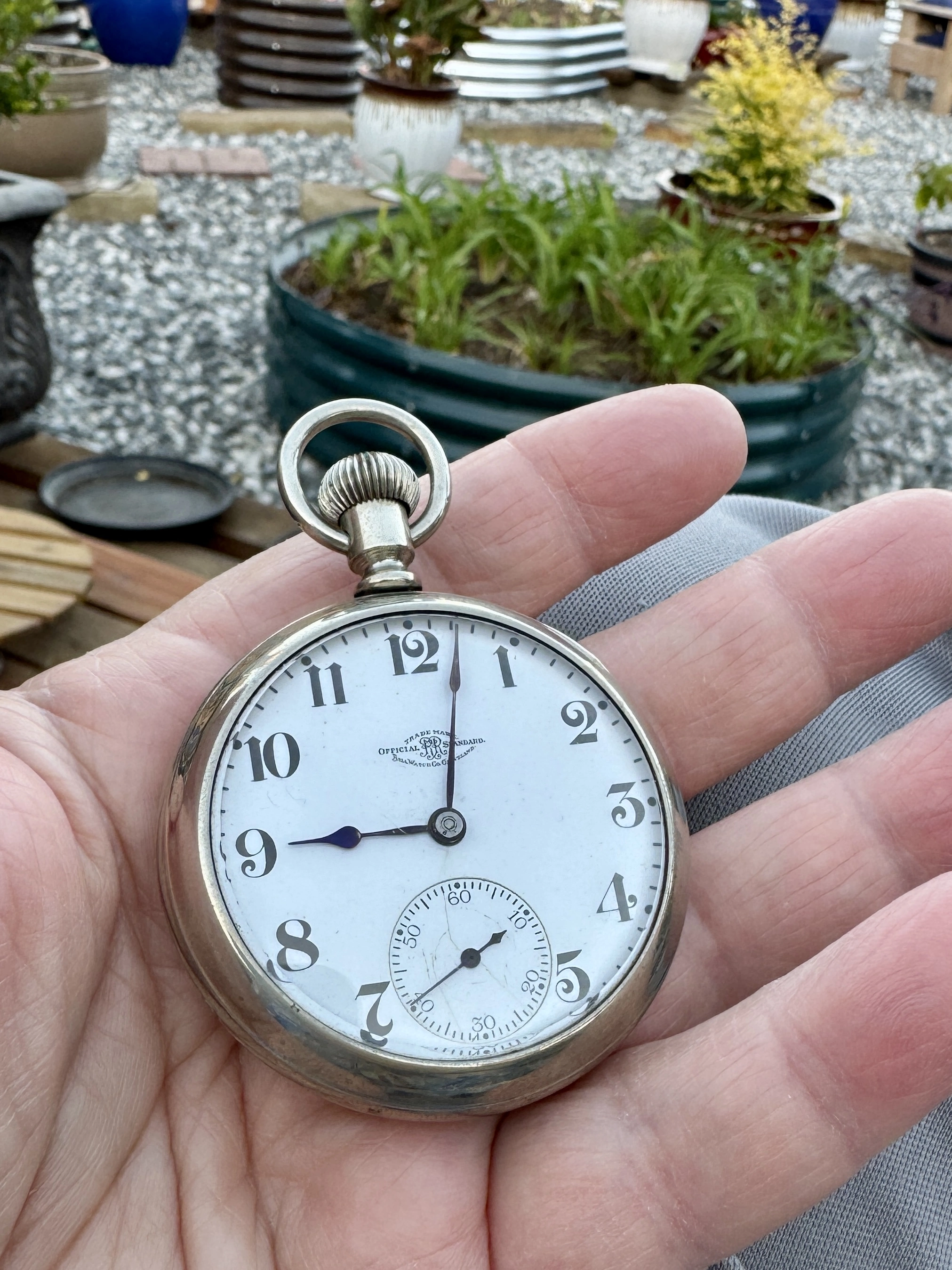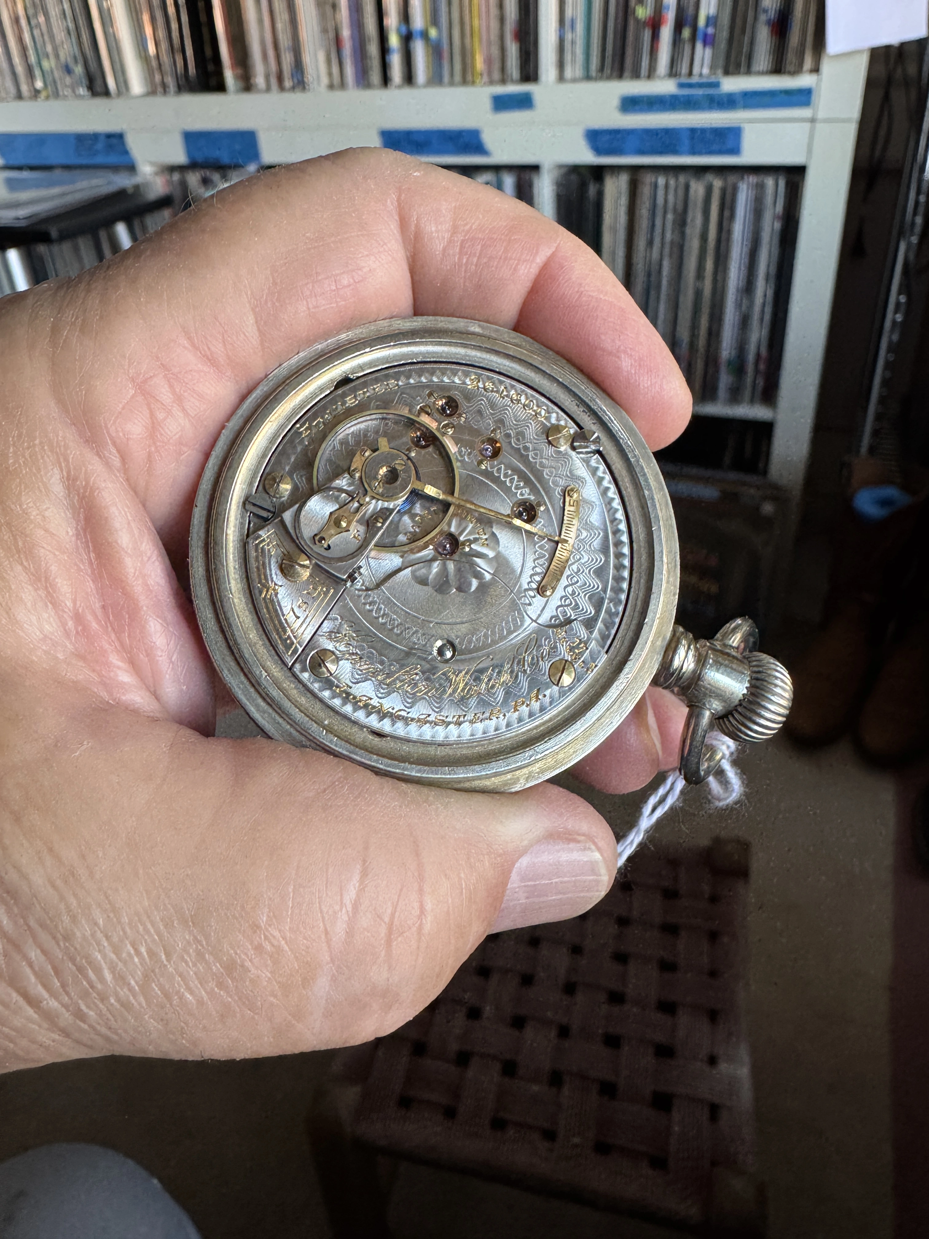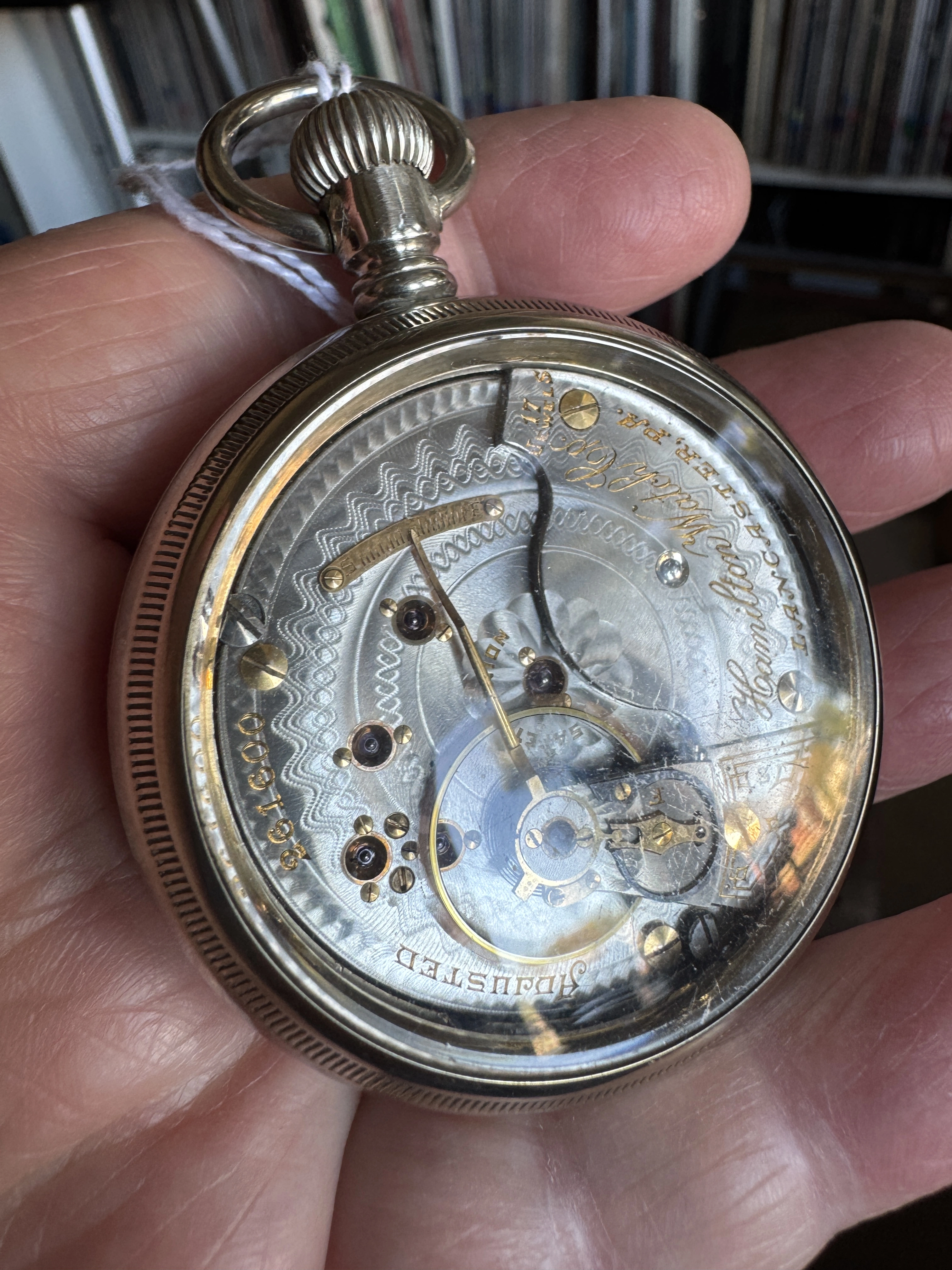 This one again! My 1892 CPR Waltham, 18-size railroad pocket watch. Set to the second 25 days ago, and hasn’t stopped since. Re-set minutes and hours only to MST at the time change, but seconds not disturbed. After the first 7 days, it had gained 20 seconds, but not re-set. Still 20 seconds fast after 14 days, so no change in the rate. Same goes after 21 days, no variation. On the 22 day, I forgot to wind it. On last Friday morning (the 23 day), I remembered to wind it. It hadn’t stopped but was 7 seconds slow. Today (the 25th day), still seven seconds slow! It is 108 years old and continues to amaze me! Freshly serviced and new mainspring in mid October.