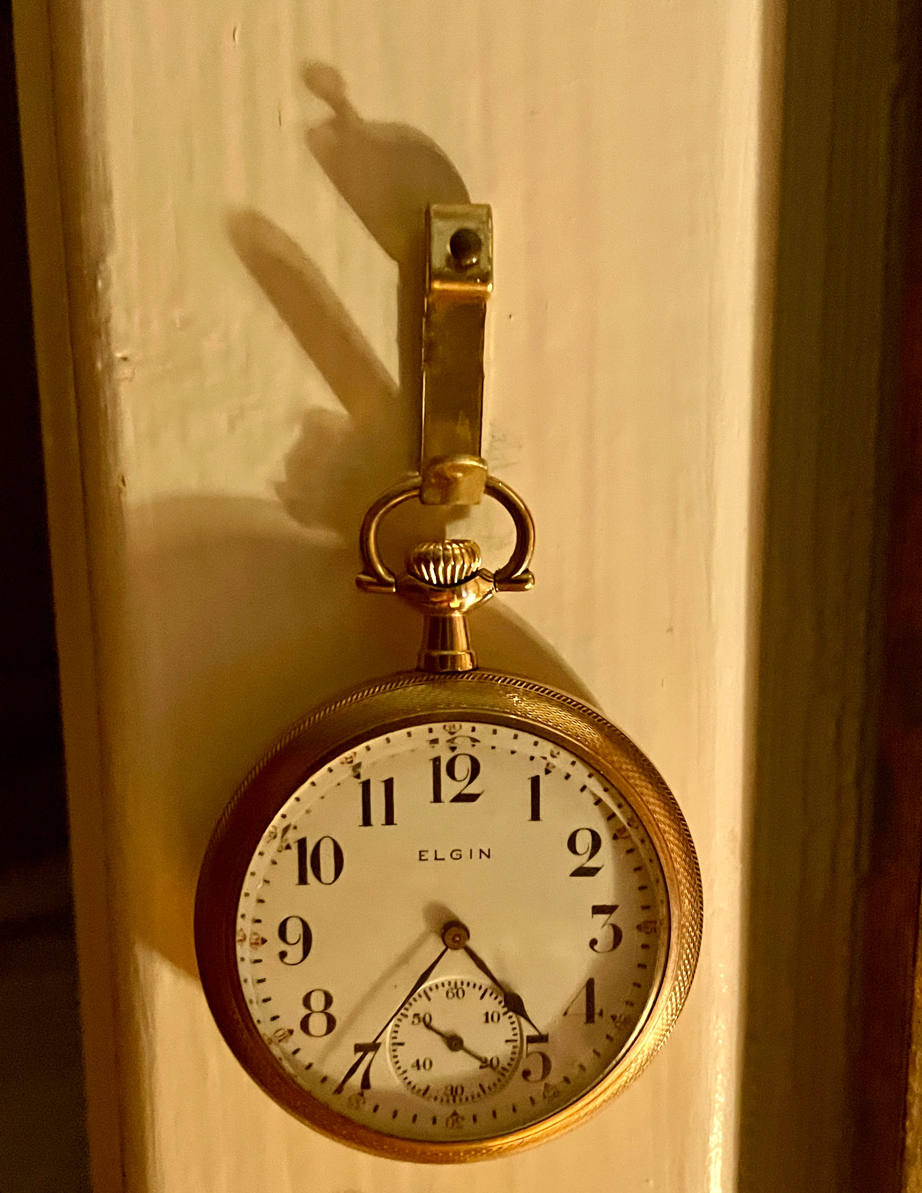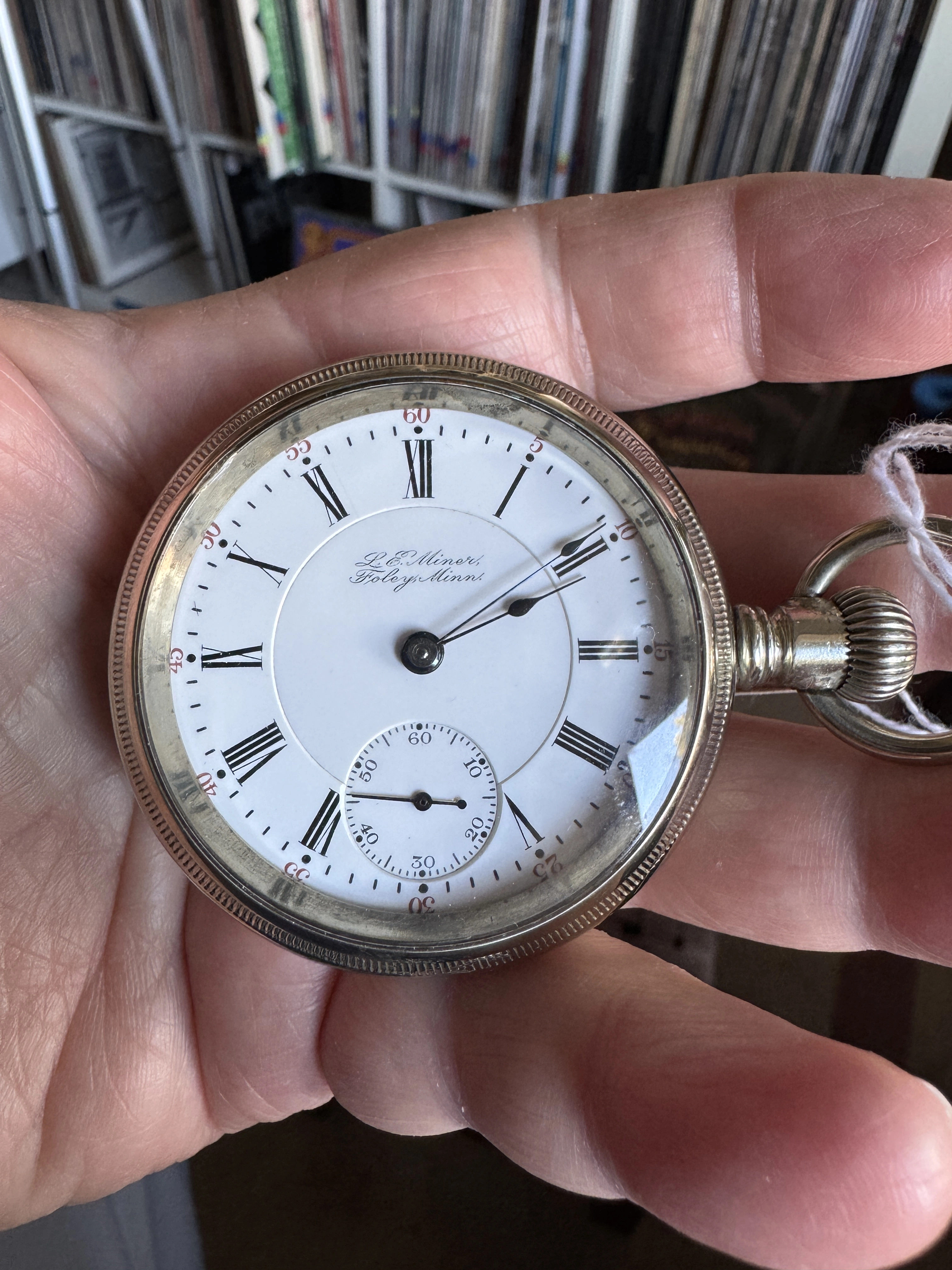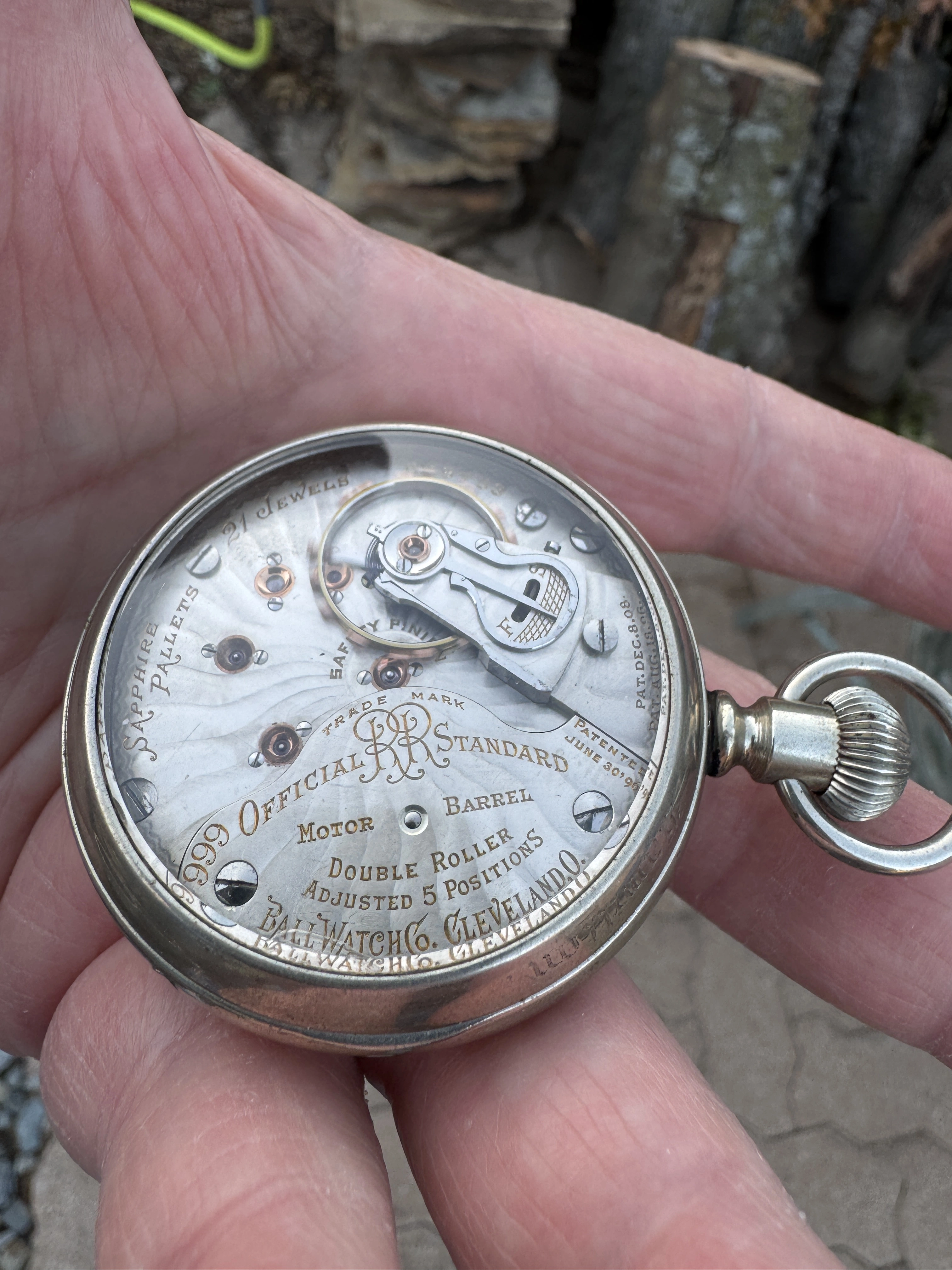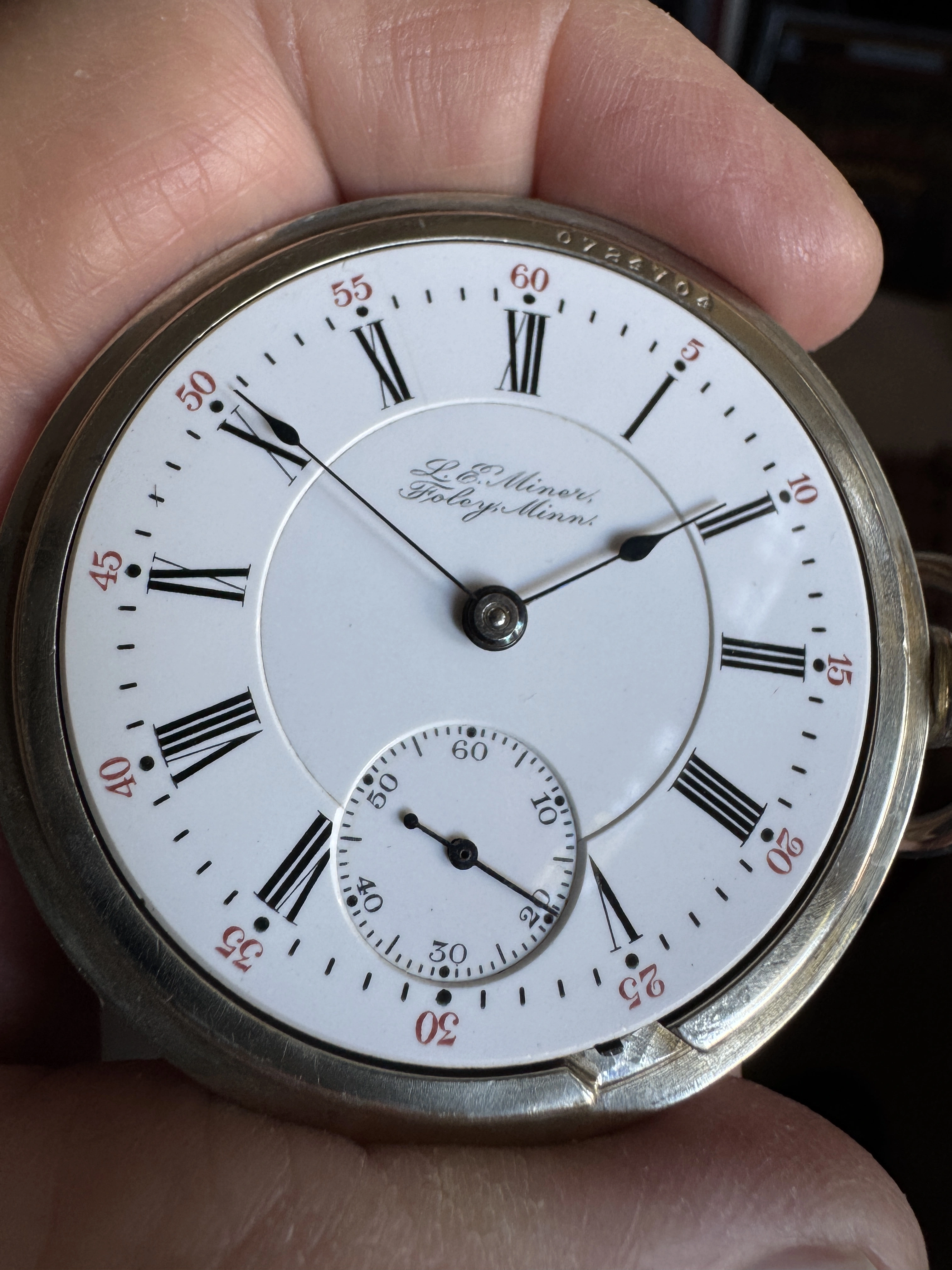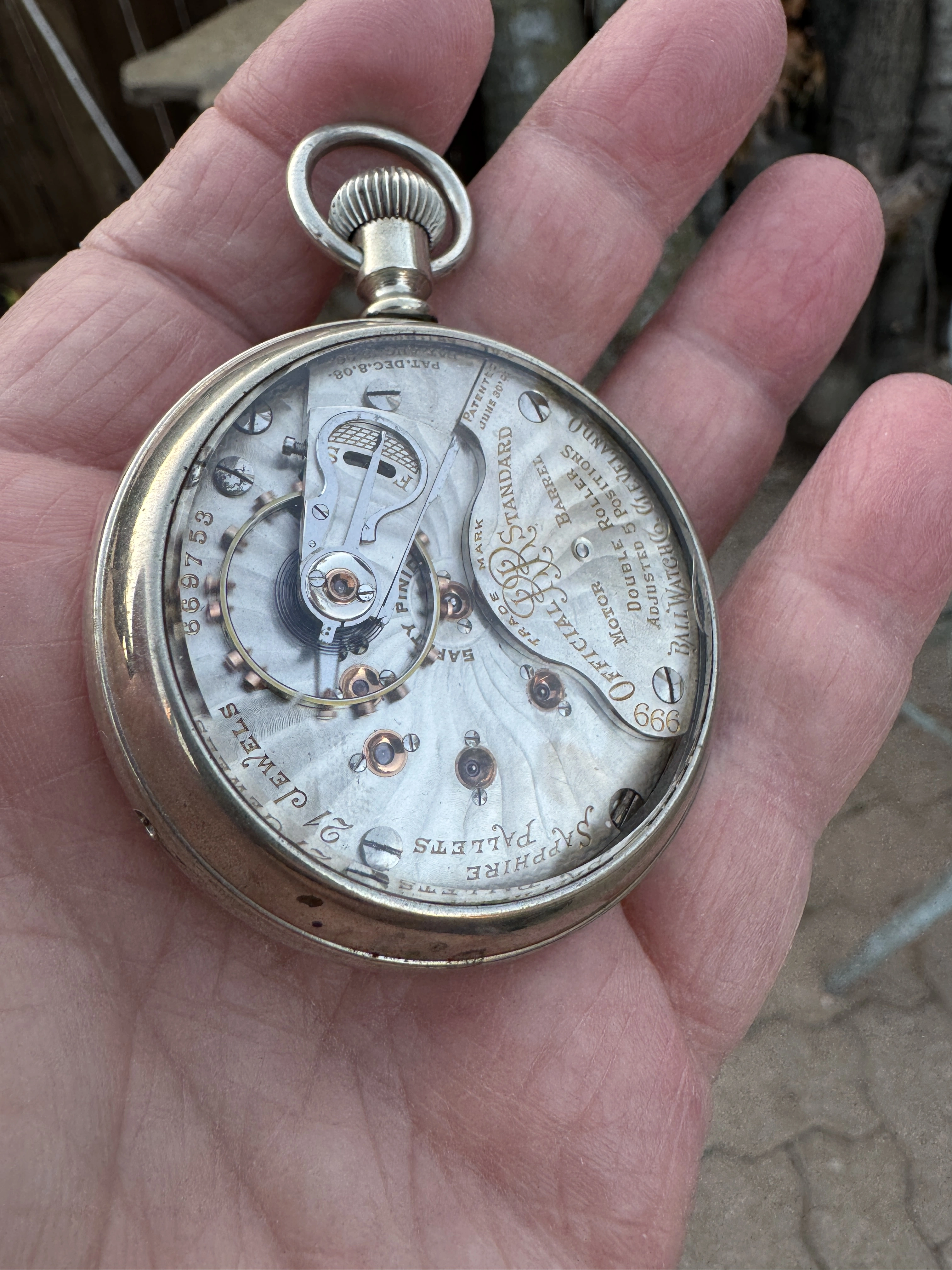 This one again! My 1892 CPR Waltham, 18-size railroad pocket watch. Set to the second 25 days ago, and hasn’t stopped since. Re-set minutes and hours only to MST at the time change, but seconds not disturbed. After the first 7 days, it had gained 20 seconds, but not re-set. Still 20 seconds fast after 14 days, so no change in the rate. Same goes after 21 days, no variation. On the 22 day, I forgot to wind it. On last Friday morning (the 23 day), I remembered to wind it. It hadn’t stopped but was 7 seconds slow. Today (the 25th day), still seven seconds slow! It is 108 years old and continues to amaze me! Freshly serviced and new mainspring in mid October.