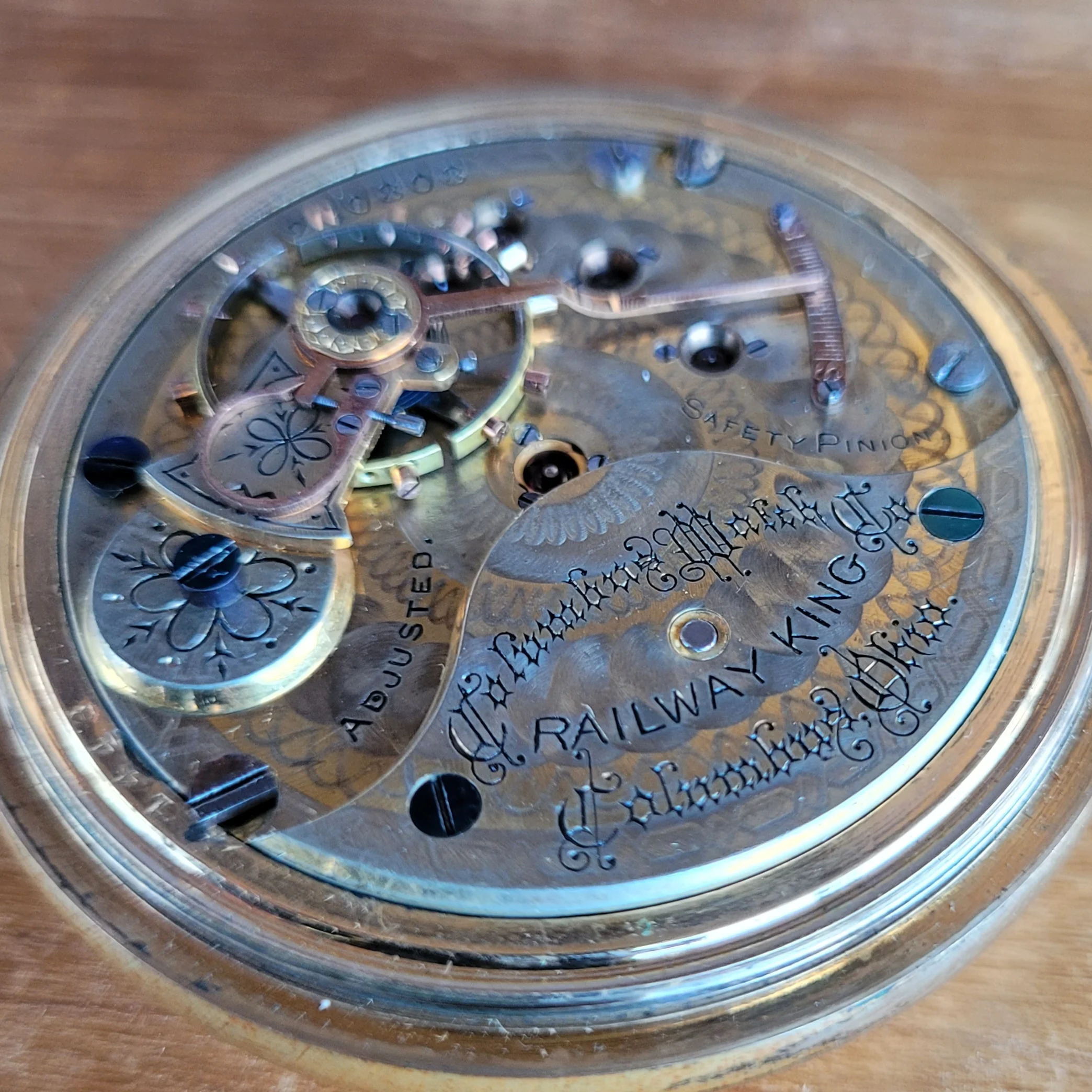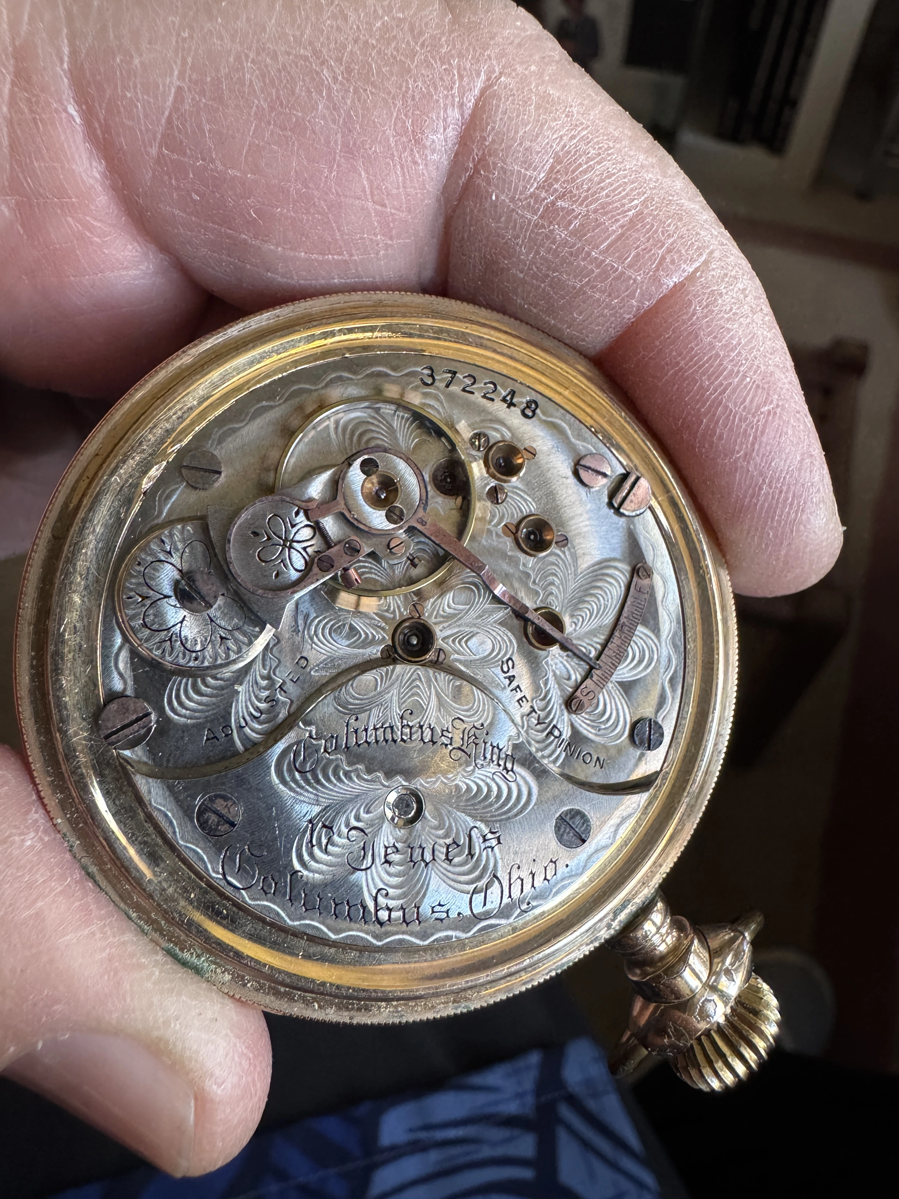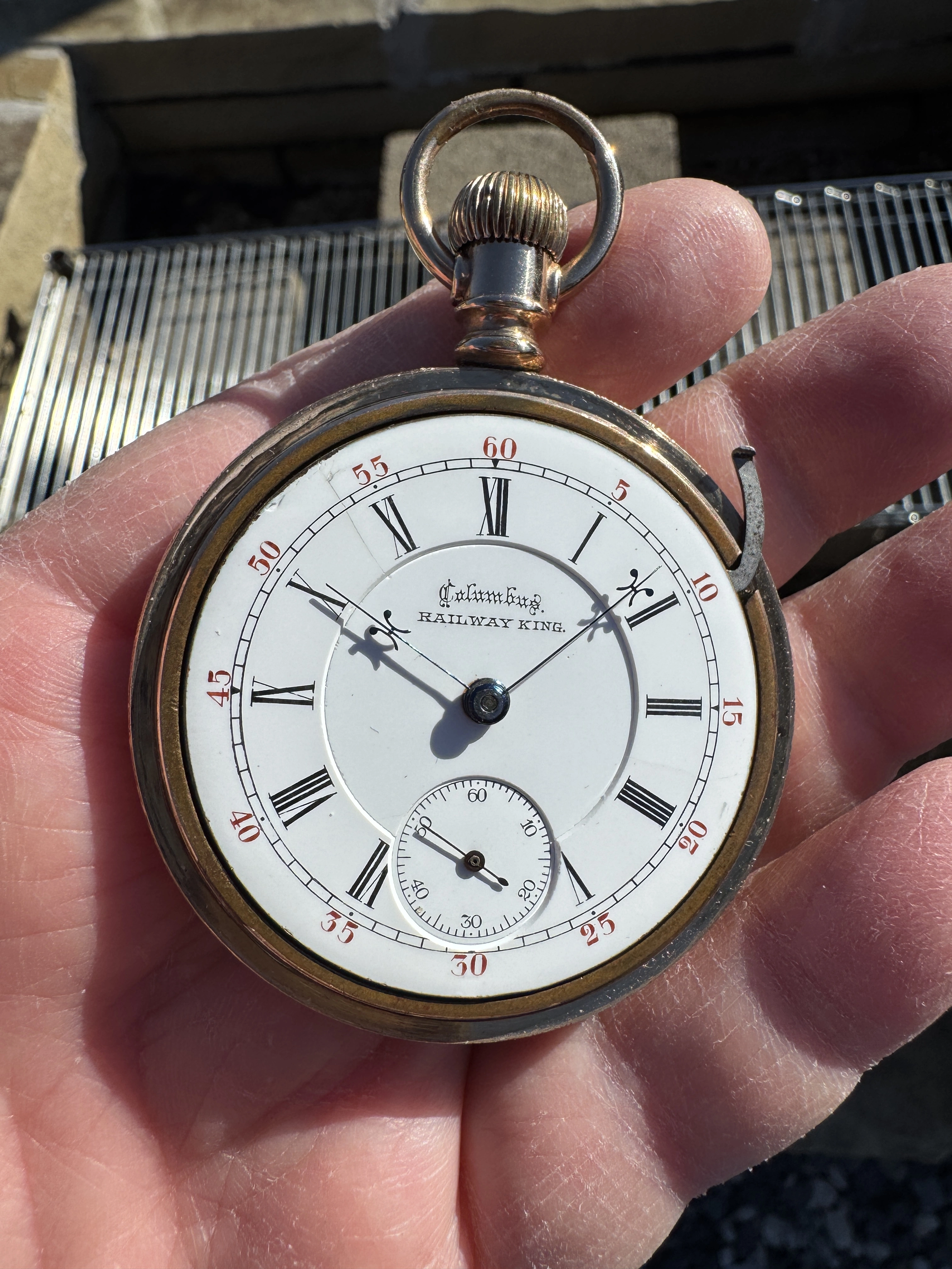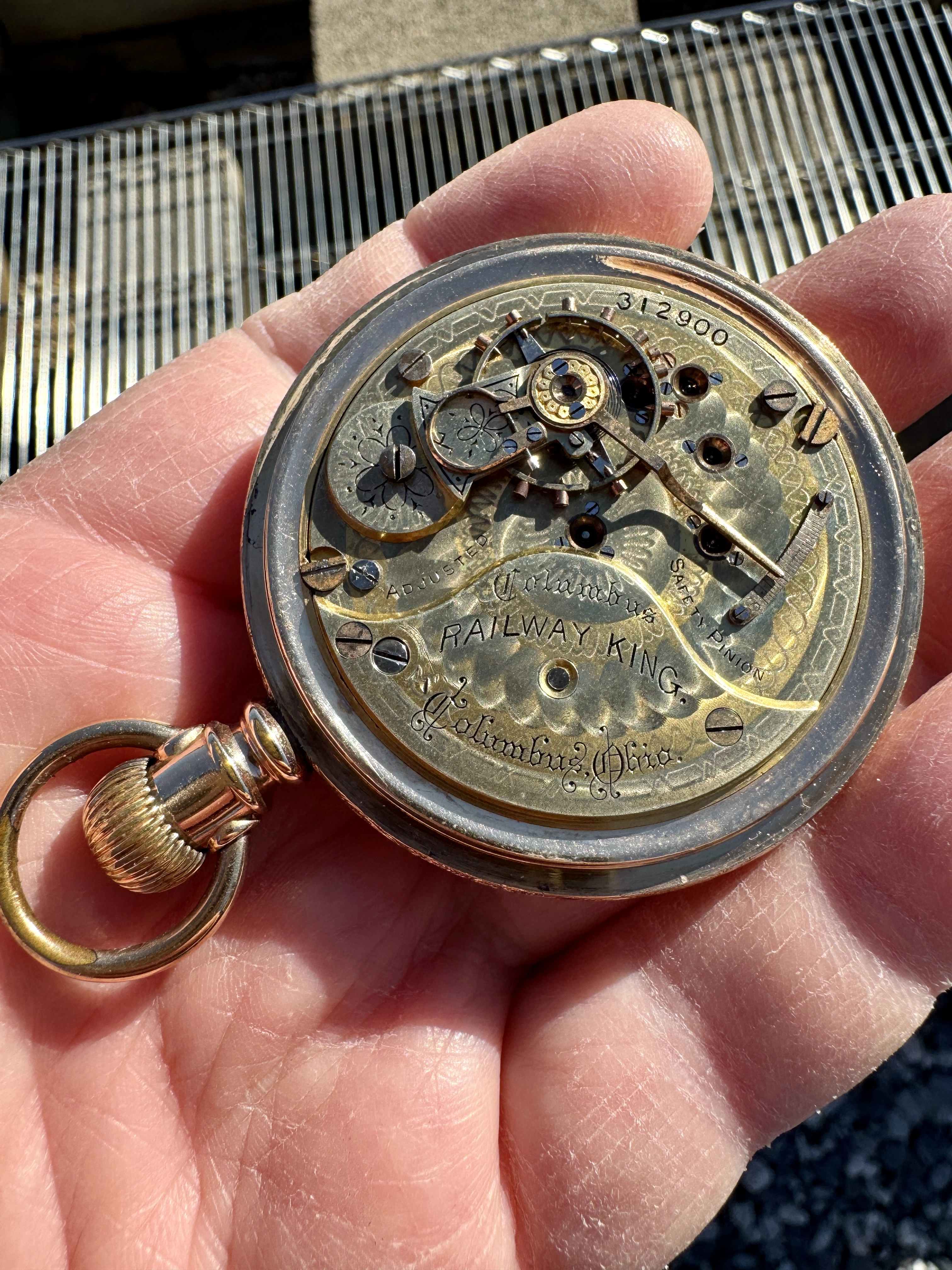 ·I spent way too much money on this one ($410), but the choo choo dial did me in. This is my new Columbus 16J Model 2 Railway King, circa 1892. The dial is pretty nice, there are a couple of hairlines between the 7 and 8 and between the 10 and 11, but other than that it looks good. It arrived in an old Dueber gold filled open face case, but I am pretty sure I have a 4oz coin silver hunting case squirreled away someplace that it will look rather handsome in. Honestly, the case is the only part of this watch that I don't love. The dial, the fleur de lis hands, the two tone damaskeening on the mov't with blued screws and gold accents on the regulator, it's all great.