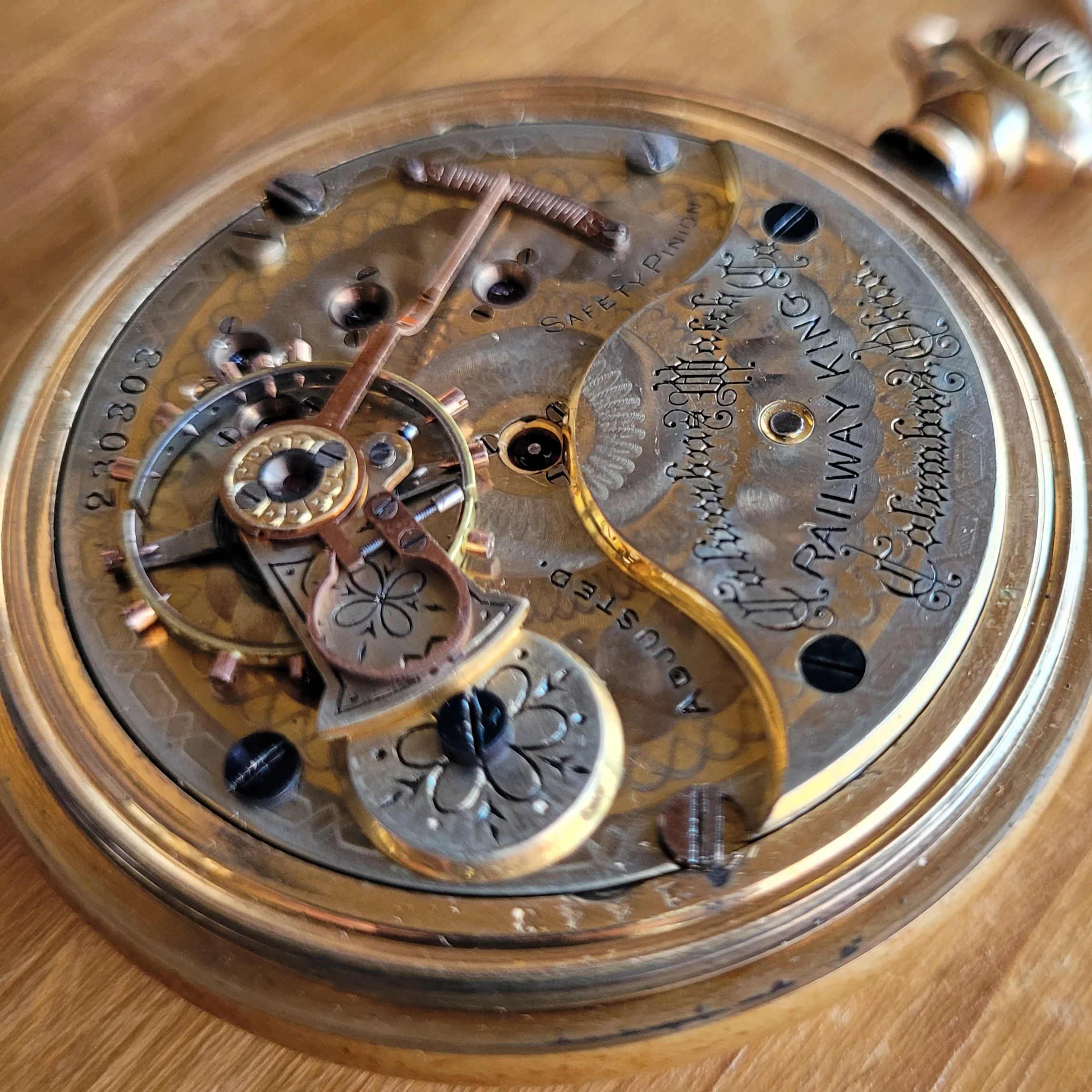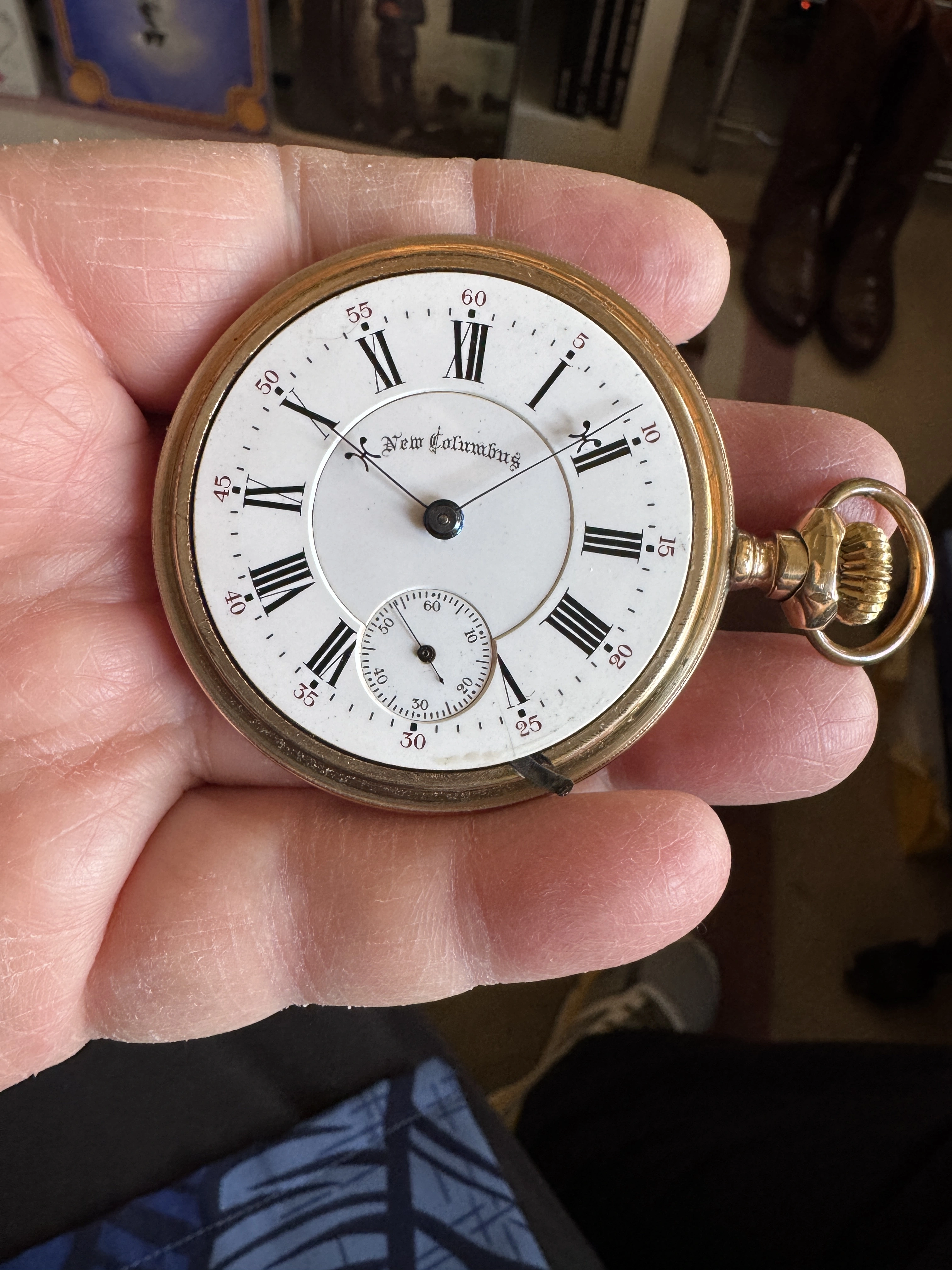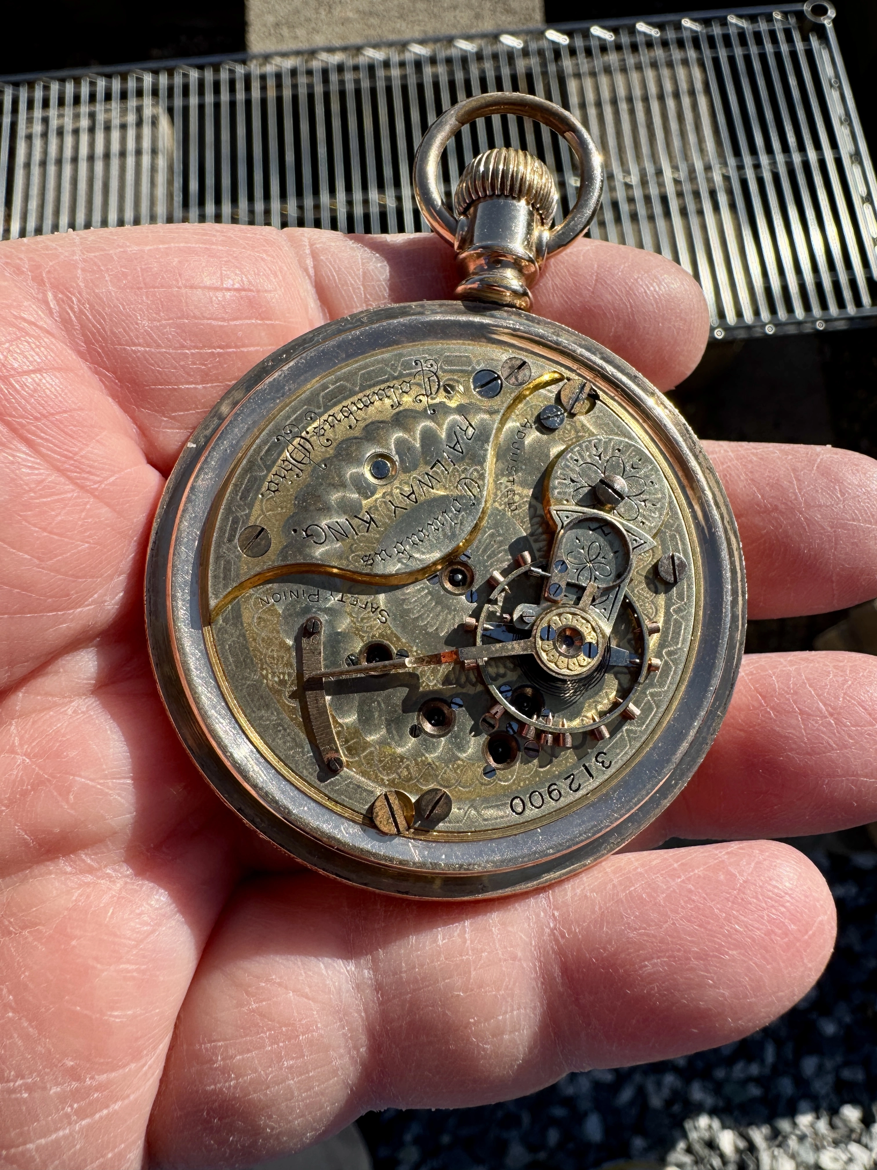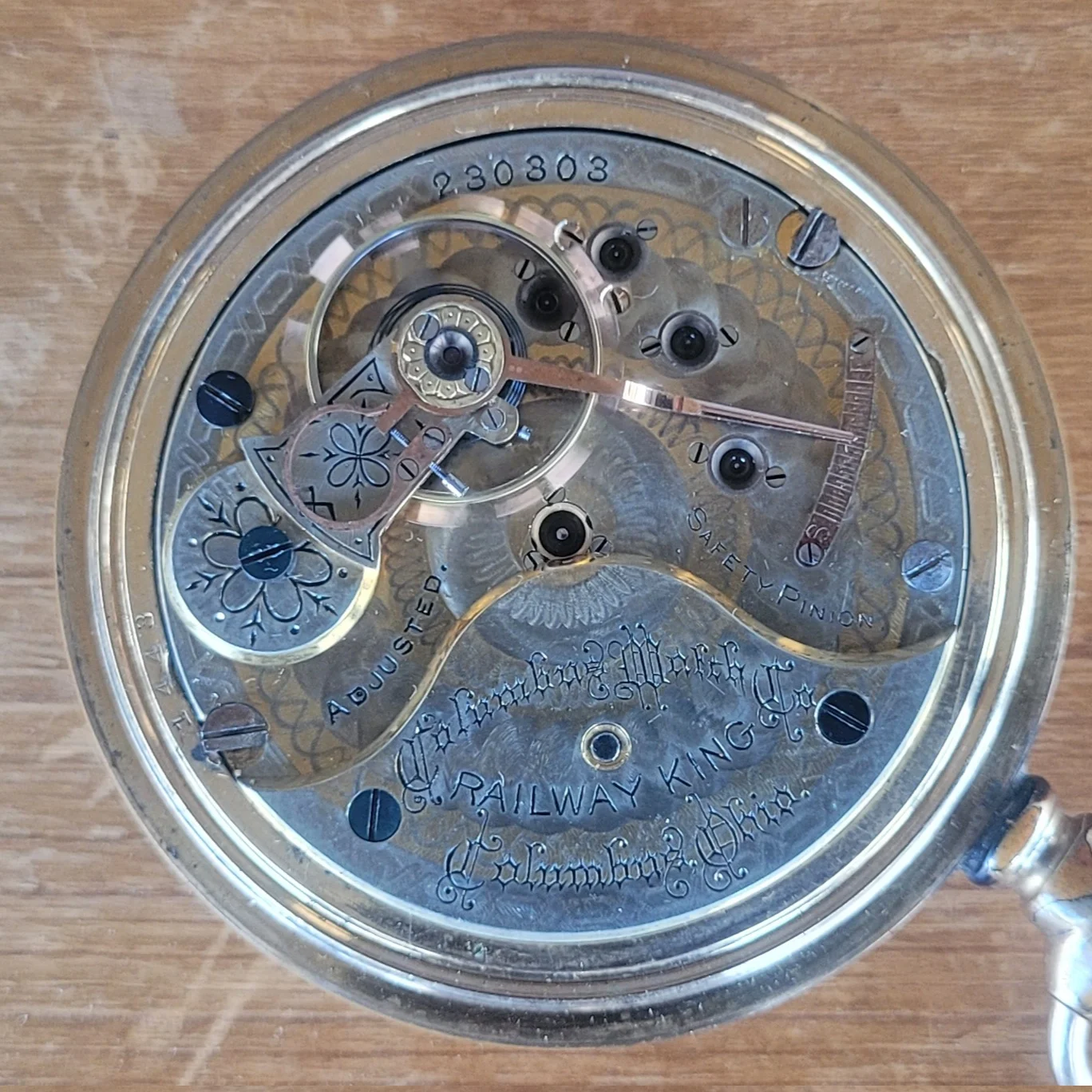 ·I spent way too much money on this one ($410), but the choo choo dial did me in. This is my new Columbus 16J Model 2 Railway King, circa 1892. The dial is pretty nice, there are a couple of hairlines between the 7 and 8 and between the 10 and 11, but other than that it looks good. It arrived in an old Dueber gold filled open face case, but I am pretty sure I have a 4oz coin silver hunting case squirreled away someplace that it will look rather handsome in. Honestly, the case is the only part of this watch that I don't love. The dial, the fleur de lis hands, the two tone damaskeening on the mov't with blued screws and gold accents on the regulator, it's all great.