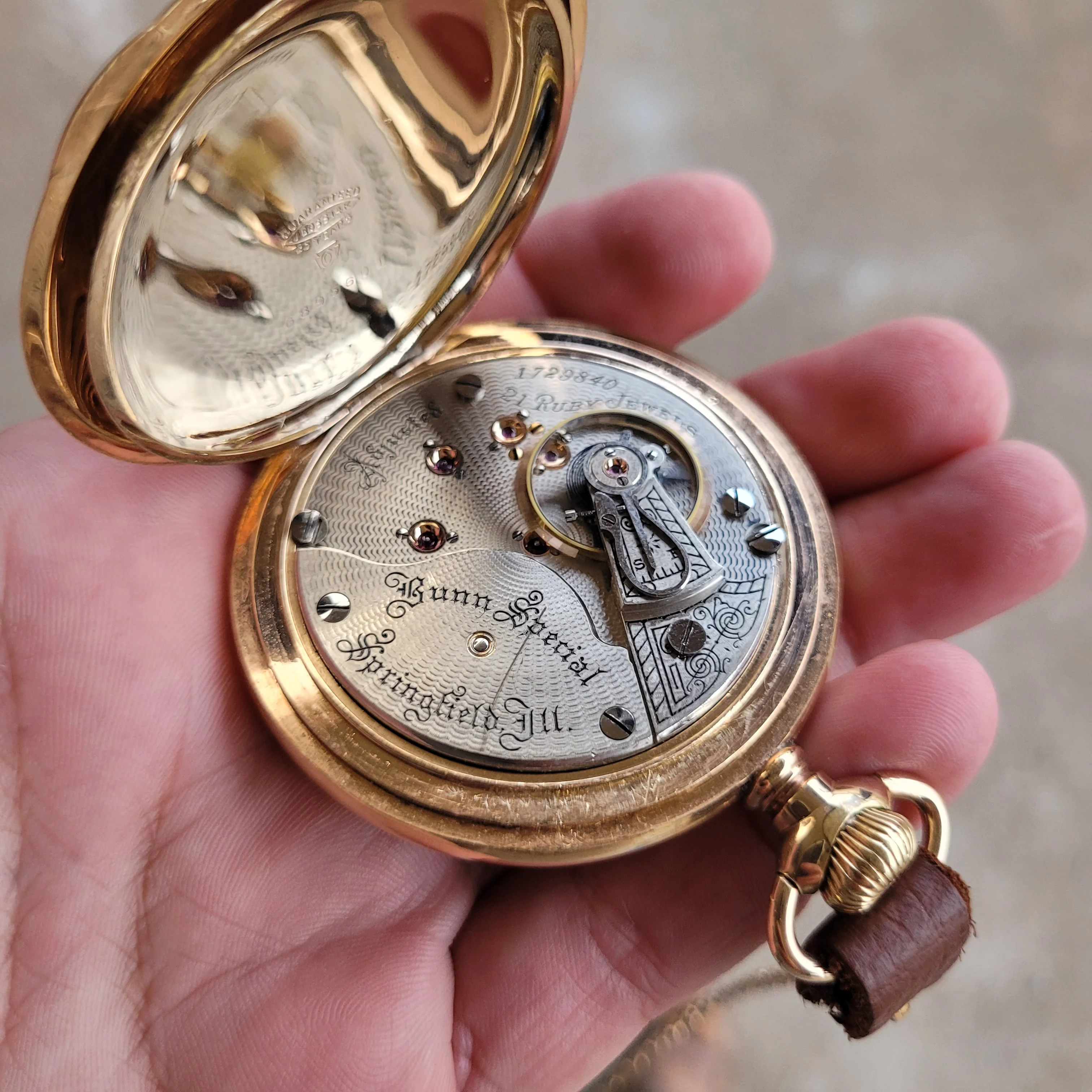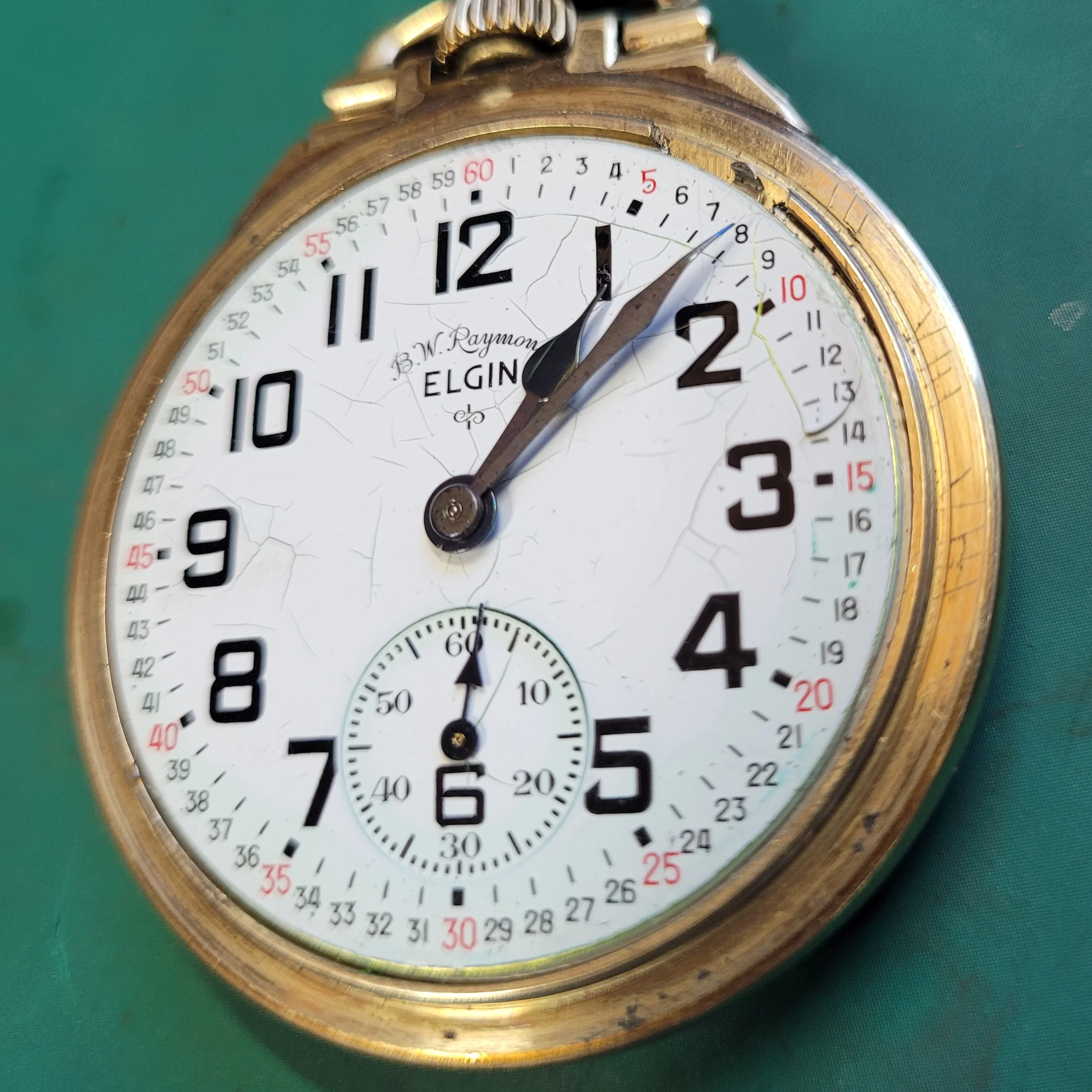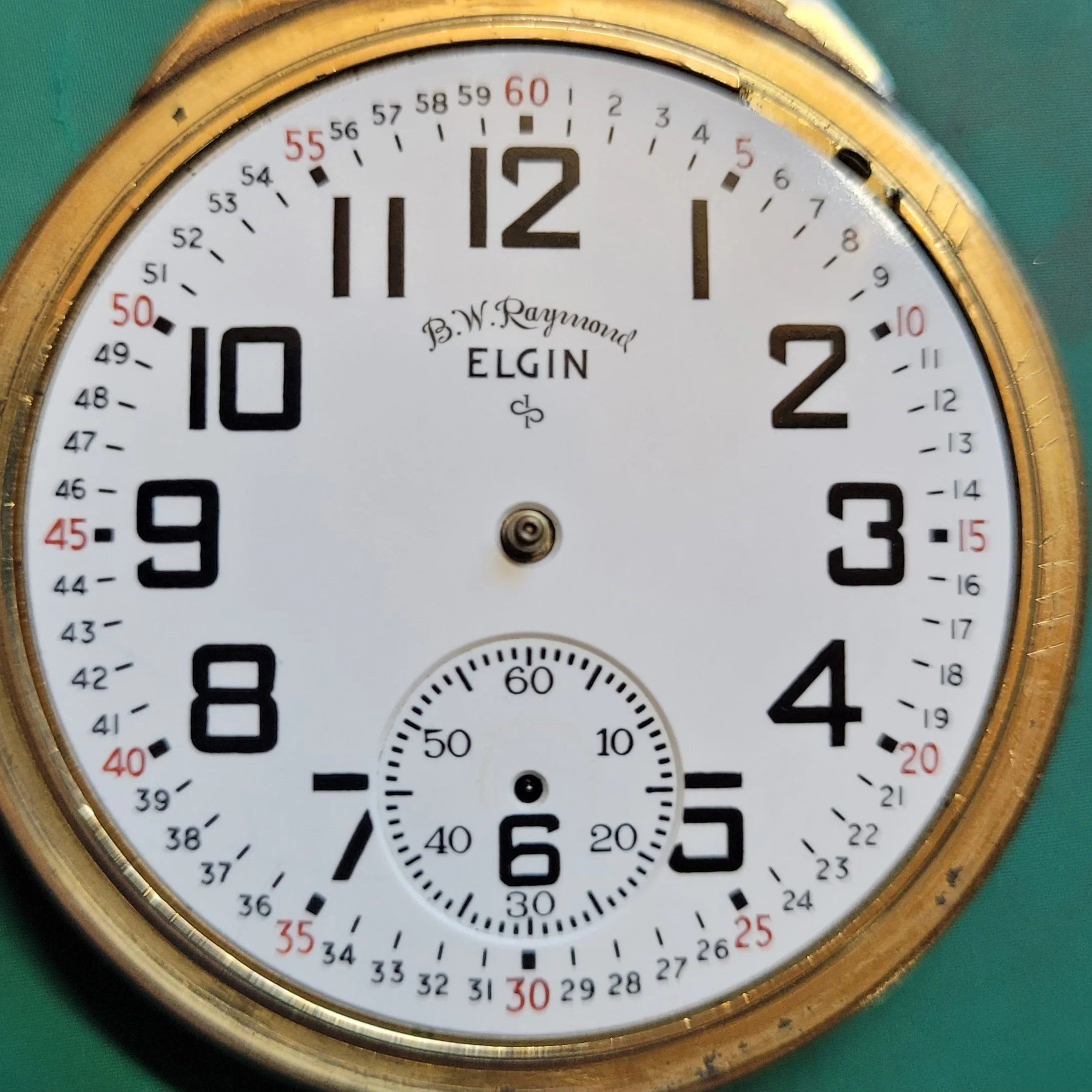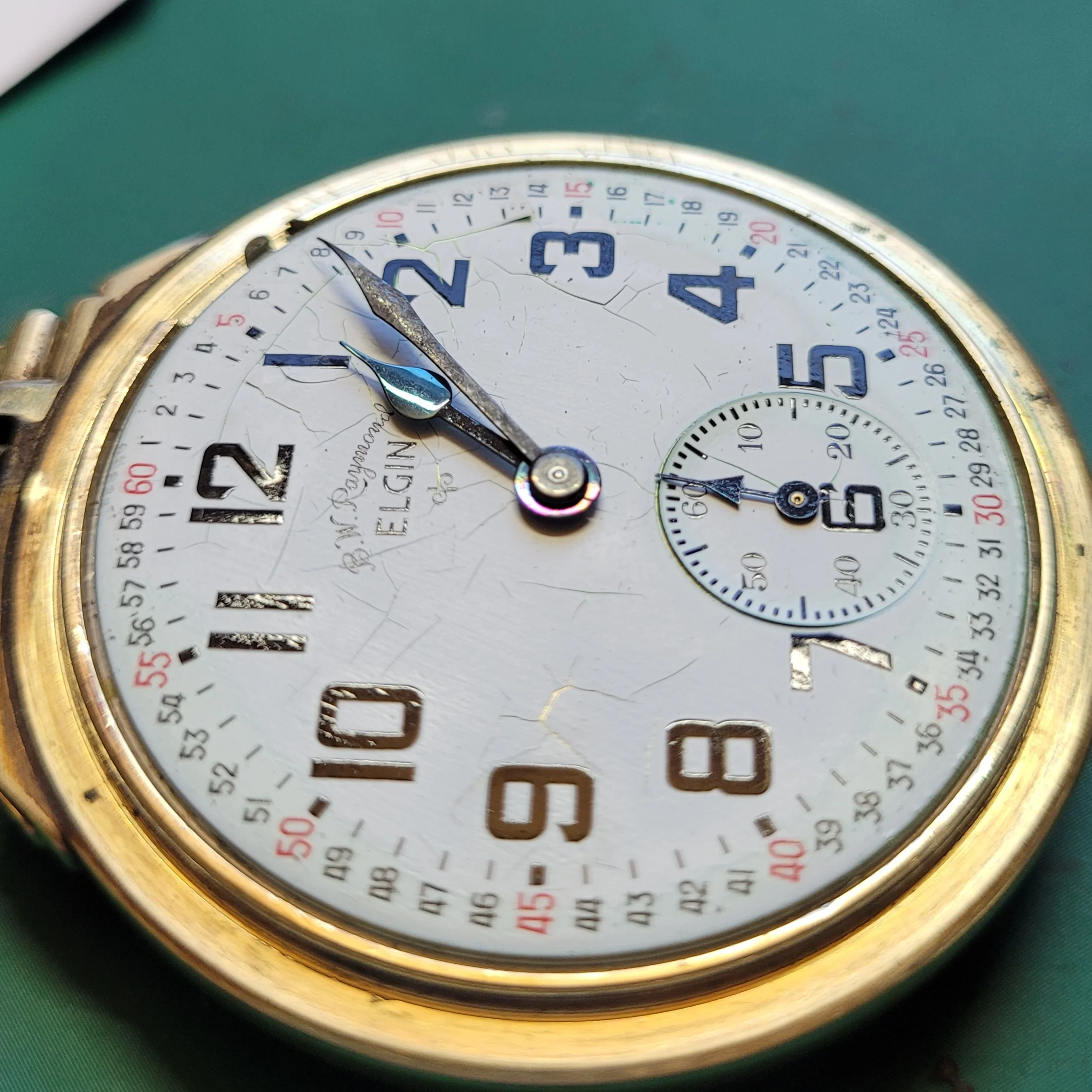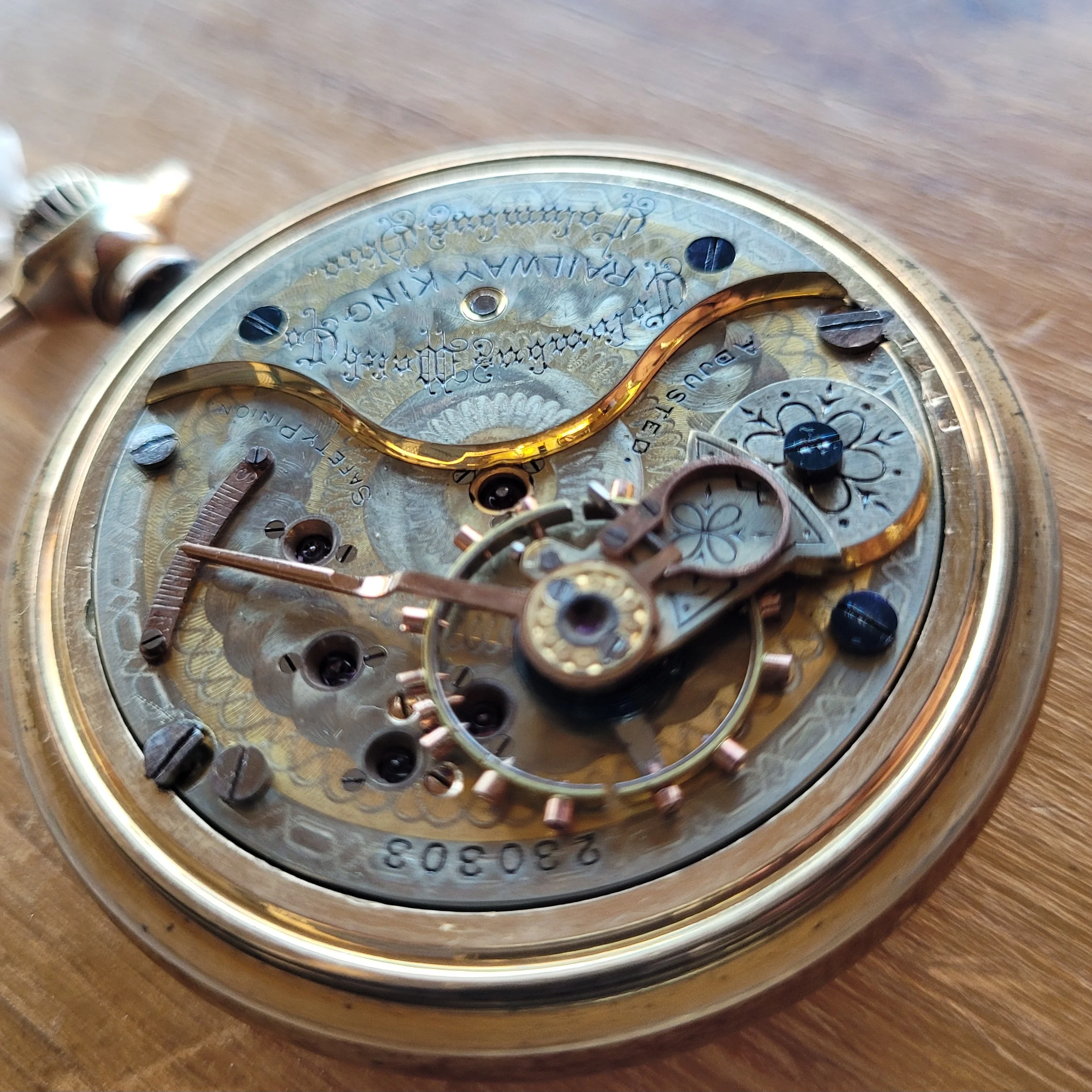 ·I spent way too much money on this one ($410), but the choo choo dial did me in. This is my new Columbus 16J Model 2 Railway King, circa 1892. The dial is pretty nice, there are a couple of hairlines between the 7 and 8 and between the 10 and 11, but other than that it looks good. It arrived in an old Dueber gold filled open face case, but I am pretty sure I have a 4oz coin silver hunting case squirreled away someplace that it will look rather handsome in. Honestly, the case is the only part of this watch that I don't love. The dial, the fleur de lis hands, the two tone damaskeening on the mov't with blued screws and gold accents on the regulator, it's all great.