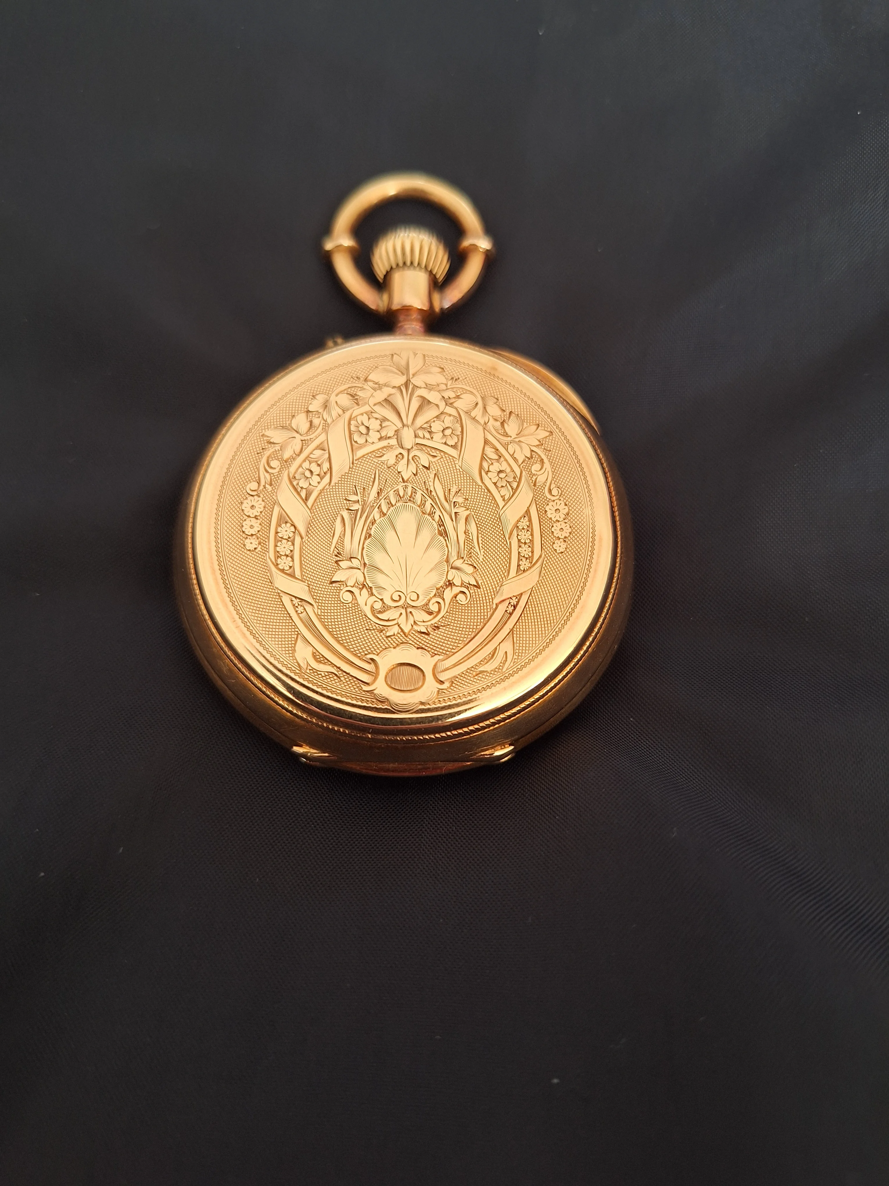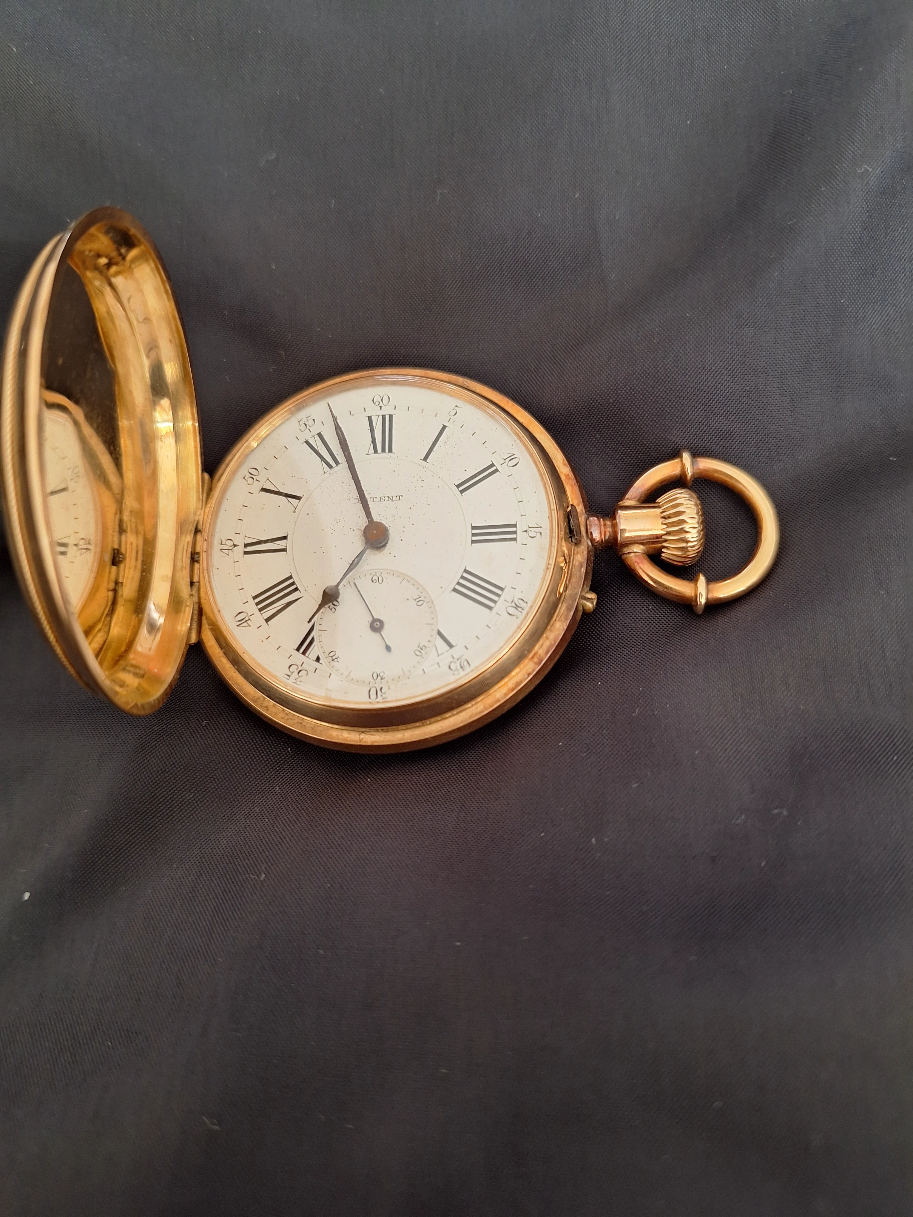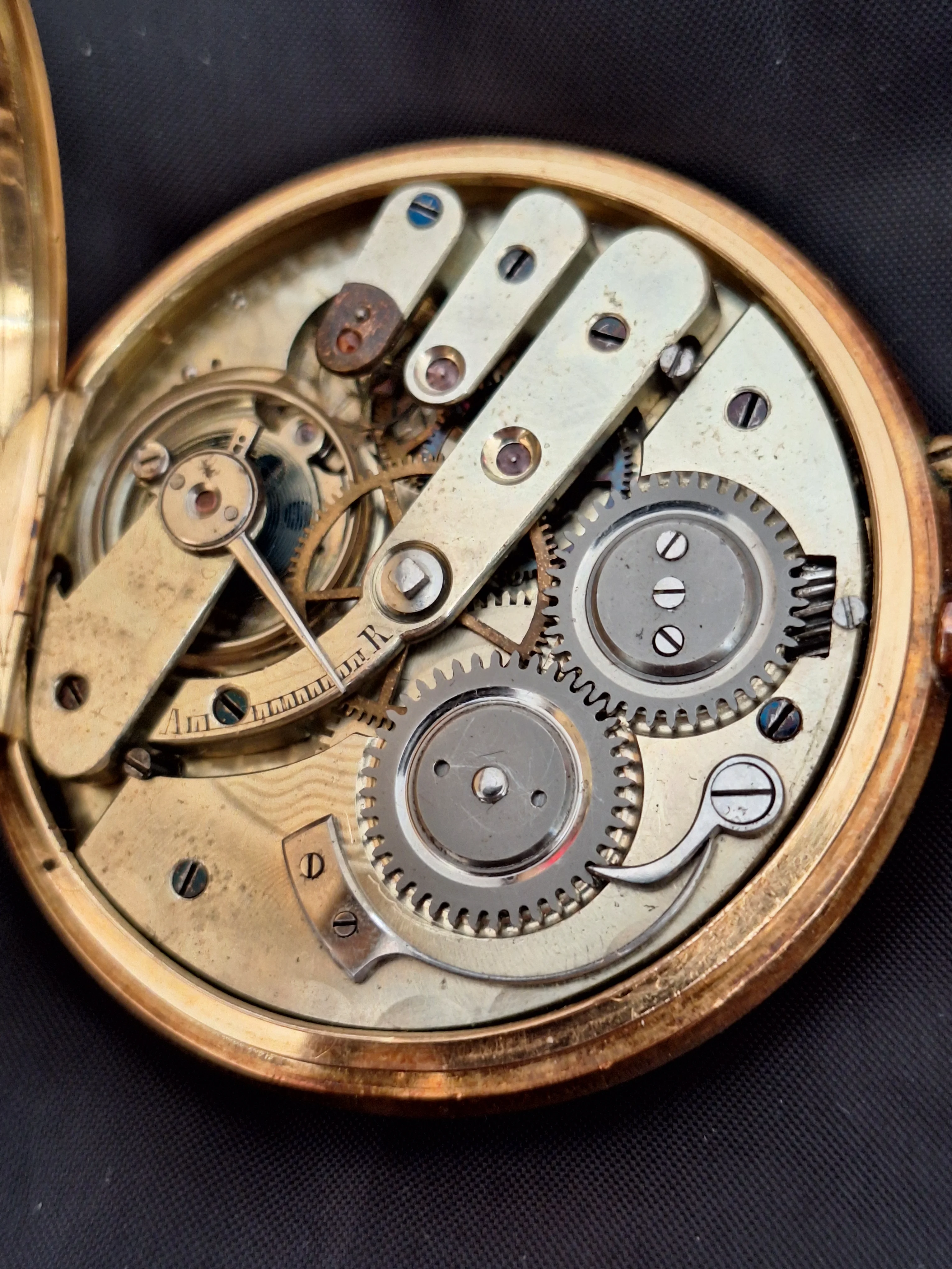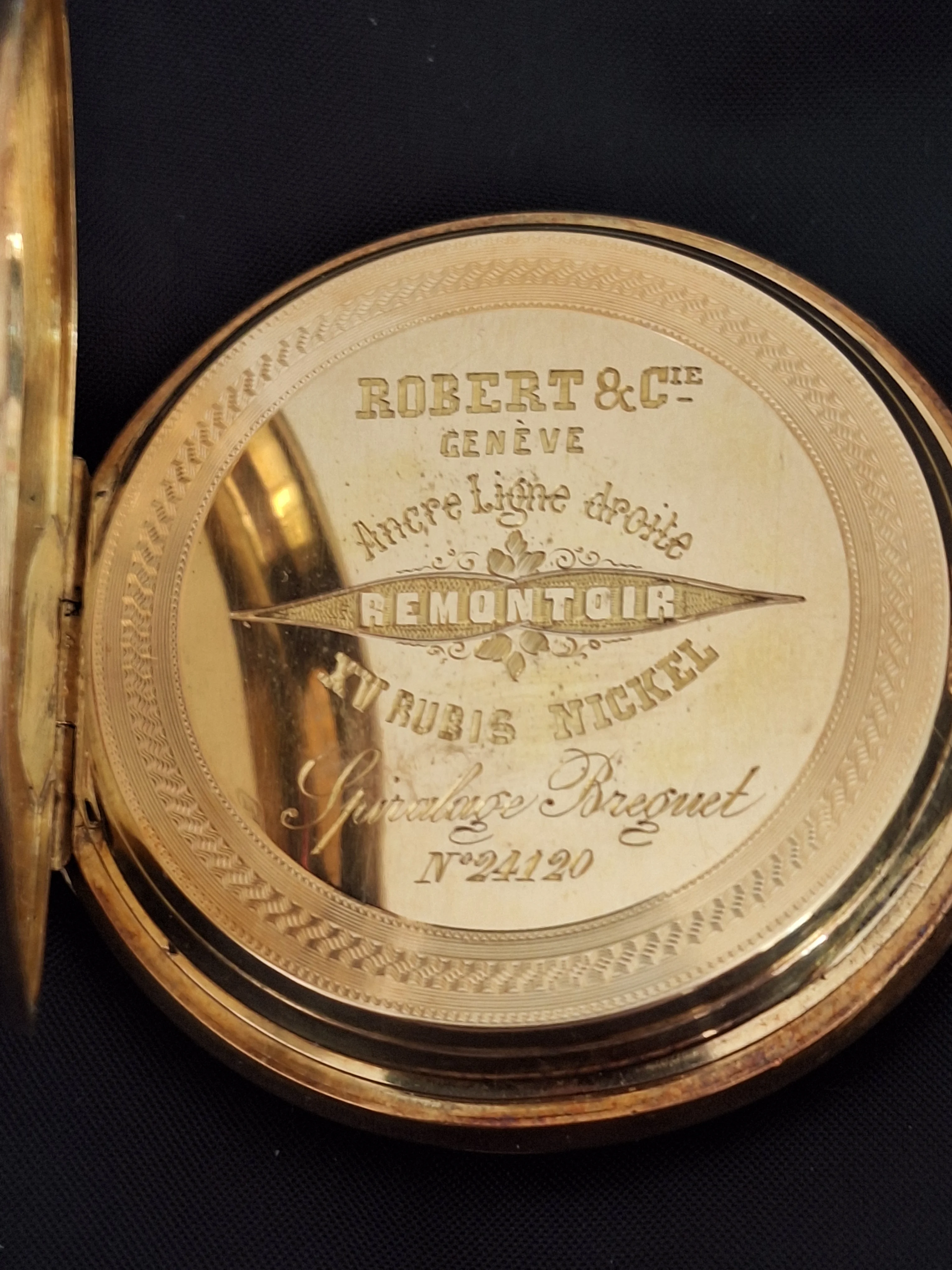 ·I spent way too much money on this one ($410), but the choo choo dial did me in. This is my new Columbus 16J Model 2 Railway King, circa 1892. The dial is pretty nice, there are a couple of hairlines between the 7 and 8 and between the 10 and 11, but other than that it looks good. It arrived in an old Dueber gold filled open face case, but I am pretty sure I have a 4oz coin silver hunting case squirreled away someplace that it will look rather handsome in. Honestly, the case is the only part of this watch that I don't love. The dial, the fleur de lis hands, the two tone damaskeening on the mov't with blued screws and gold accents on the regulator, it's all great.