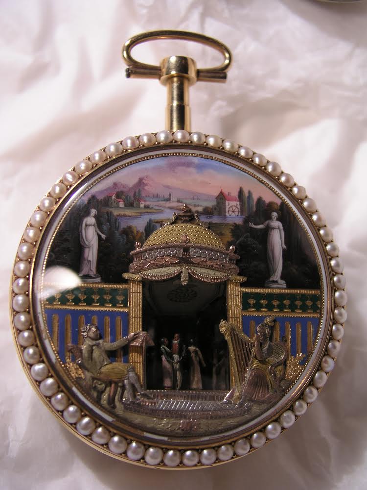 On the reverse side of the item, it may be observed that there are automata! Figures that move during the striking sequence. The figures in the foreground appear to play instruments, while the figures in the background, dance. The ornate portico has three, and possibly four colours of gold. Rose gold, yellow gold, green gold, and the white metal might be silver, as this artifact predates the alloying of white gold, and I very much doubt it is platinum. The scene in the break arch is all hand decorated vitreous enamel which I have discussed on several other items.