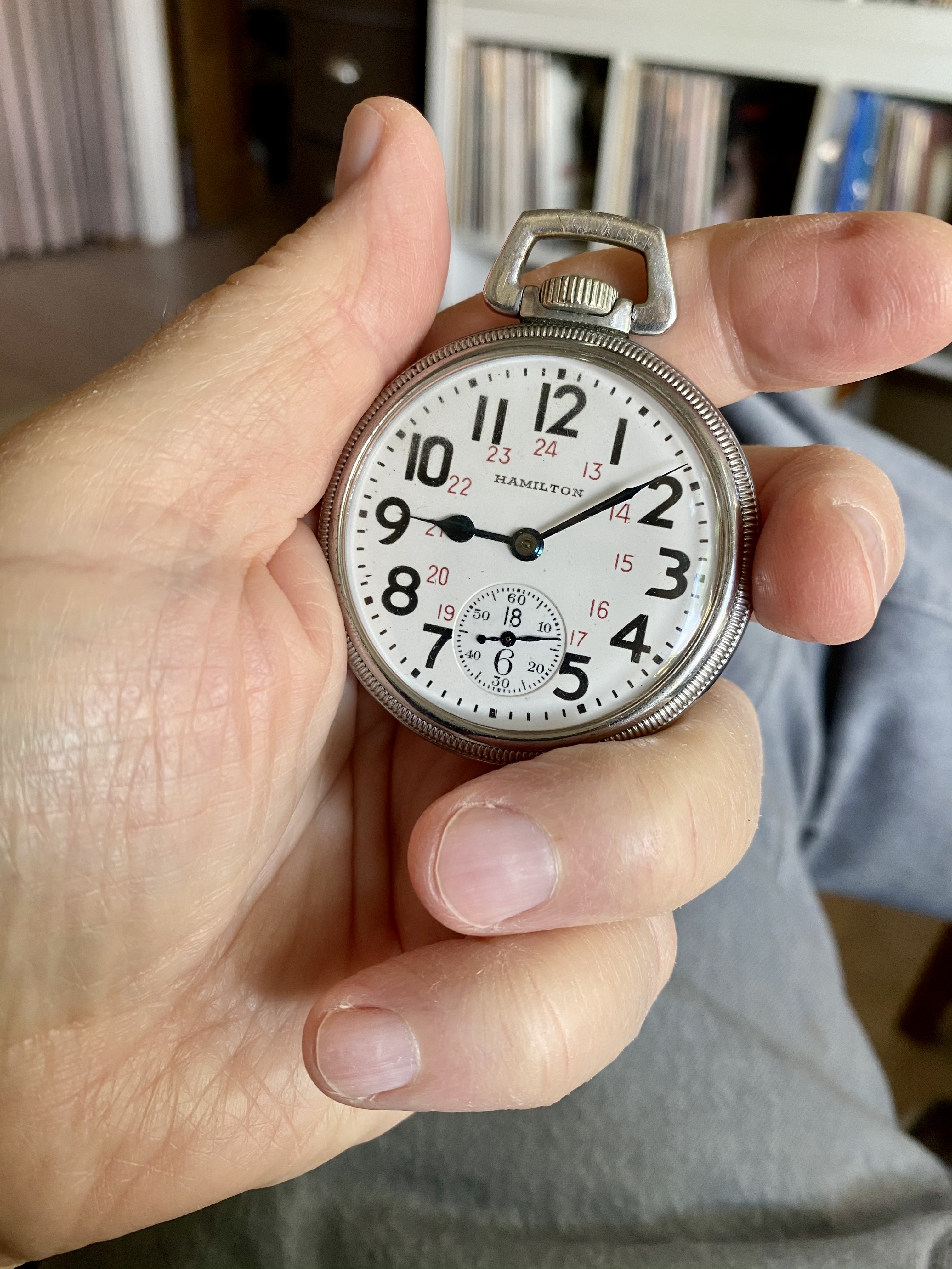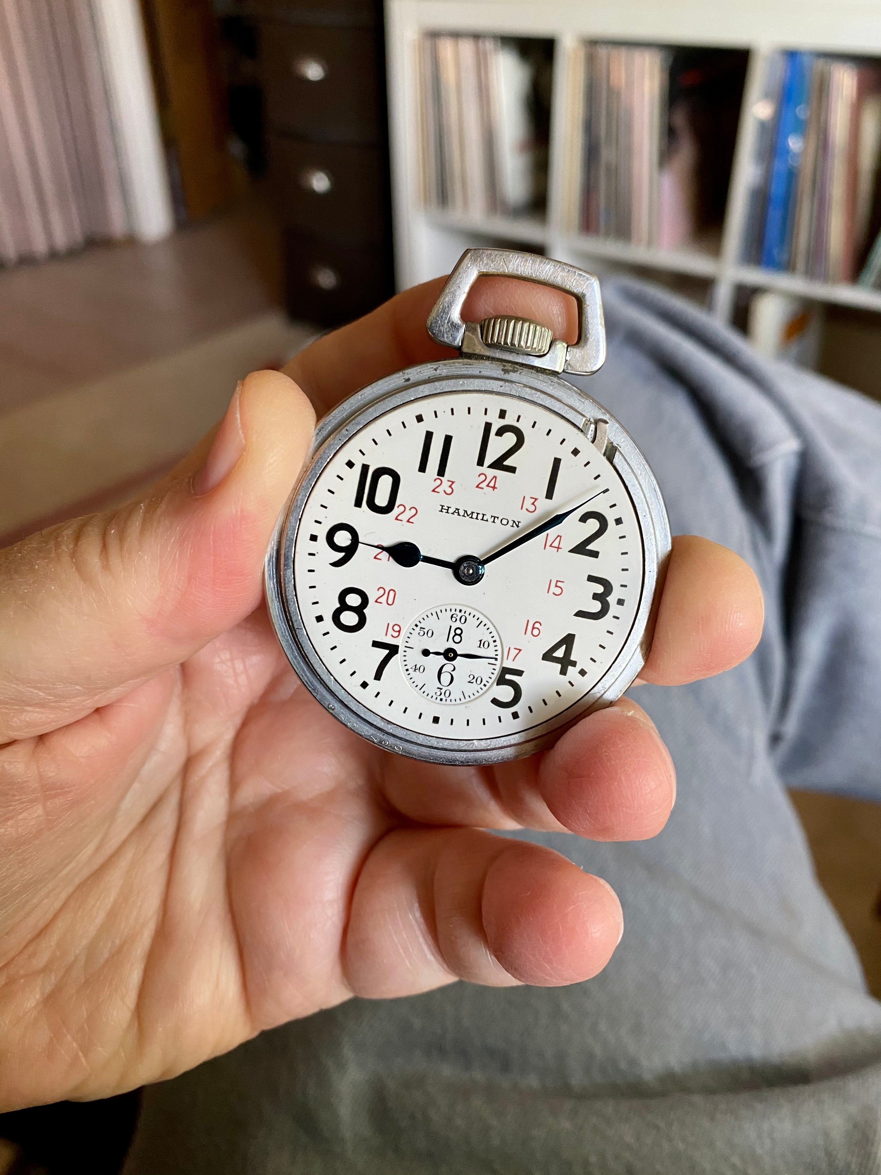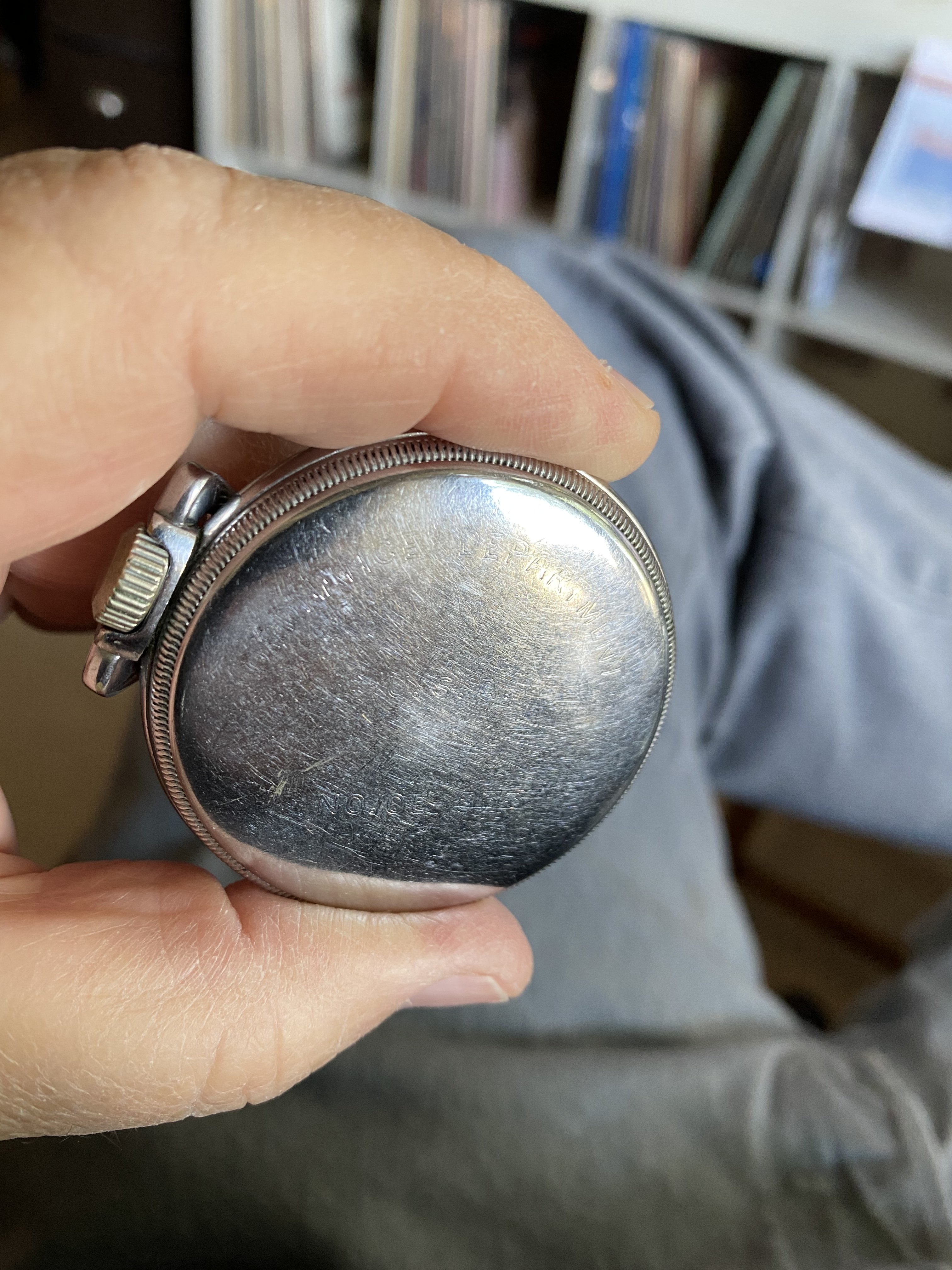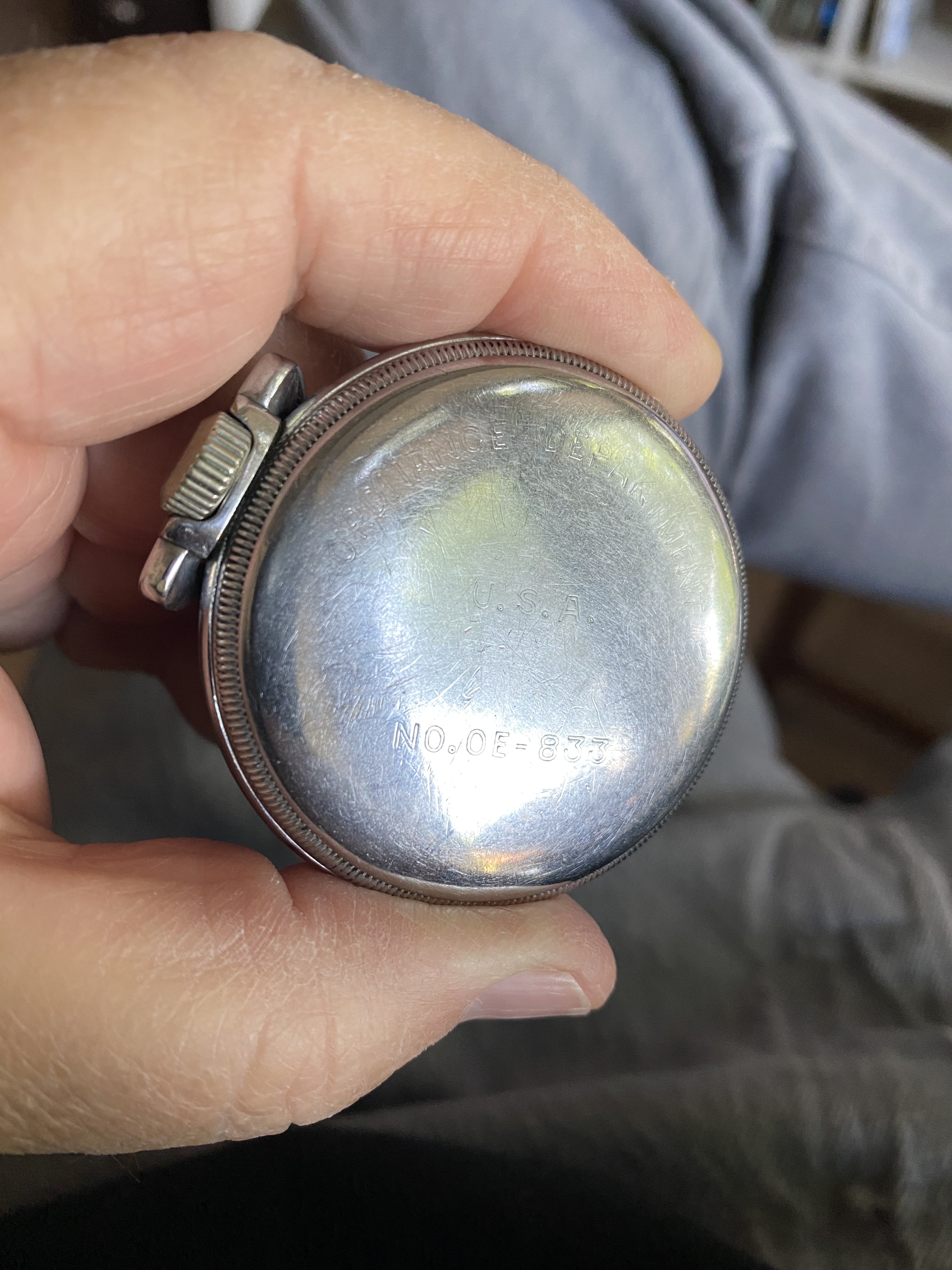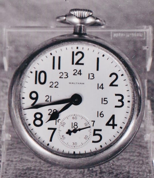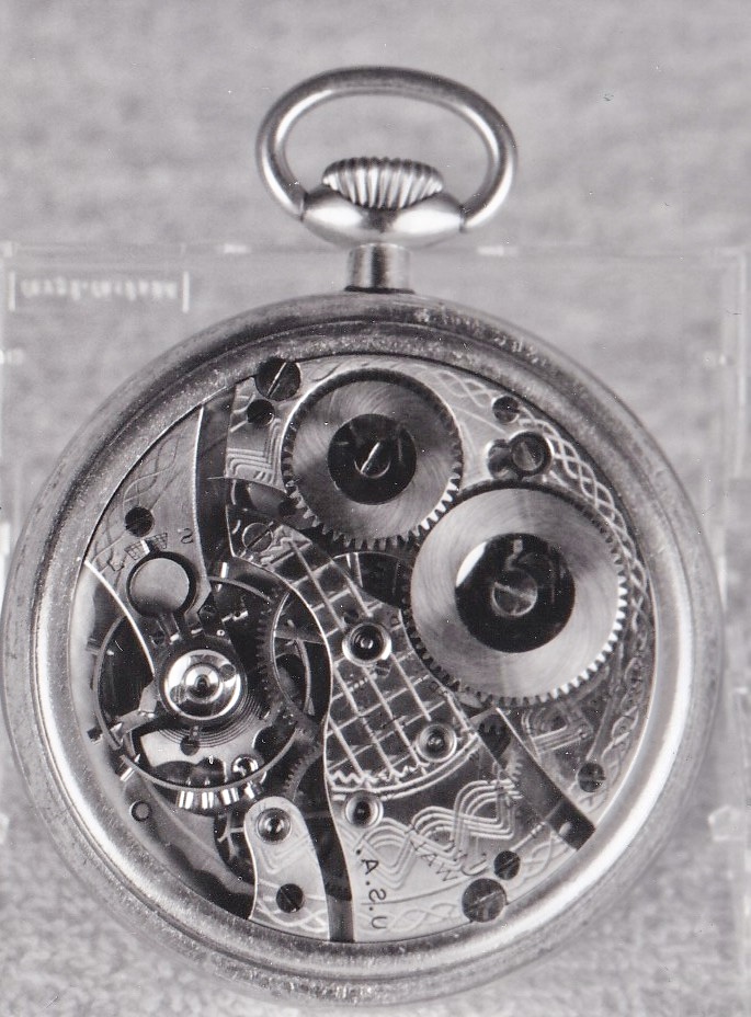 To counter this problem, many power companies came up with systems to try to govern power plant output, to eliminate these variations in rate. In the mid 1920s, our local power source instituted a system that involved the use of the subject Waltham, 21-jewel Crescent Street model pocket watch. The Waltham was kept in plain view, in the control room. At the beginning of each shift, the board operator at the power plant, would make certain the Waltham was wound, then he would telephone the National Research Council to get the correct time, then to re-set the Waltham as required.