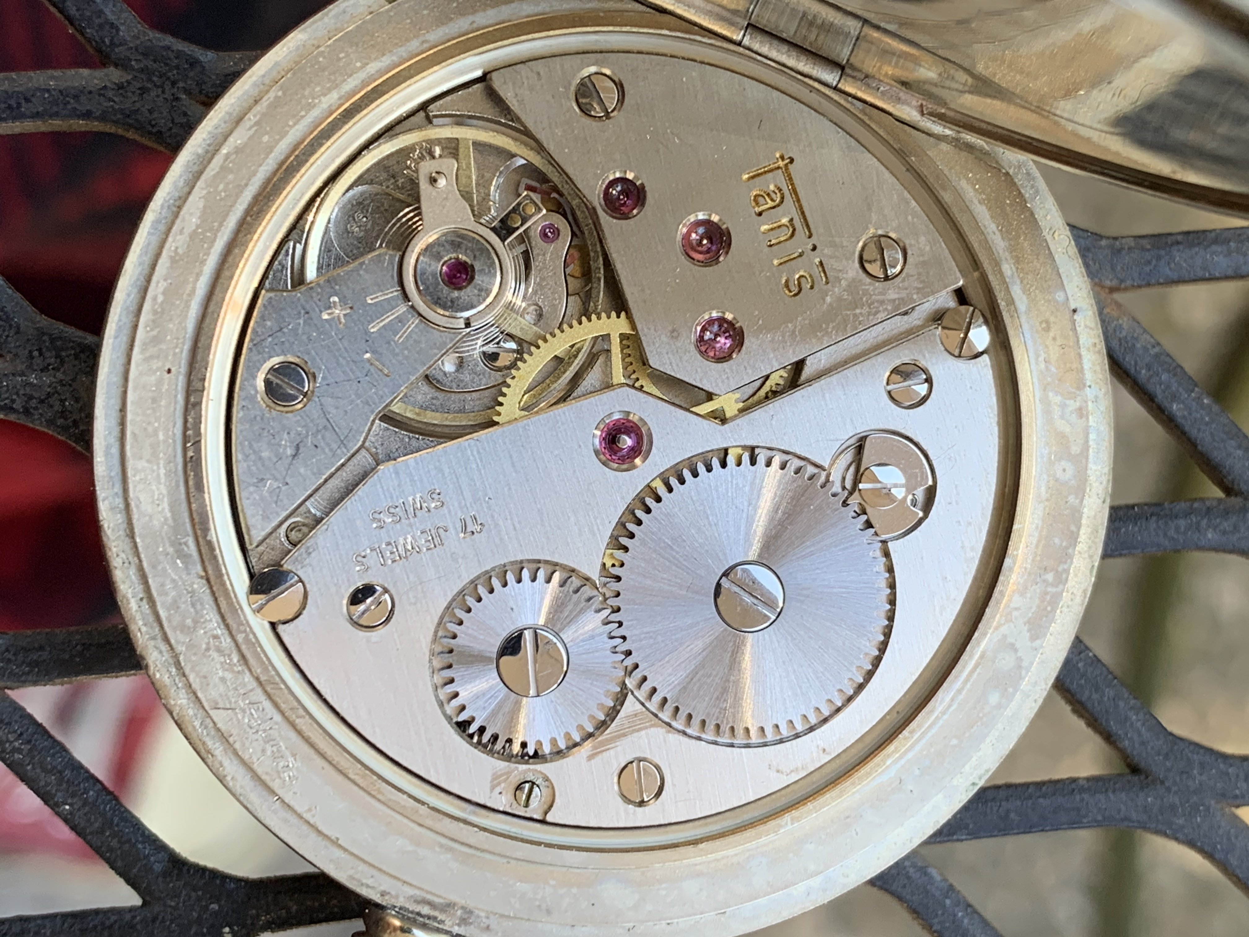 Tanis could be a Unitas 6445 or the Eta equivalent, or it could be a clone. I see stampings under the balance wheel, but can鈥檛 make them out. Mikrolisk has this to say about the Tanis name. And here is a picture of the Unitas 6445 movement.