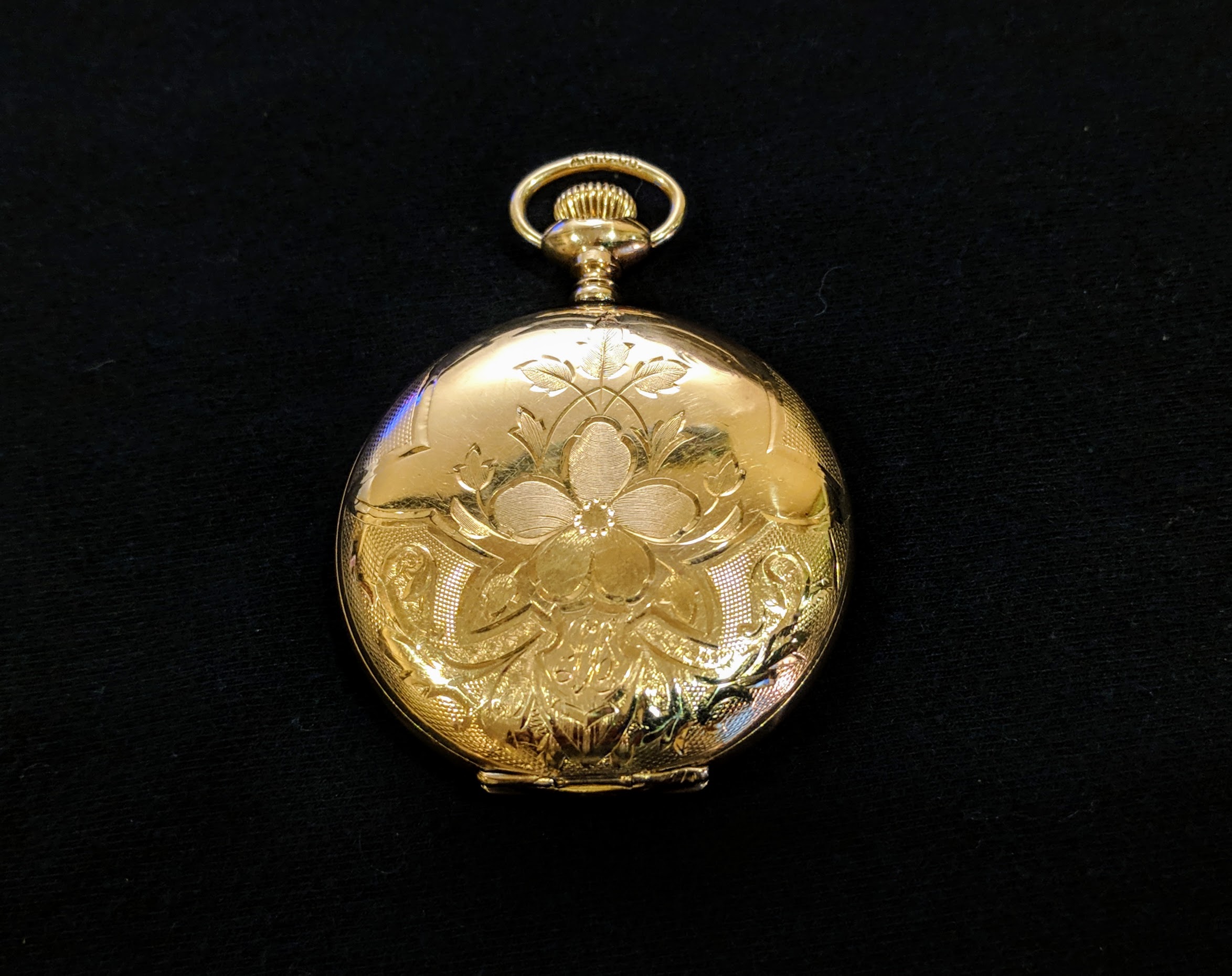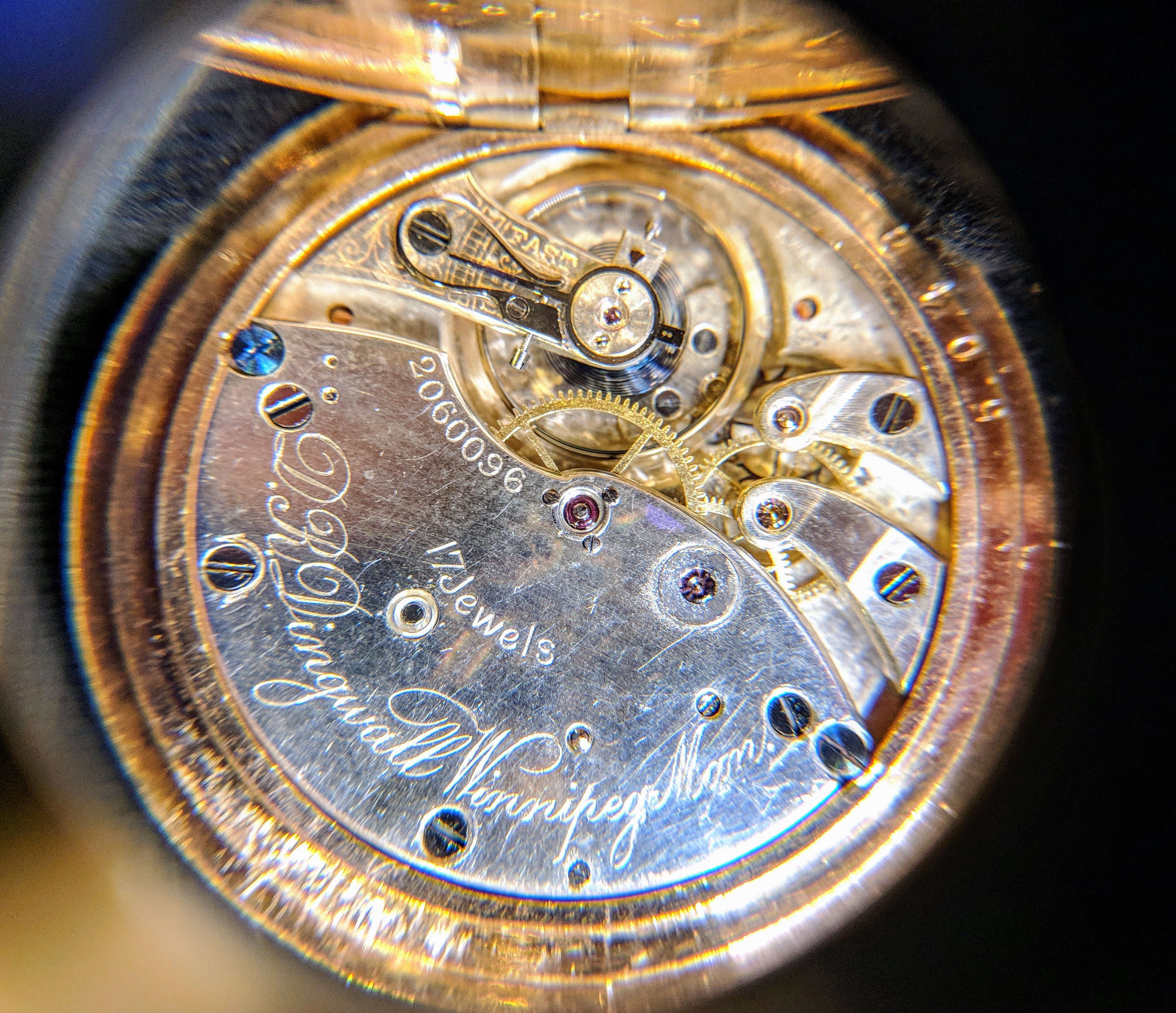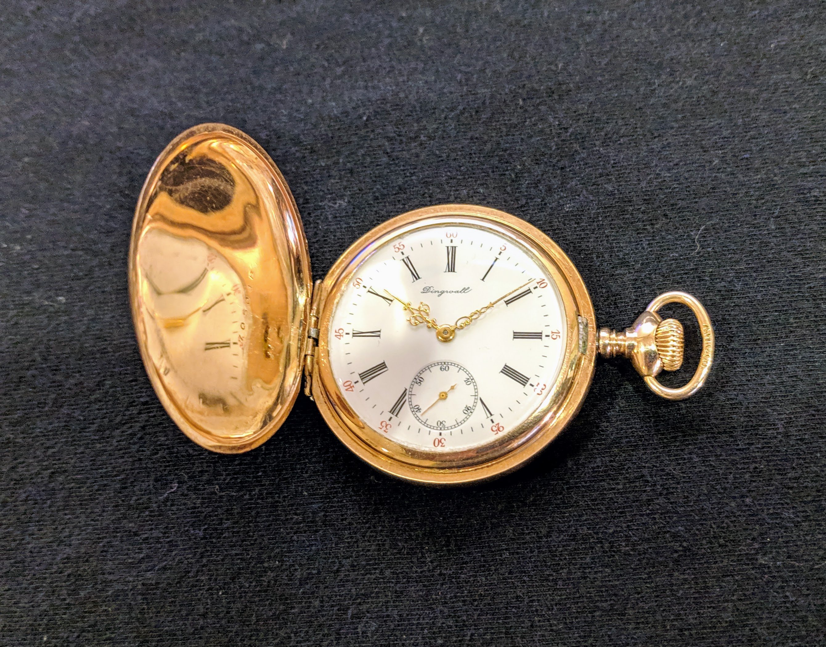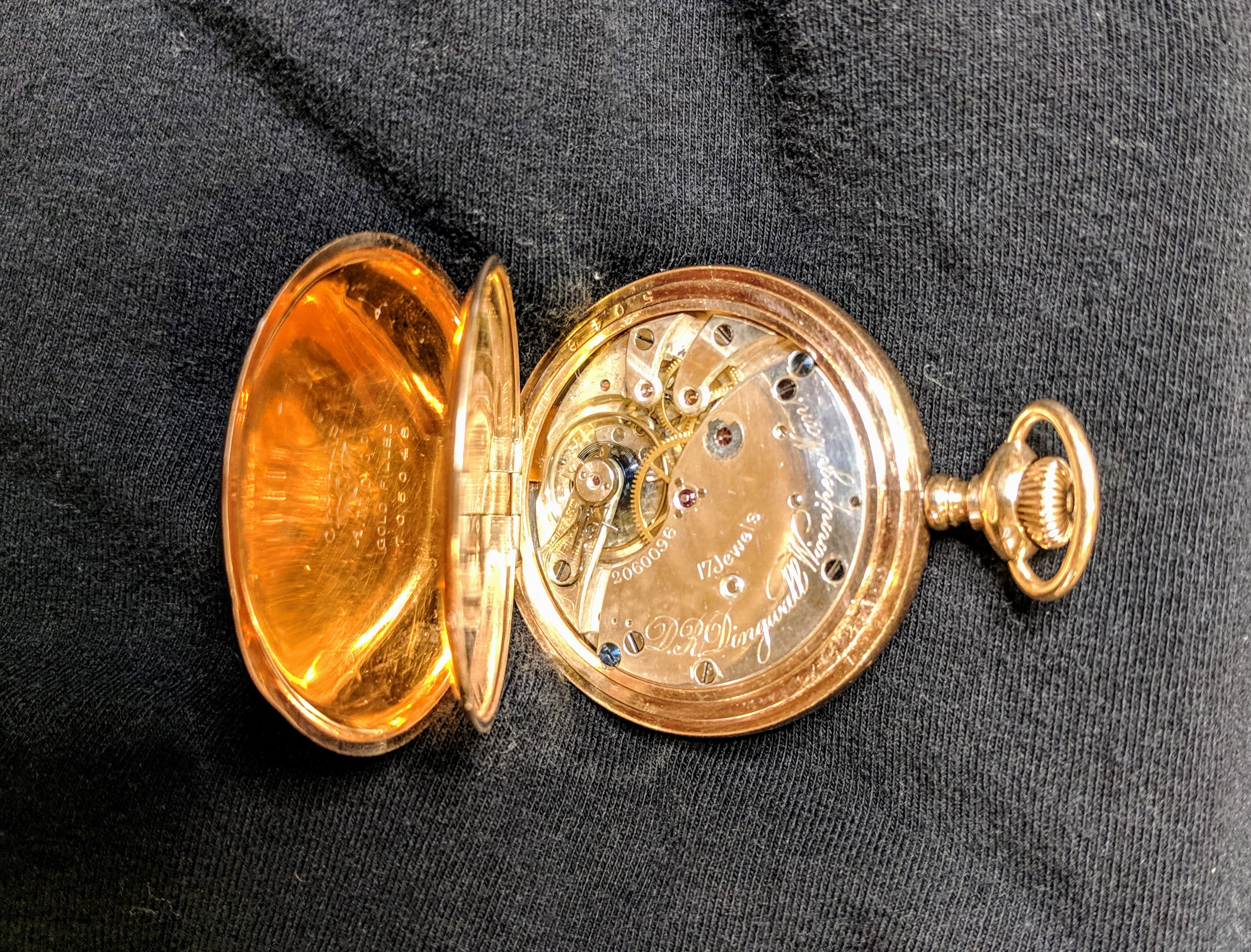 I think I detect a karat gold case. That watch is absolutely breathtaking! As is the ornate engraving on the case back. D. R. Dingwall was a major centre for watches, and particularly railroad watches. In the heyday of the 1920s, Dingwall employed 22 watchmakers! I have a much more pedestrian Hamilton 944, railroad approved, 18-size, 19-jewel pocket watch. Your dial is marked Dingwall, and mine is marked D R Dingwall. I bought it at an NAWCC mart in Portland, Ore., many years ago. It was overlooked by hundreds of collectors because they didn't recognize the name! WOW! JUST WOW! Thanks for joining us pocket watch fanatics.
