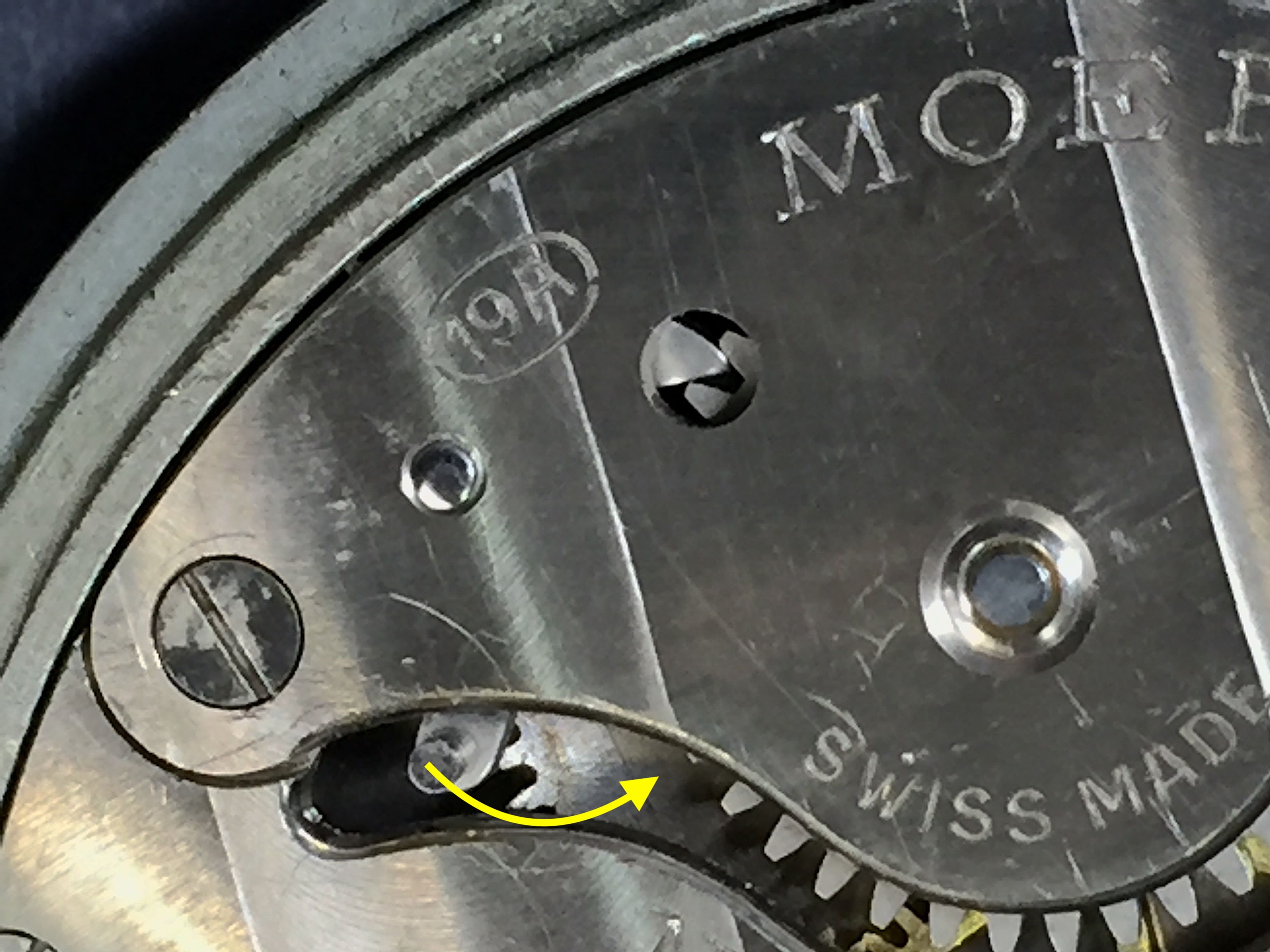 The movement has an interesting feature. The click has an extended lever that can be moved by a stud (yellow arrow), thus disengaging the click from the ratchet wheel (in the window just below the 19A)