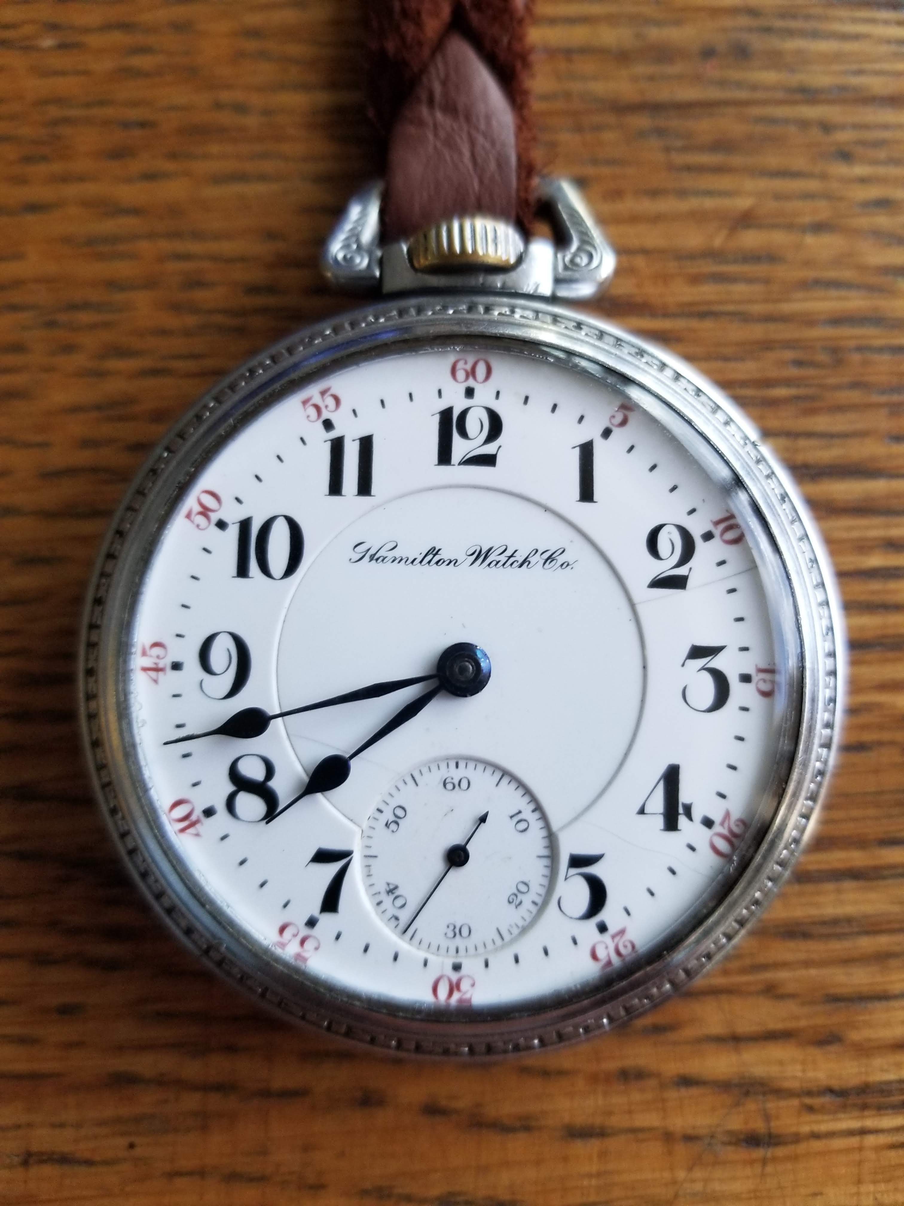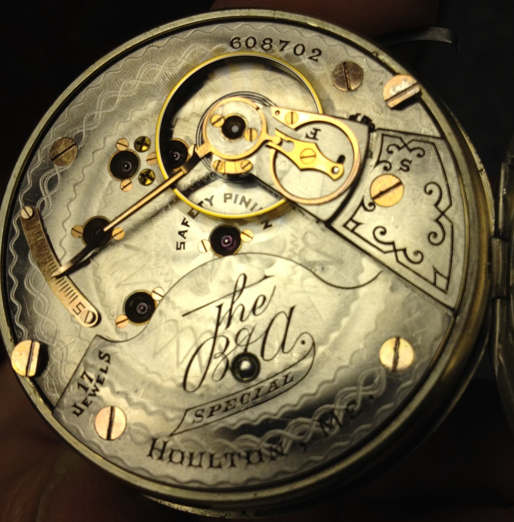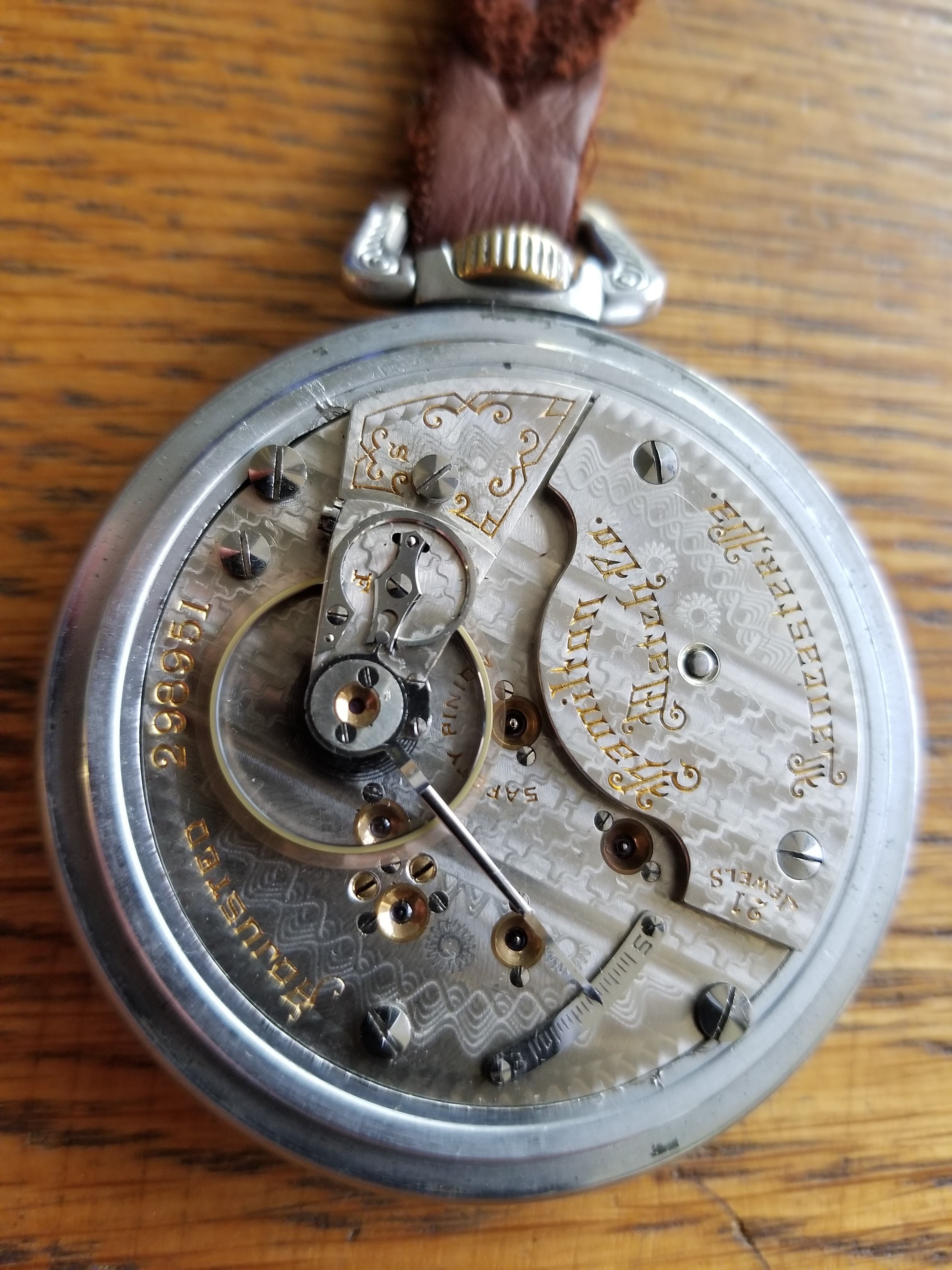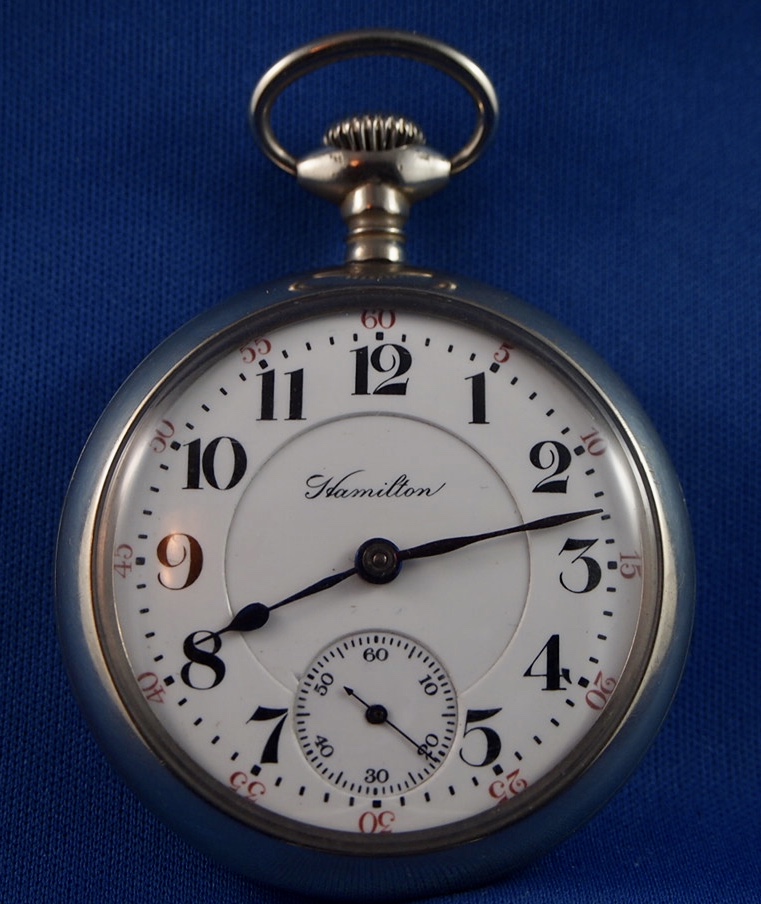 Several months ago, I got a phone call from one of the watch repair fraternity in town, enquiring if I had a regulator arm for a Hamilton, 18-size, grade 940 pocket watch. He was servicing his customer’s pocket watch, and lost the regulator arm. After days of sweeping, probing with magnets, and otherwise scouring his shop, he was not able to find the part. I took a look at the watch while in his shop, and thought to myself that I had the part he needed. When I got to my shop, I checked. I have a totally ratched Hamilton grade 940 which long ago was relegated to “parts only” status, and I had the regulator arm he needed. I phoned him, and told him that I had the part. He told me he wanted to buy it. I told him that I don’t sell antique watch parts, but I would supply the part IF I got the whole job! Not what he wanted to hear!