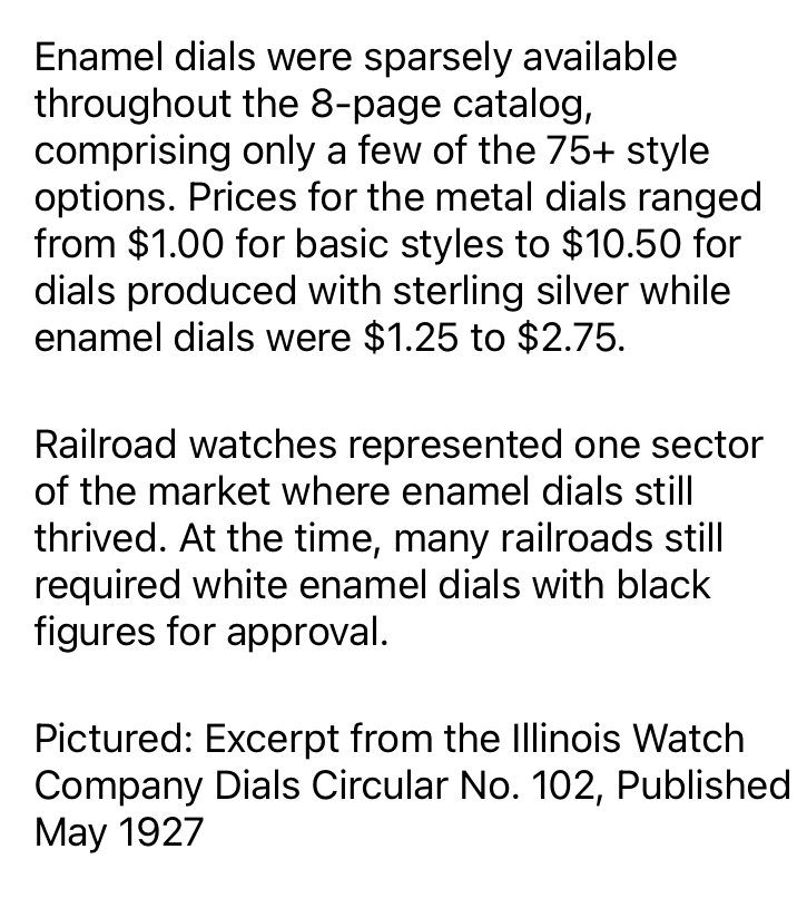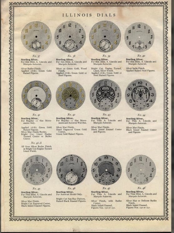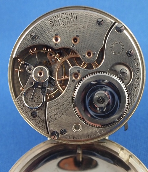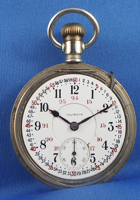 It’s a 16-size, Illinois, 21-jewel, Sangamo grade railroad standard watch with an unusual dial. The dial is a 24-hour, double-sunk, vitreous enamel, Montgomery style dial showing marginal minutes. Some might say this is a very “busy” dial, and I guess they’re right. The dial shows damage at the sub-dial, and a hairline or two, but it is reasonably good for a 110-year old watch…