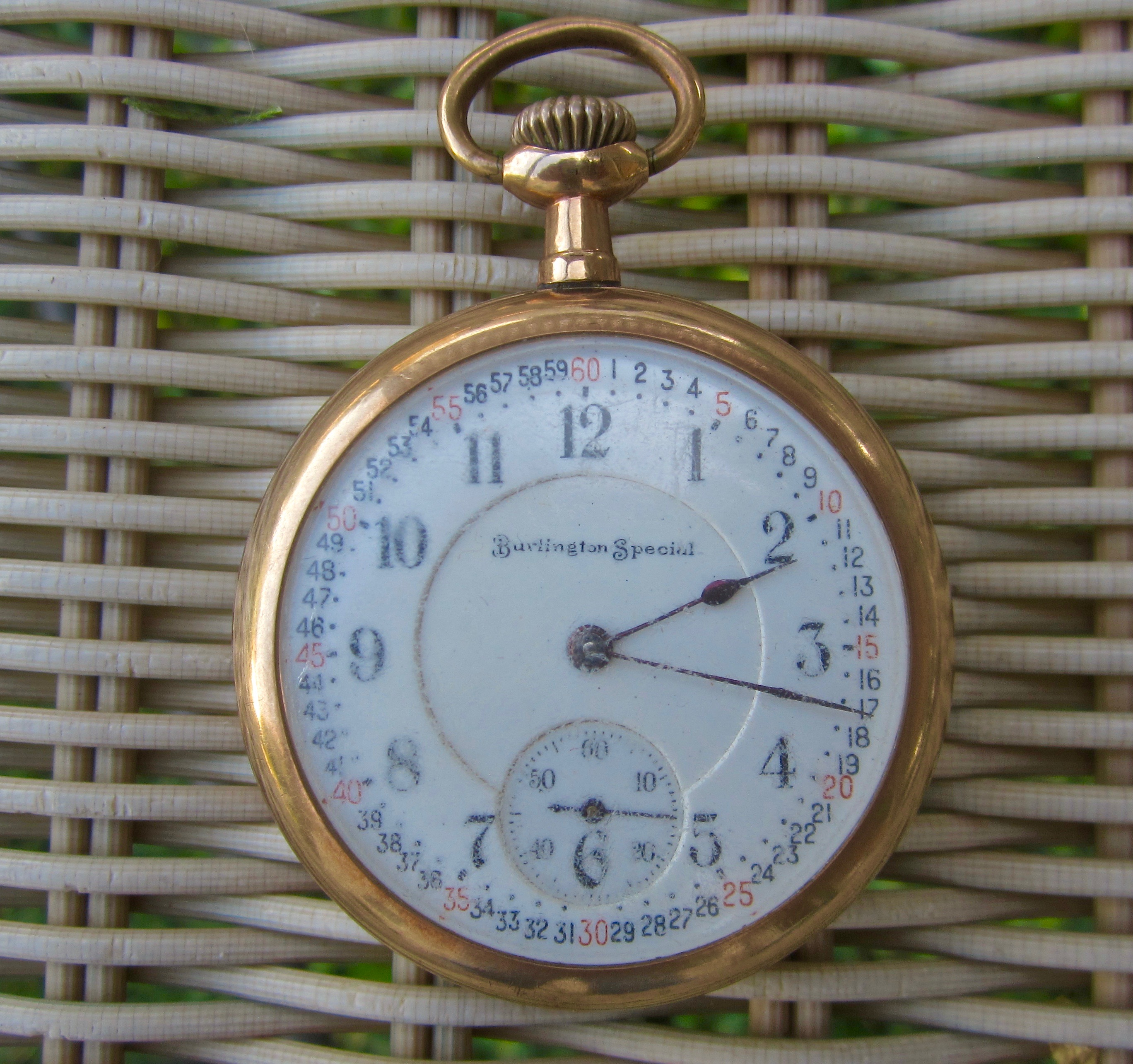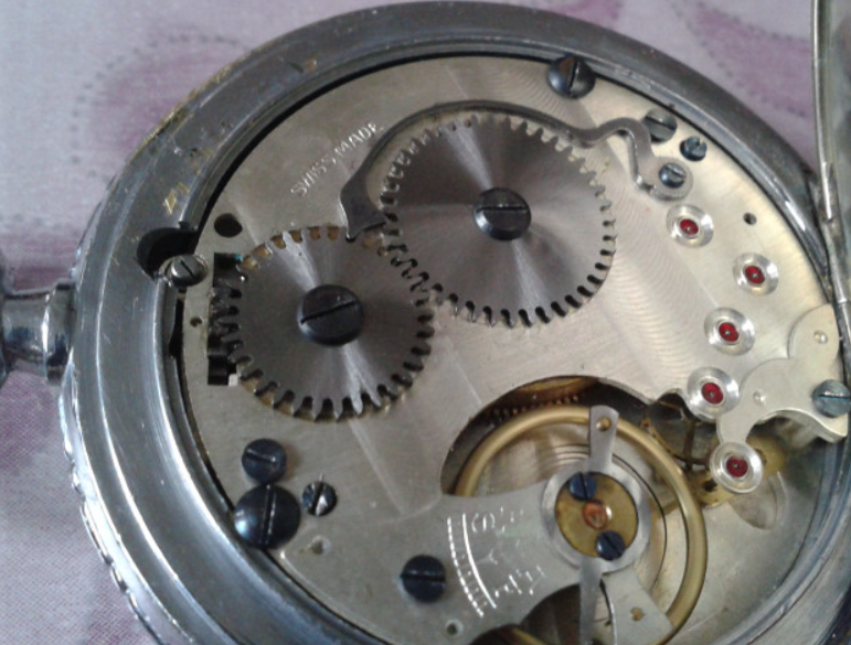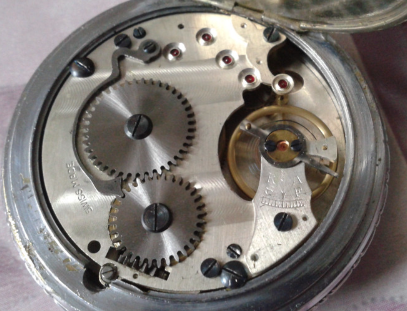 I'll have to admit I was a bit disappointed by the condition of the dial -- it was previously masked by the damaged and clouded acrylic. The linear striation at 10:30 is rather mysterious in origin, maybe the result of an accident that broke one of the previous crystals? Grandad was a farmer and I have the vaguest recollection of him pulling a pocket watch out of the top-centre pocket of his denim overalls, so this watch seems to have survived a fairly dangerous environment.
