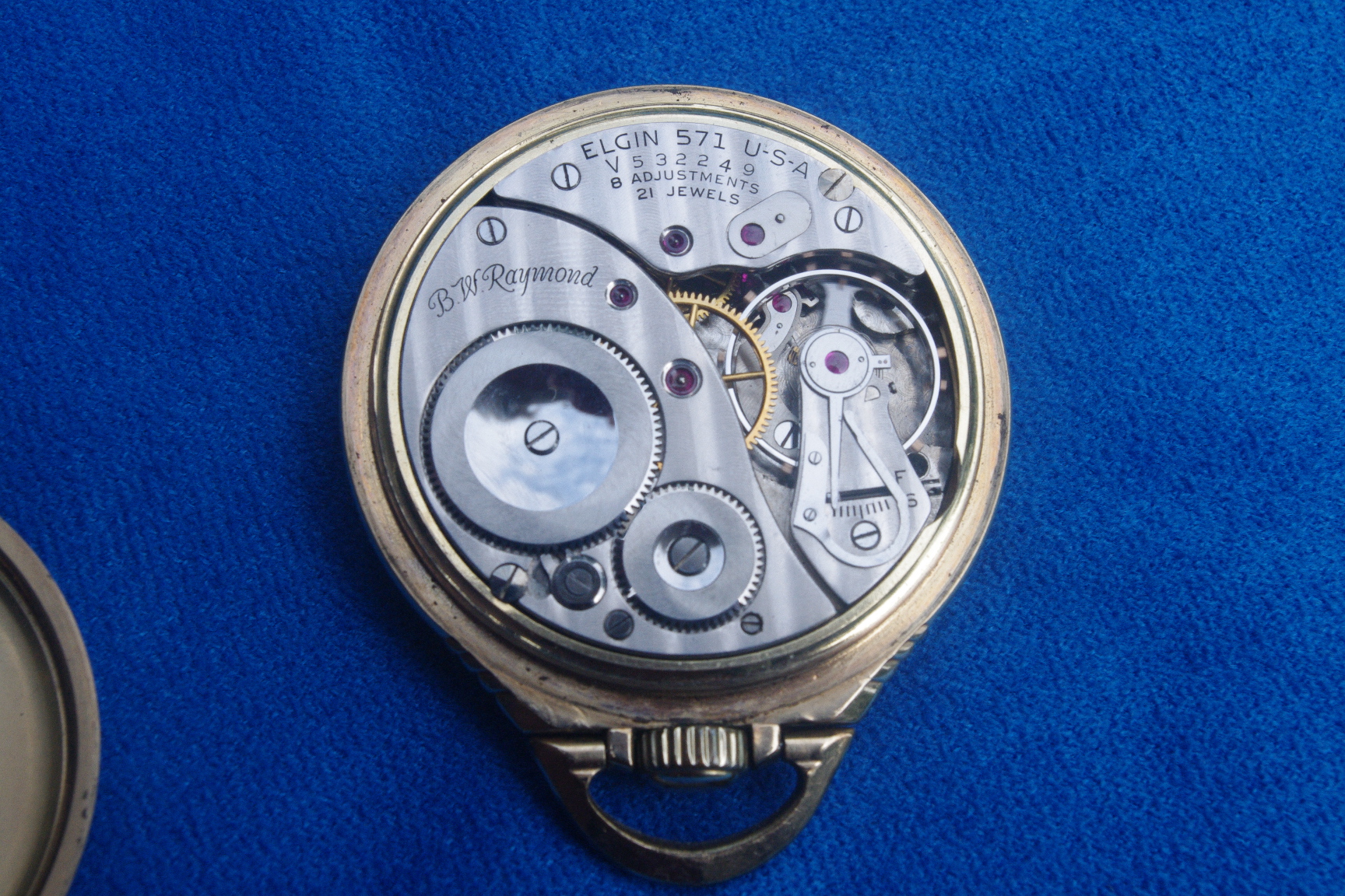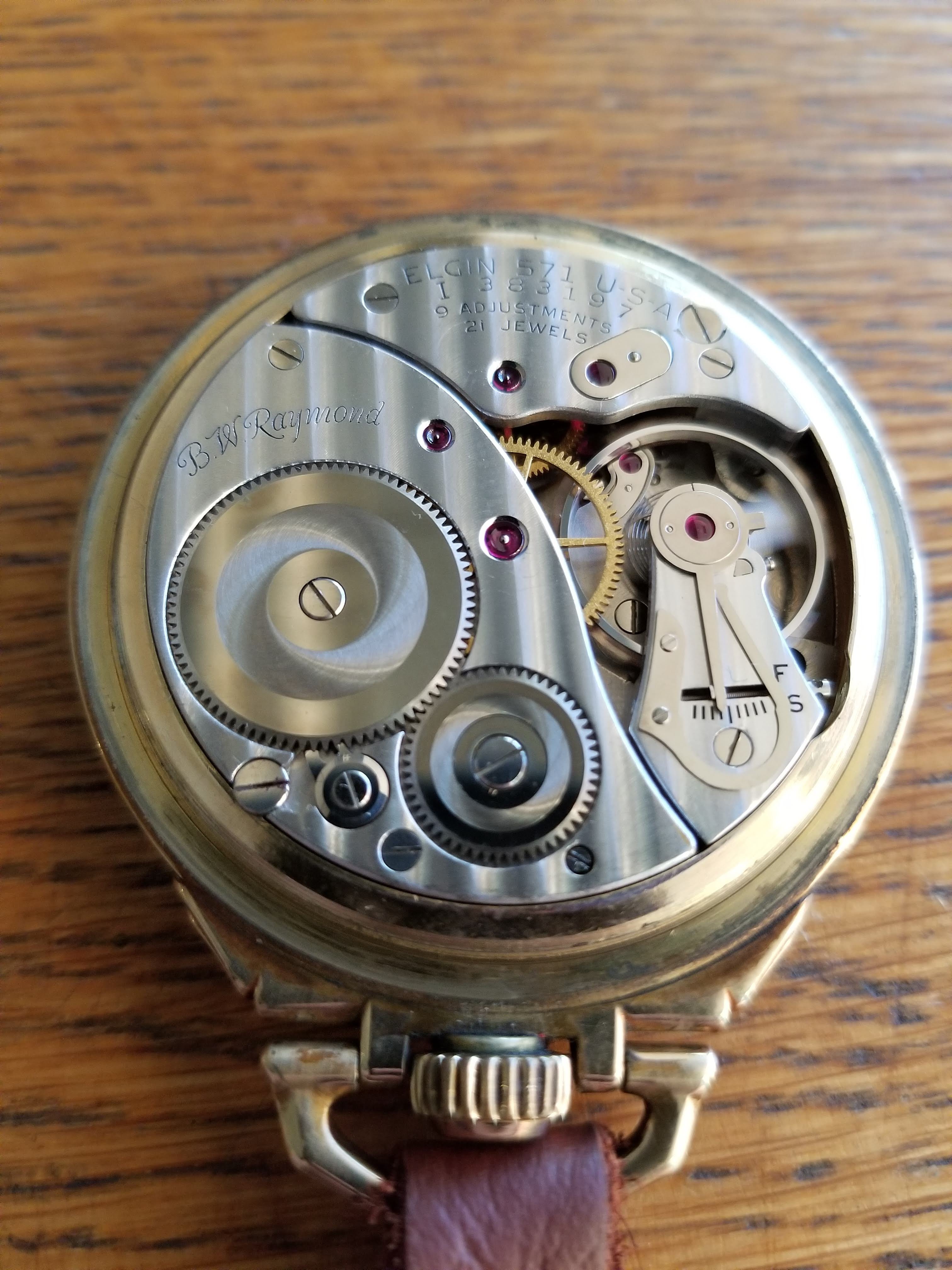 Salutations from my grade 571, as well. Over 30 years ago, a woman I knew told me her truck driver husband liked pocket watches, and asked if I had one I’d sell. I sold her about the nicest Elgin B W Raymond I had ever seen. Shouldn’t aughtta have done that! I regret it to this day. The one I have uploaded isn’t nearly as nice. This is the one I mentioned earlier…..converted to stem set.