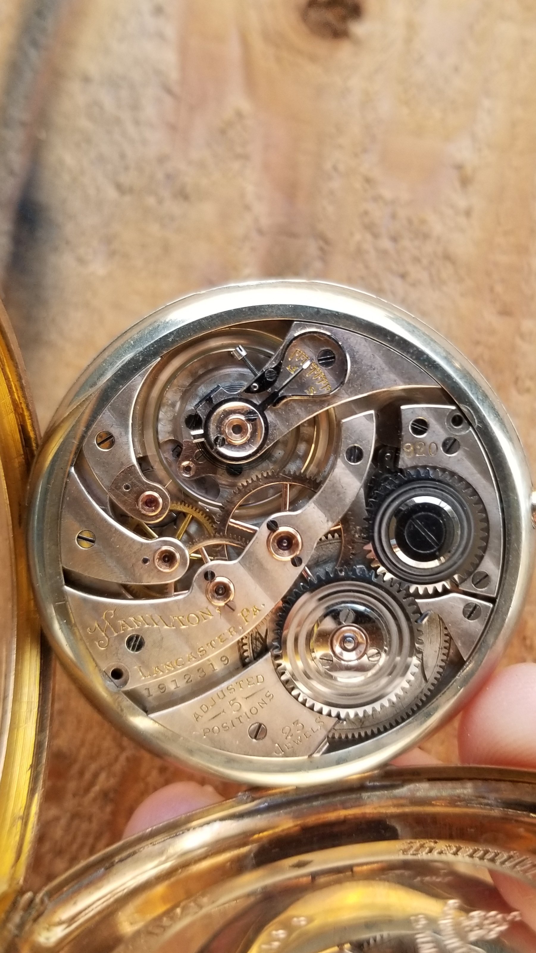 A new arrival here. A 1923 Hamilton 920, 23 jewels, sapphire pallet jewels, ruby pivot jewels, gold train and center wheel, adjusted to five positions, in a 12s 25 year warranted case. All in all, one fine timepiece. The dial is slightly damaged but it really doesn't present badly in person.