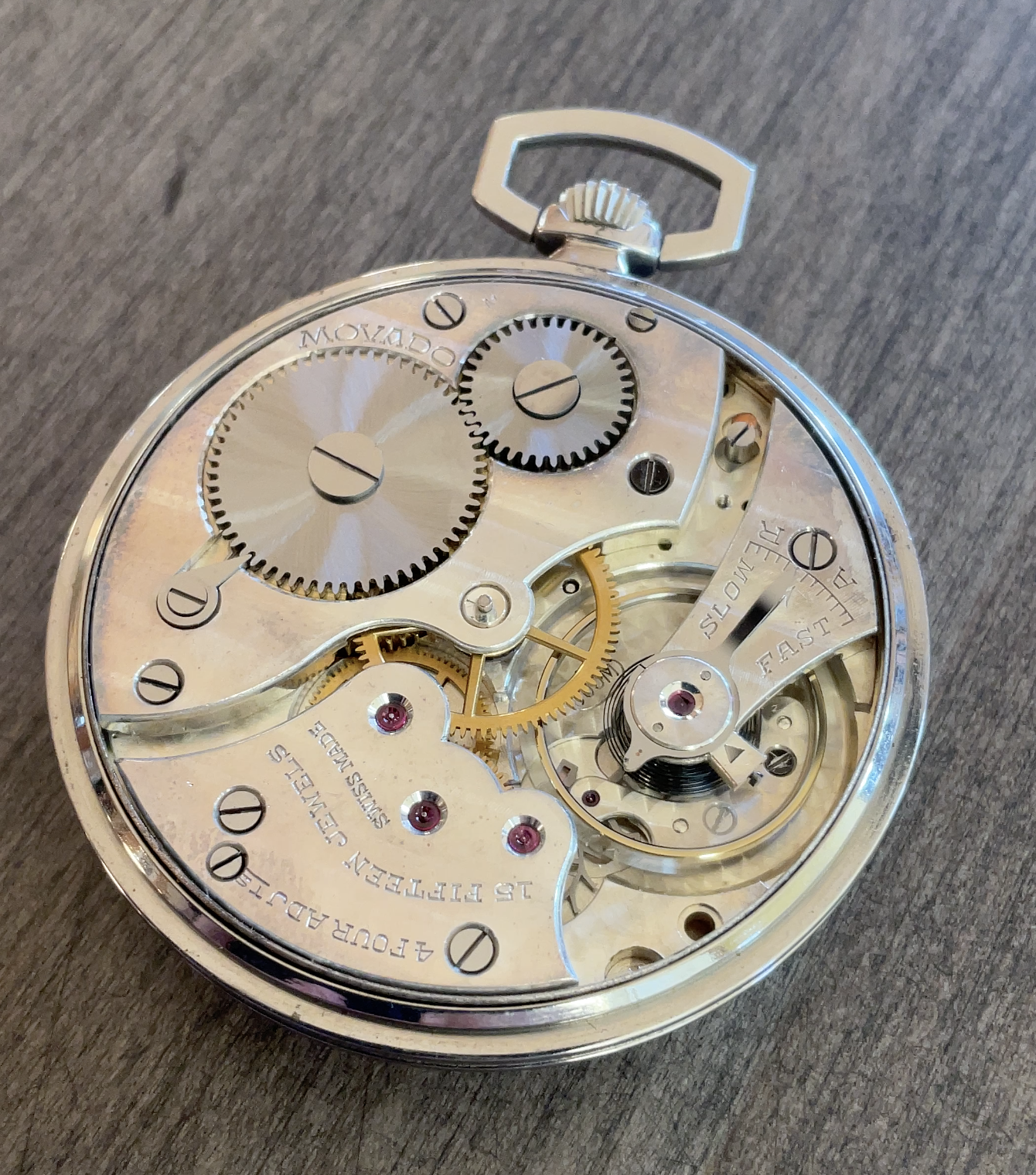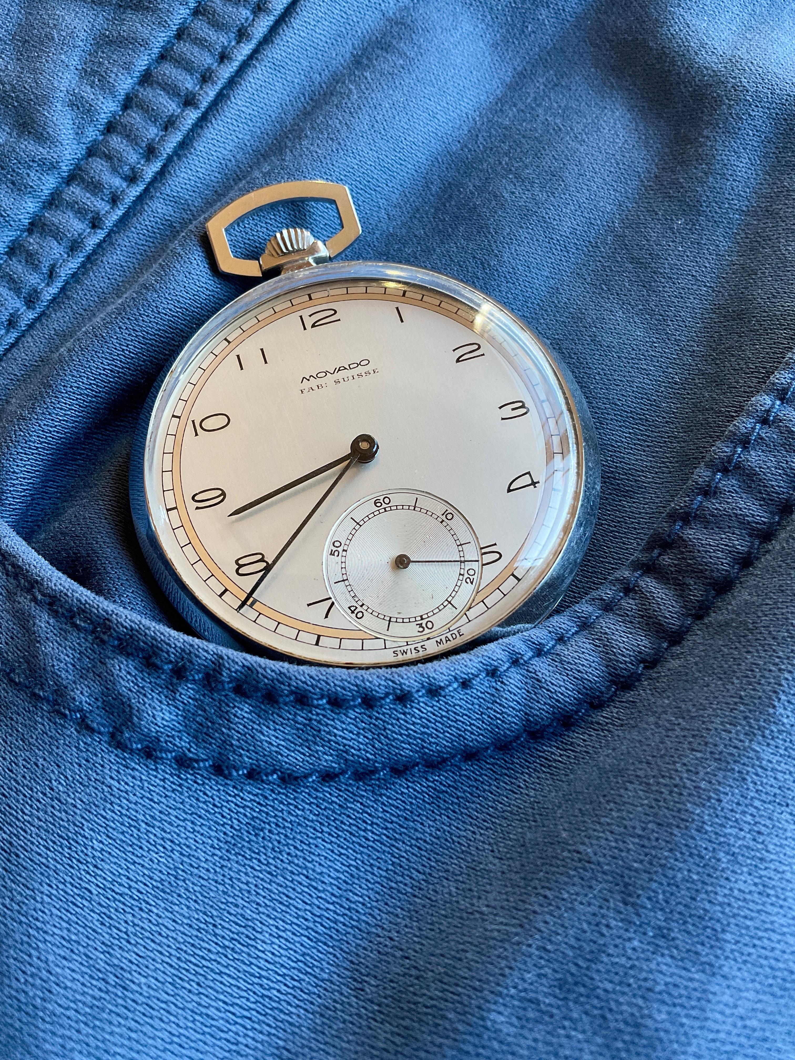 Picked up another nice vintage Movado pocket watch, this one in steel (last one was 14k YG) with Art Deco numerals on a two-tone silvered dial. Engine is Caliber 800M, and about 47mm. Inside caseback notes reference as 15515, and serial that begins with 8857xx, but don't know much else about it. Would love any additional information anyone might be able to shed on it, or any old catalog/advertisement pictures. Thanks in advance!