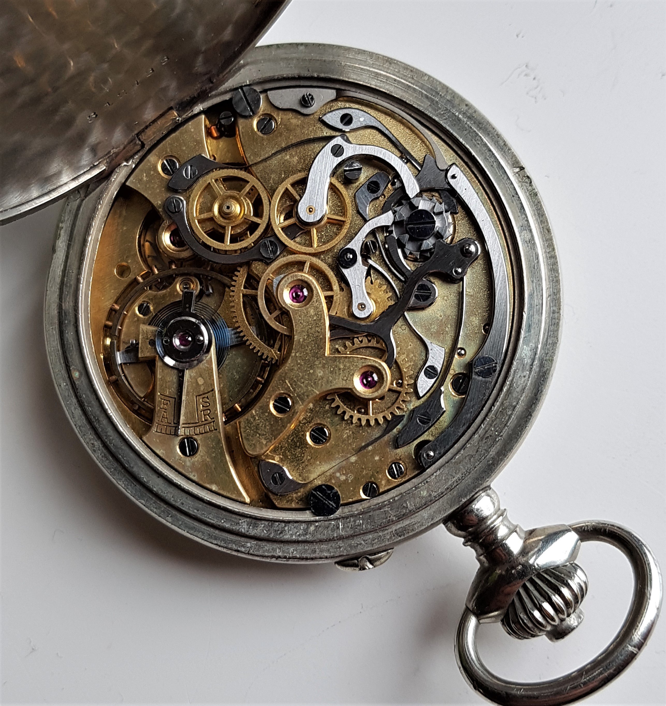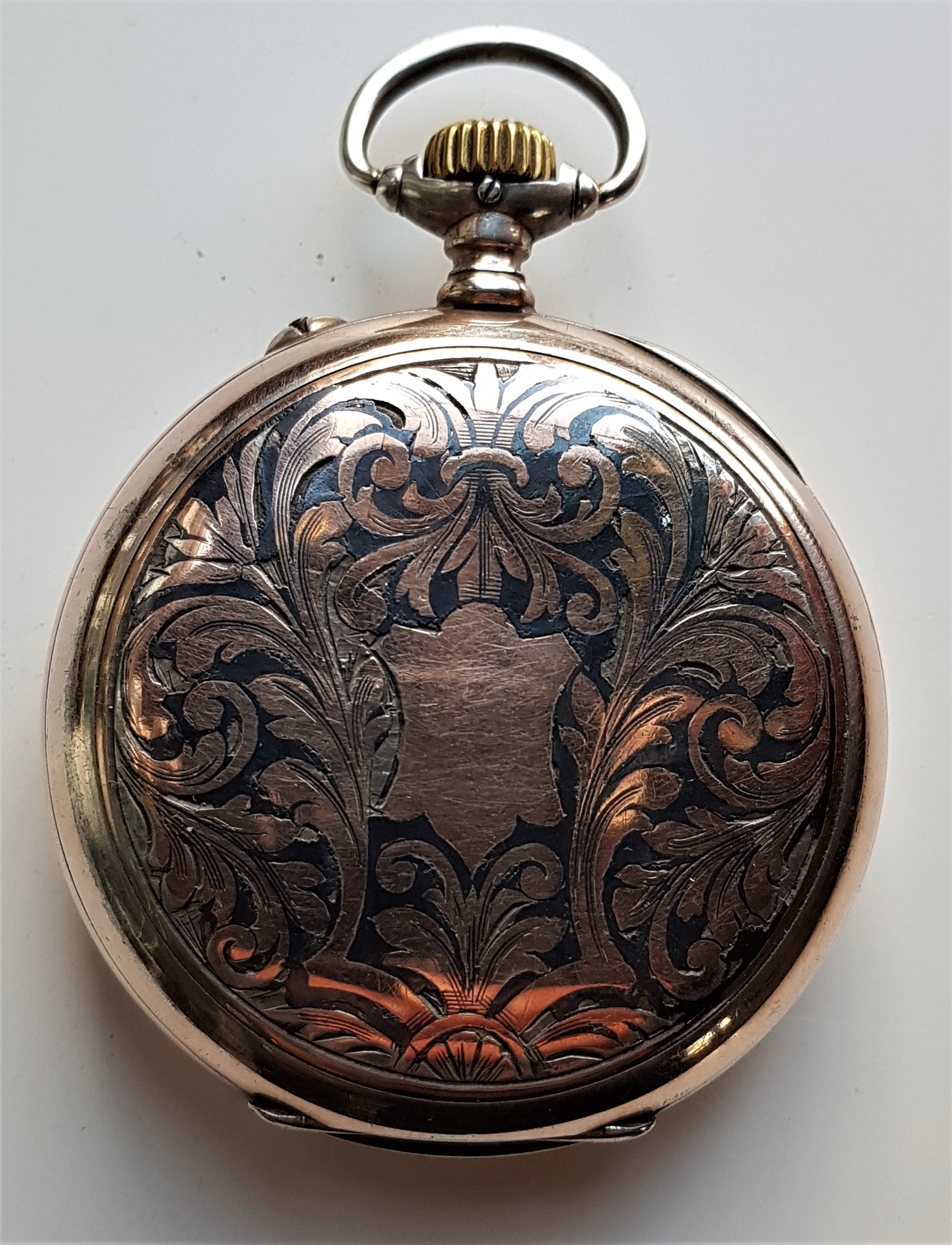 It is unusual to find a case that has niello in such deeply sculptured carving on the case back. I’ve never seen a niello case as nice as that. The French engraving on the balance cock is a bit unusual. I don’t see a serial number on the movement, but the fact that it is pin-set might indicate very early 20th century? What does the engraving inside the case back say about the case material?