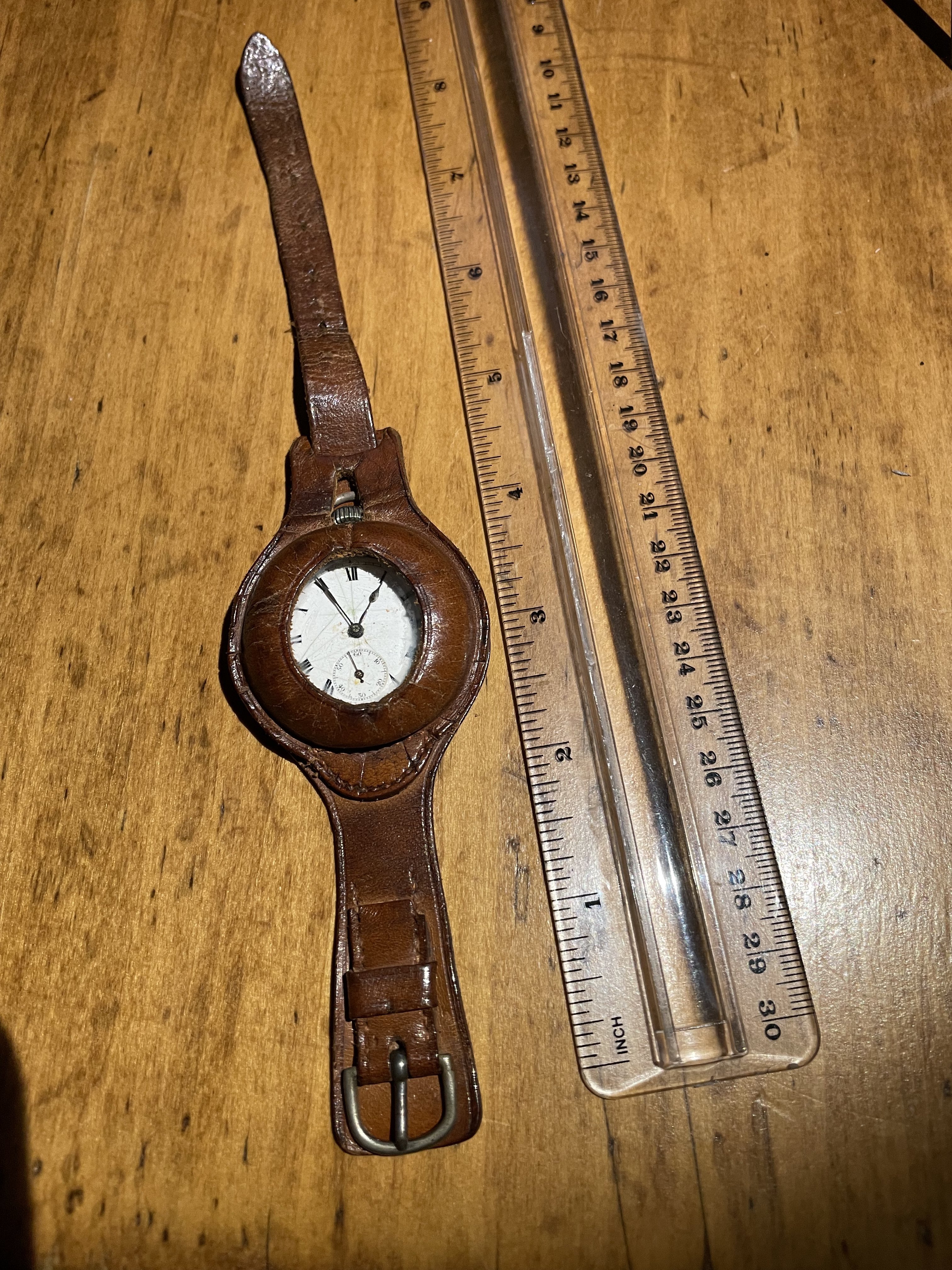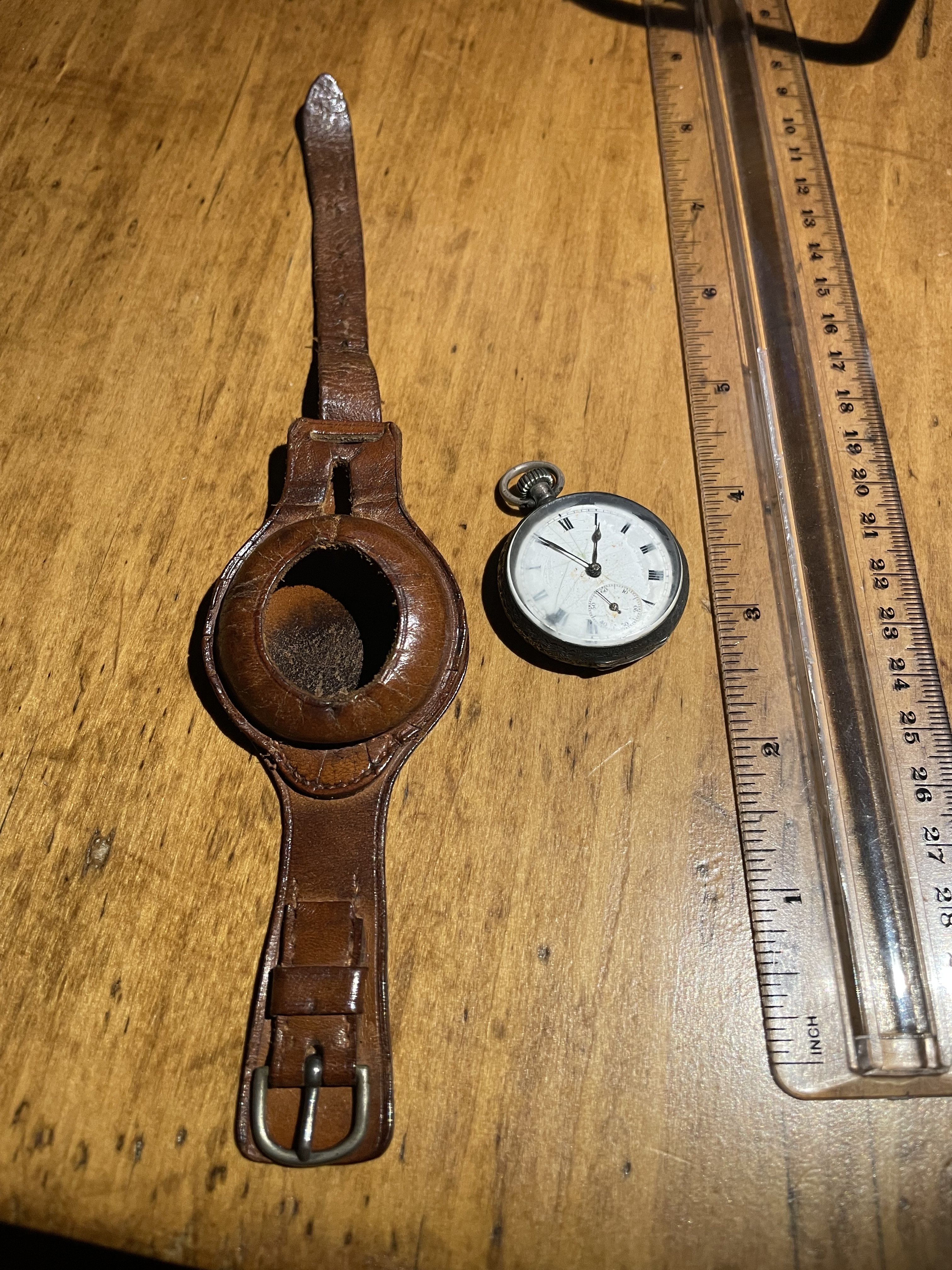 I was looking at a local on-line auction yesterday and one lot was simply described as “Curio Tray”. In the photo (you can see it here) was an old strap that I have never seen in person. It held either a watch or a compass. I bought the lot simply for that strap, in case I want to make some in the future. It contained a small Sterling case pocket watch. The watch does not work and is not worth fixing, but now I have that strap! The strap is designed to be worn with the buckle piece down. The strap is comfortable and keeps the little watch in place. I have a few similar watches that have fixed lugs. I think these are referred to as transitional (or something?). Canuck will know.