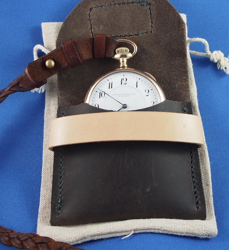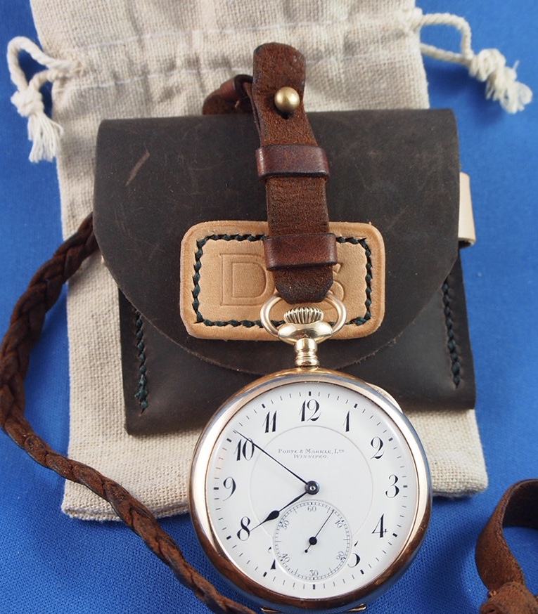 That @DaveK guy is at it again. I brave a -27° C day to trudge to our group mailbox, to find a package from him. Never one to toot his own horn, I thought It was up to me to show the contents of the package herewith. It is a beautiful leather pocket watch pouch, personalized, and in a draw-string linen sachet! So out came my private label Porte & Markle (Winnipeg) pocket watch on its @DaveK mystery braid leather lanyard, for a show and tell. I just know there will be a demand for these. The line-up forms to the left! 👍