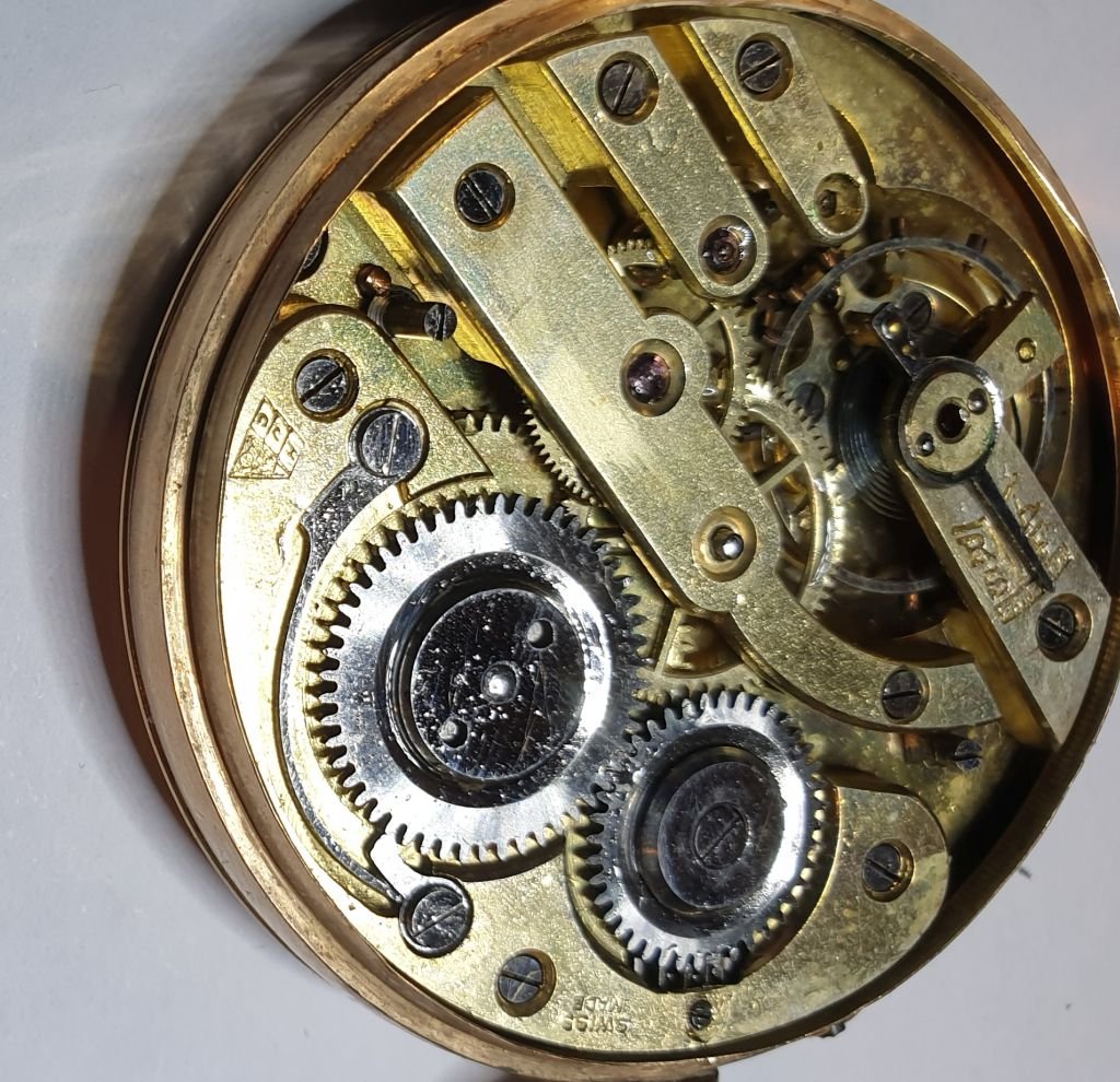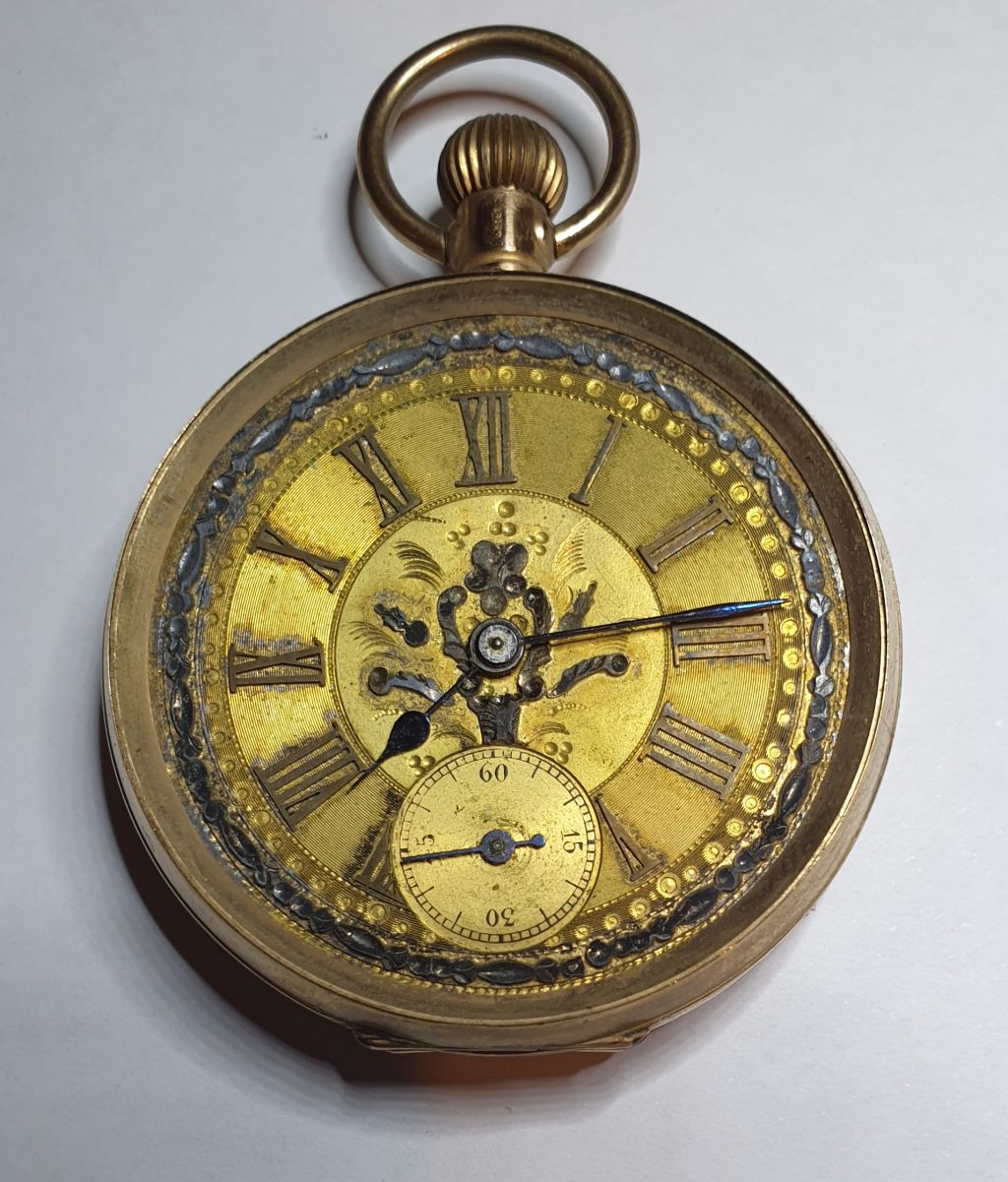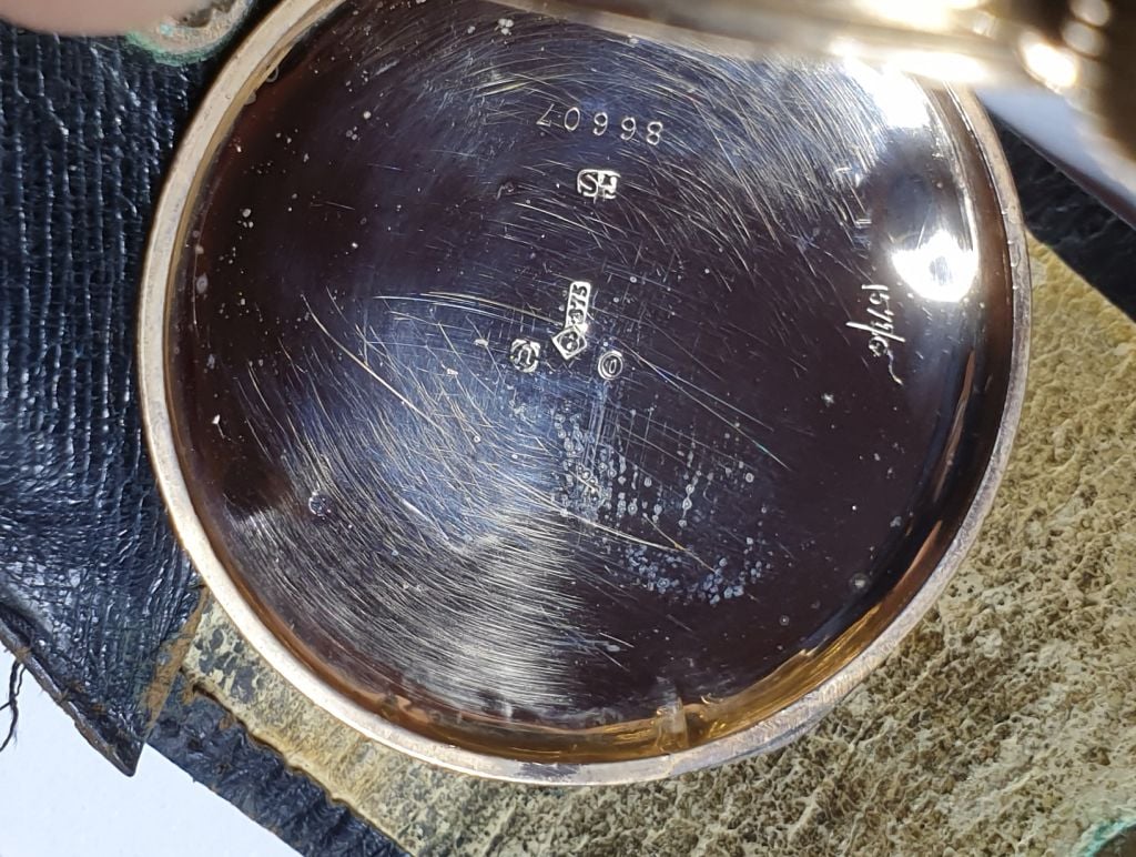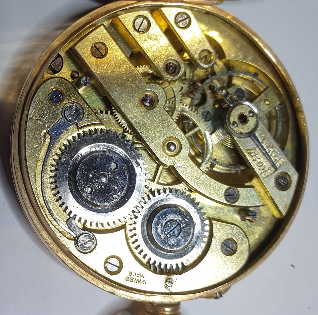 Now, the puzzle. 9 ct gold case, Pin adjustment, Swiss Movement with HJC stamped and a rather unusual face. All my life it has always been stored in a leather case with a French Jewellers address in Paris.