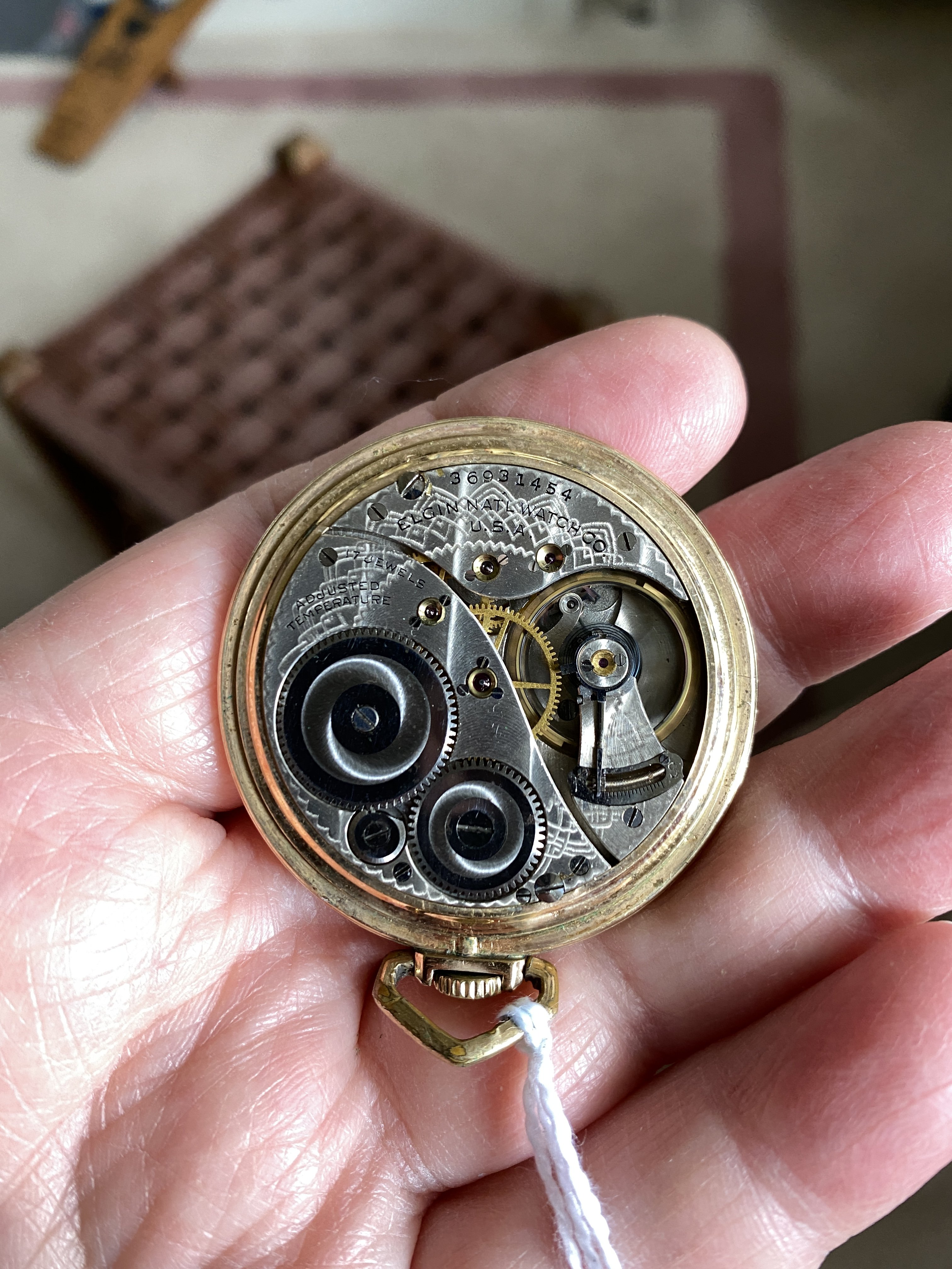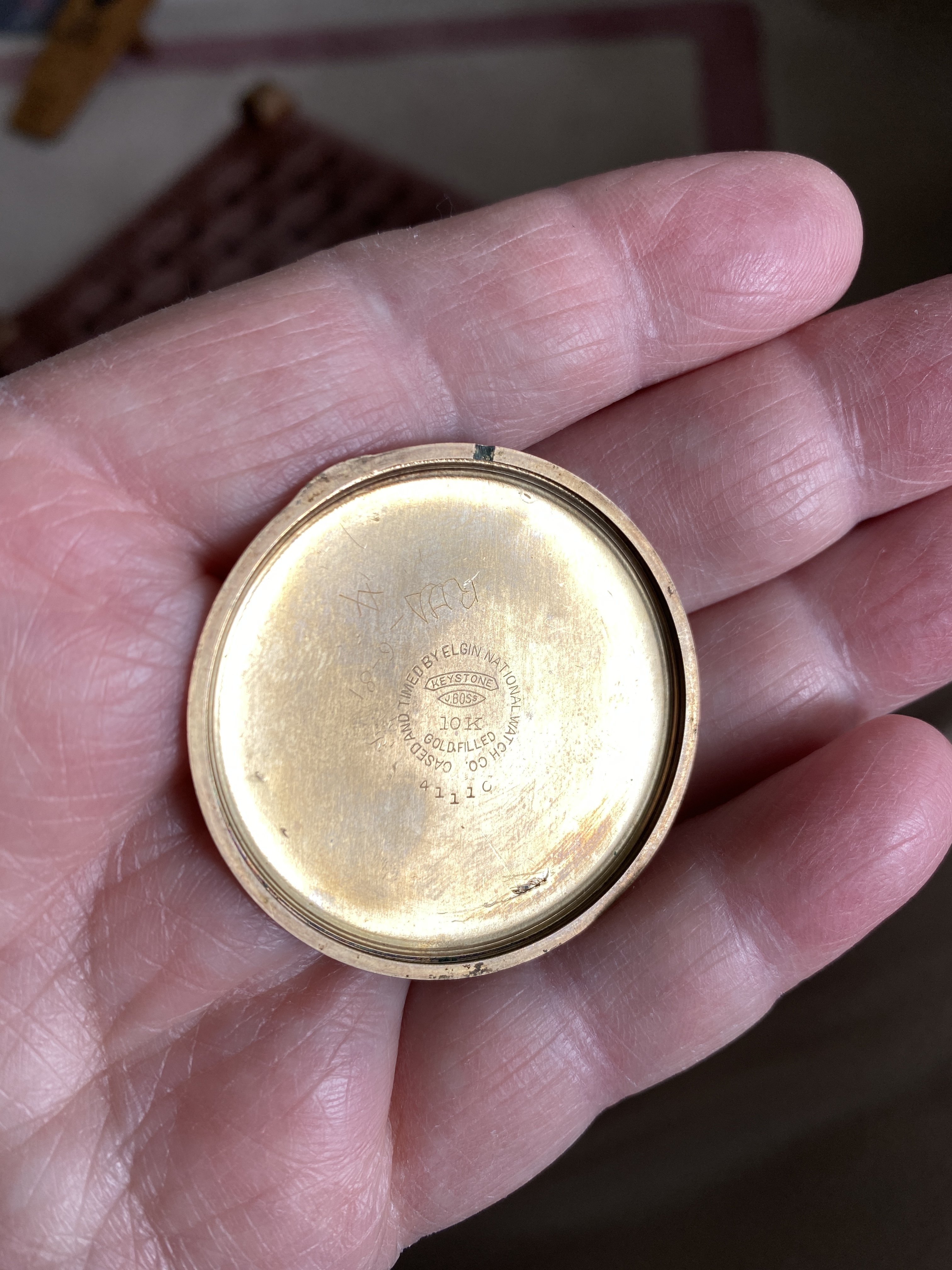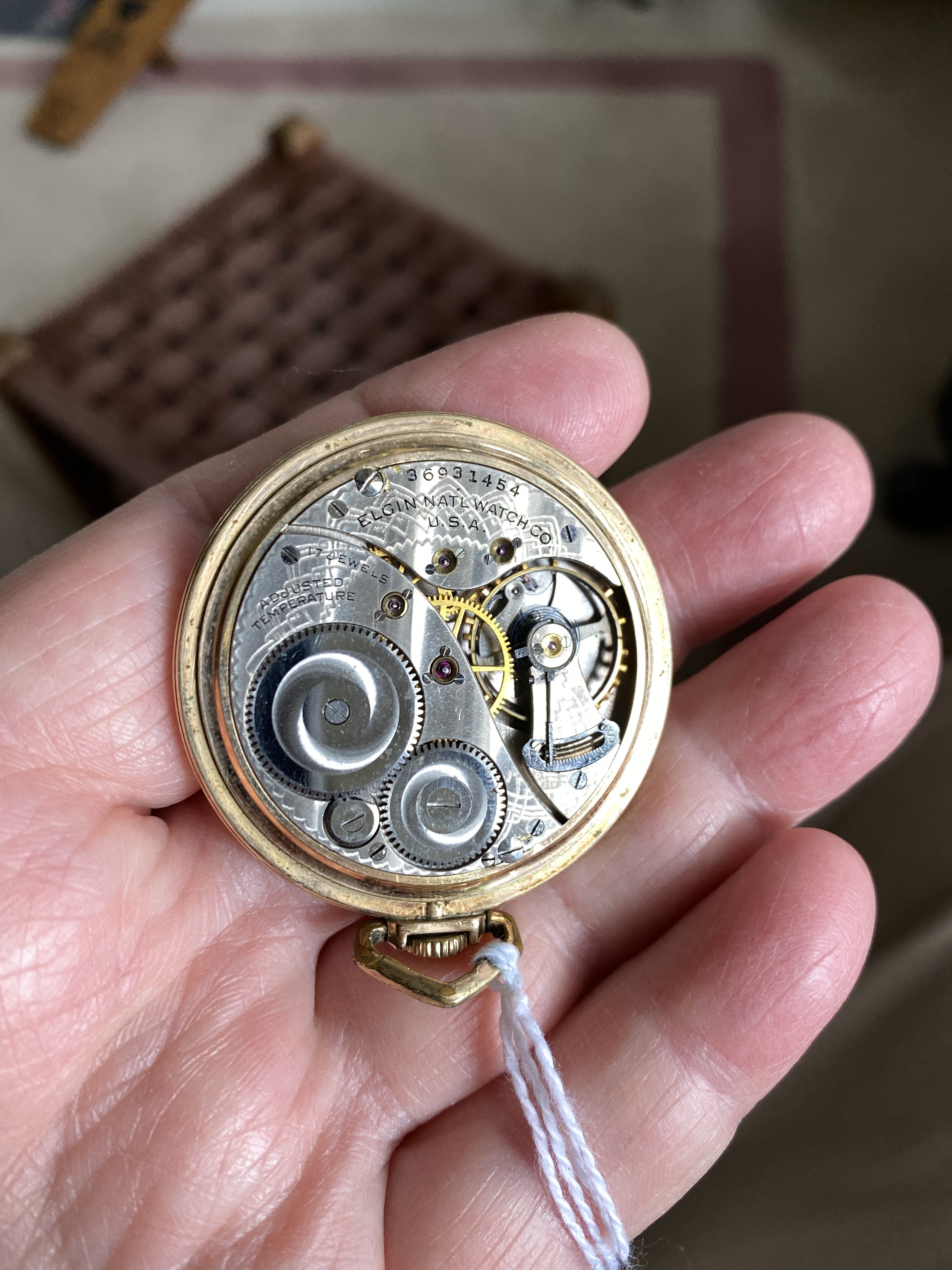 It is a 15-jewel, stem set Elgin model, Breguet hairspring, circa 1911. Only one repair number in the case. Case condition tells me it was worn for a very loooooong time with no maintenance. When it came time to get an estimate, there was so much work necessary, the owner walked away from it. I have NO idea how I acquired it, or where it came from. But I know it has sat in a drawer of scrap watches, for decades. In the movement picture, it might appear to not be running. It is! It runs beautifully!