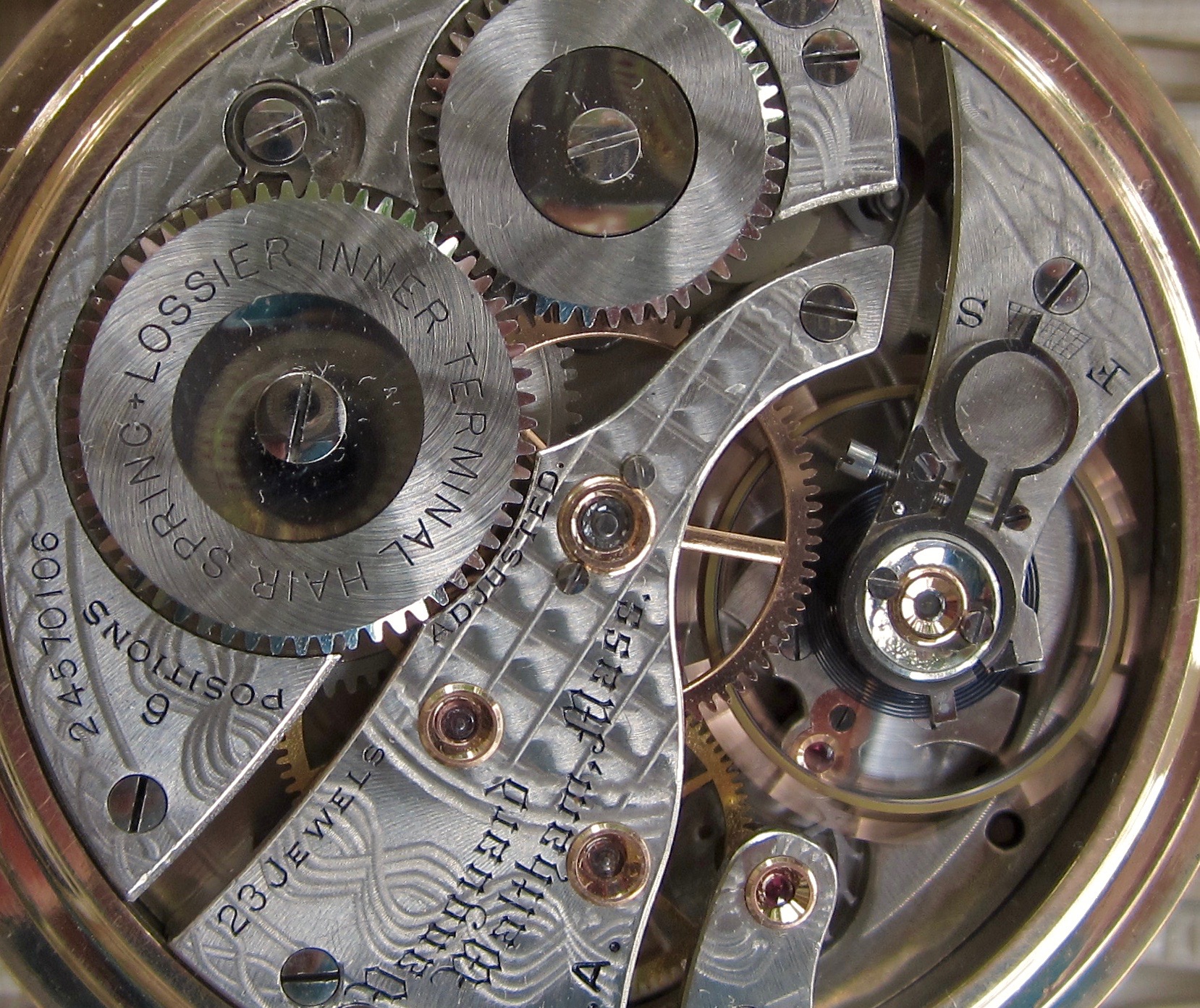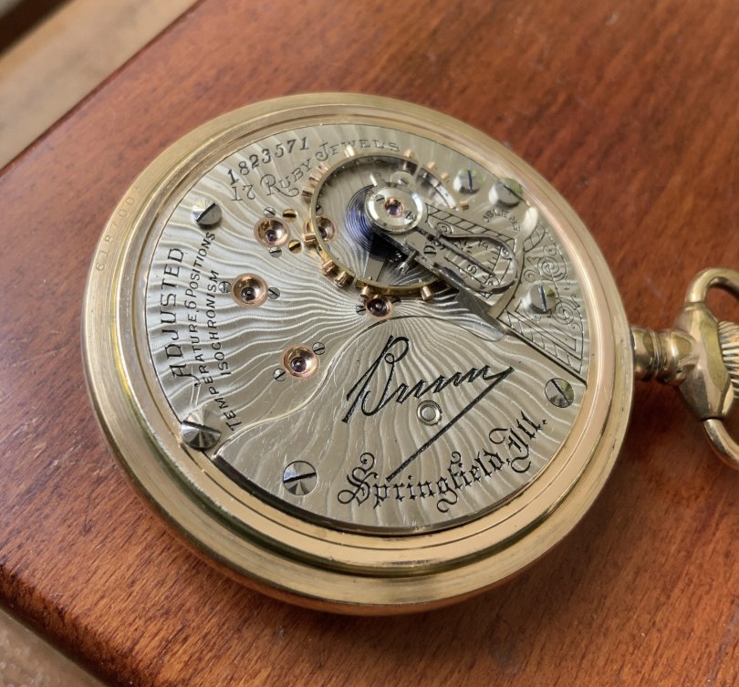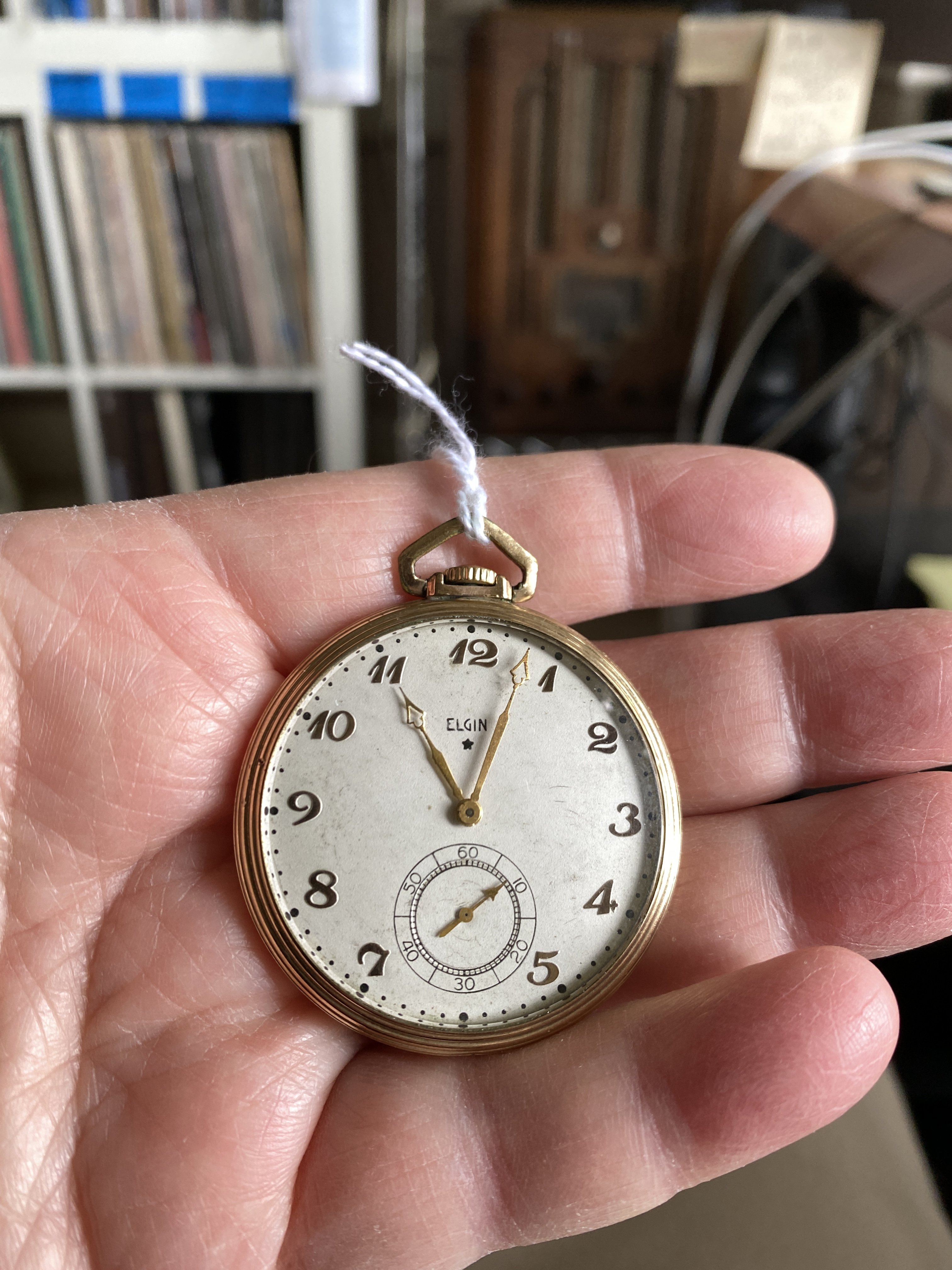 It is a 15-jewel, stem set Elgin model, Breguet hairspring, circa 1911. Only one repair number in the case. Case condition tells me it was worn for a very loooooong time with no maintenance. When it came time to get an estimate, there was so much work necessary, the owner walked away from it. I have NO idea how I acquired it, or where it came from. But I know it has sat in a drawer of scrap watches, for decades. In the movement picture, it might appear to not be running. It is! It runs beautifully!