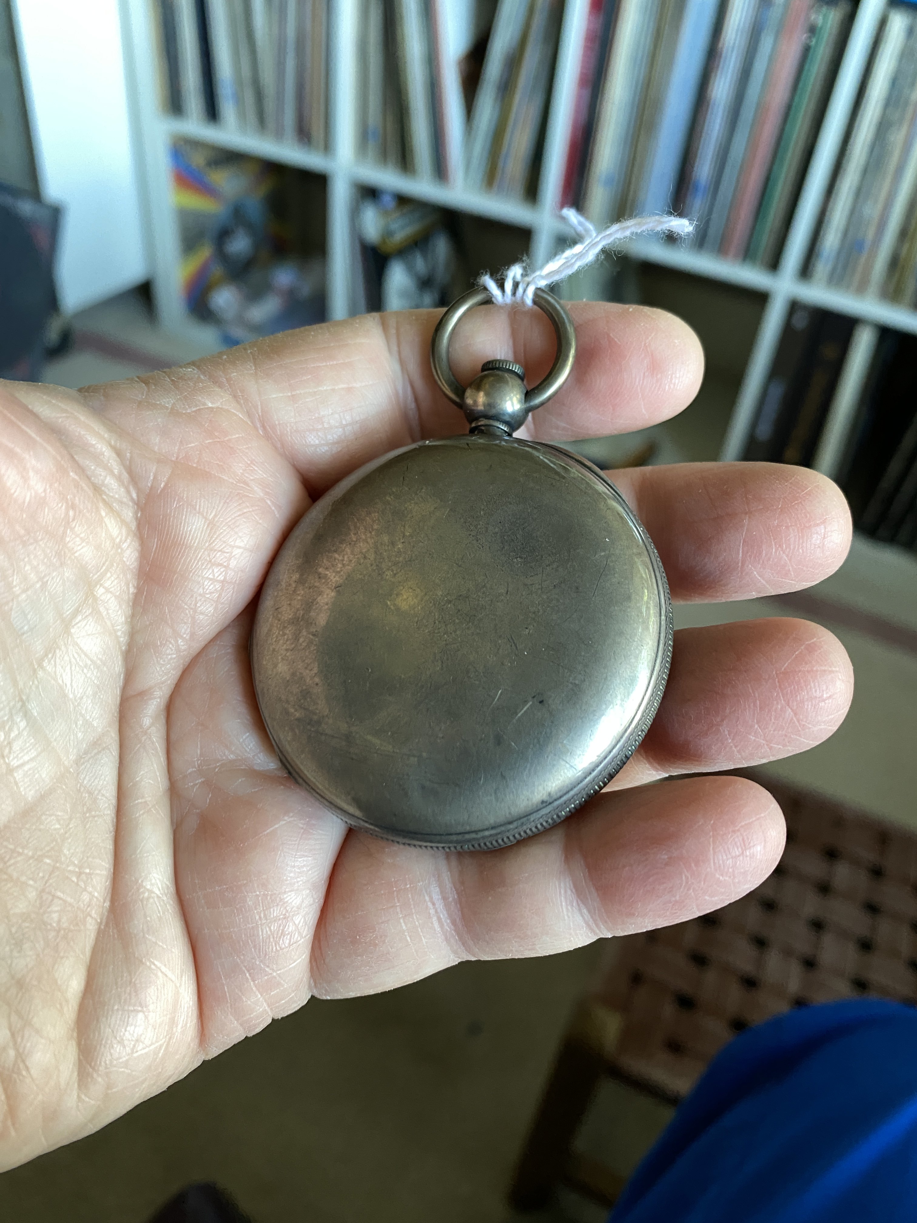 It needed a mainspring (I had a NOS genuine mainspring), a balance staff (I had a NOS genuine staff), a foot hole jewel for the balance staff (I had a NOS genuine jewel in the correct setting), a new crystal ( I had a NOS glass crystal of correct dimension), a seconds hand (I had one), and recondition. The case shows quite a bit of brass, so I cleaned that up, and resolved to find a better case for the movement. What you see is the finished result. I have a bit of work to do to bring it to a correct rate, but that will only if involve a few minutes. End result………I have a suitable watch available when someone wants it. I’ll GIVE them the watch, but they’ll have to foot the bill for the repairs I did.
