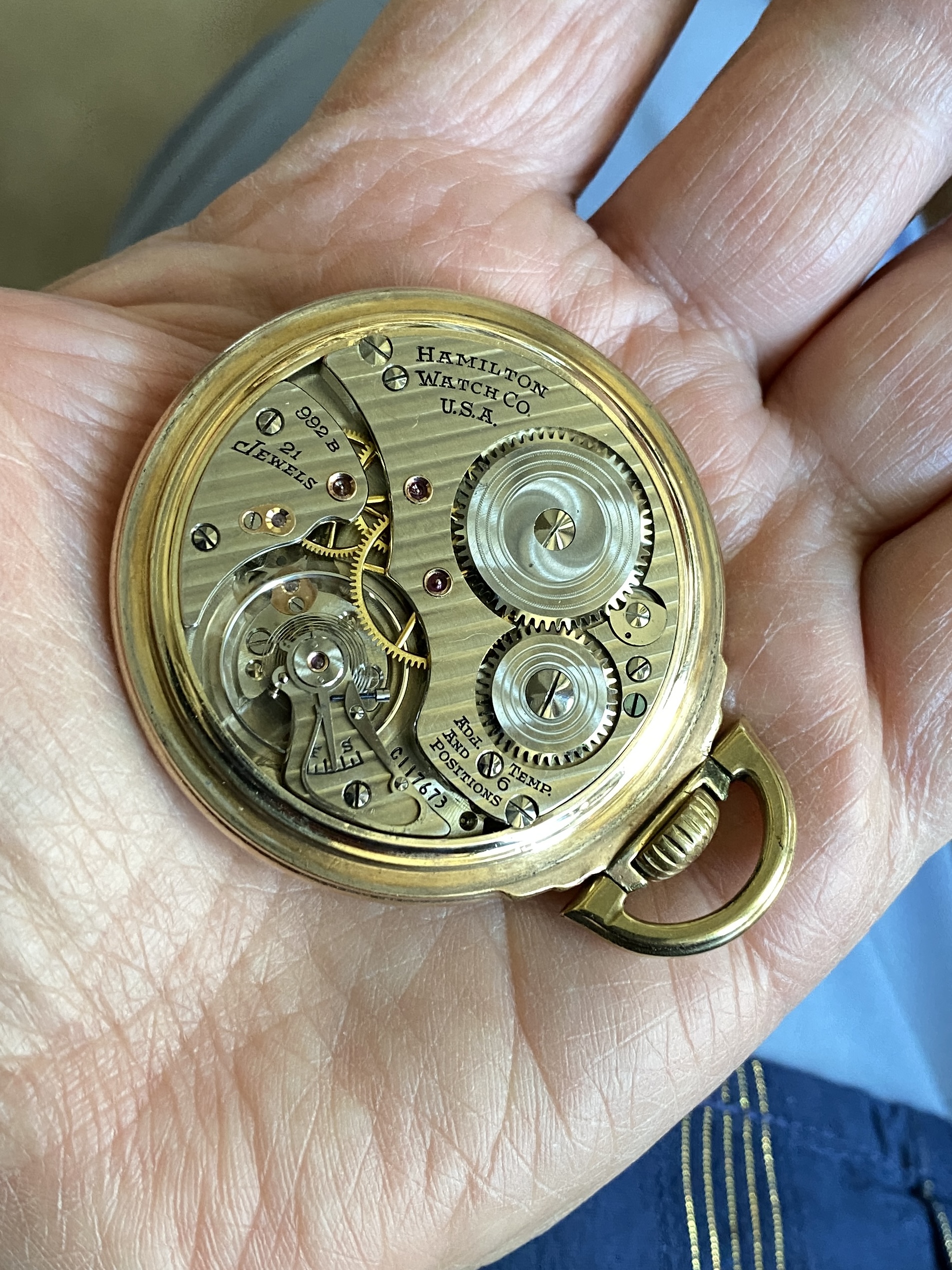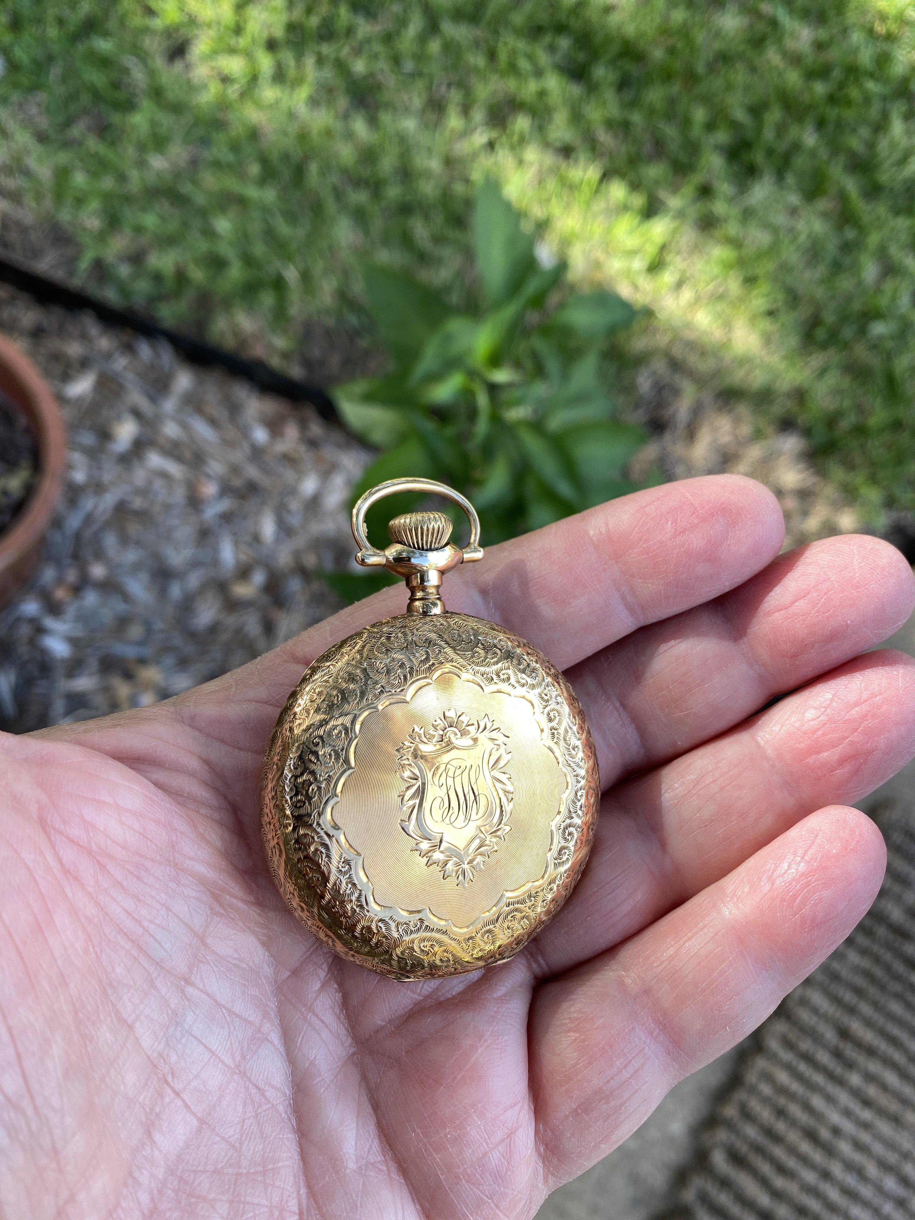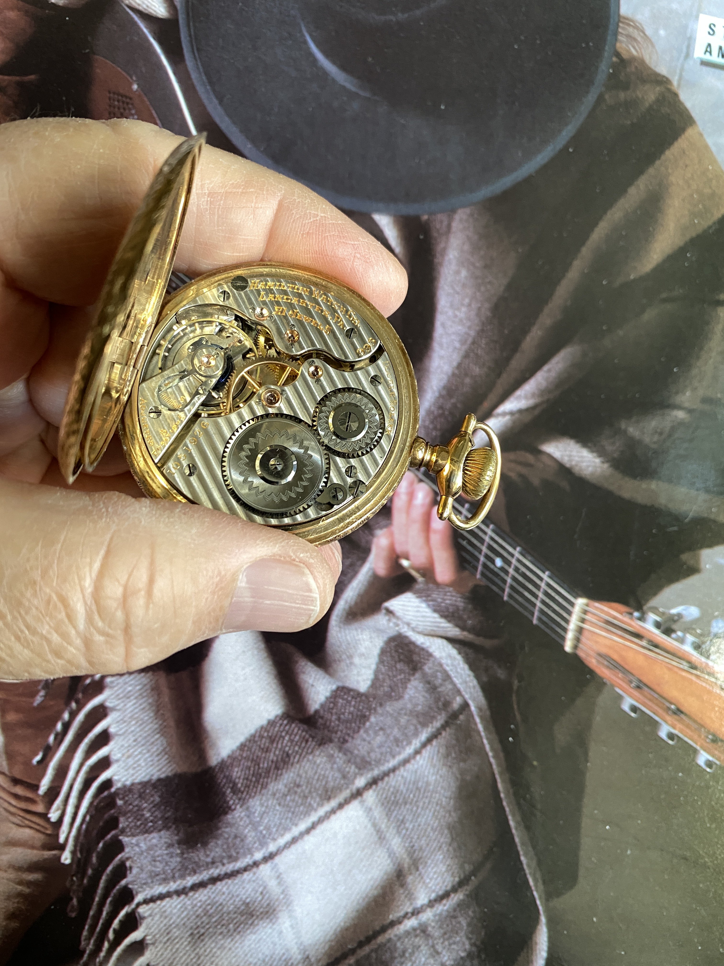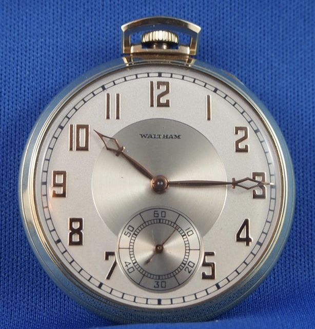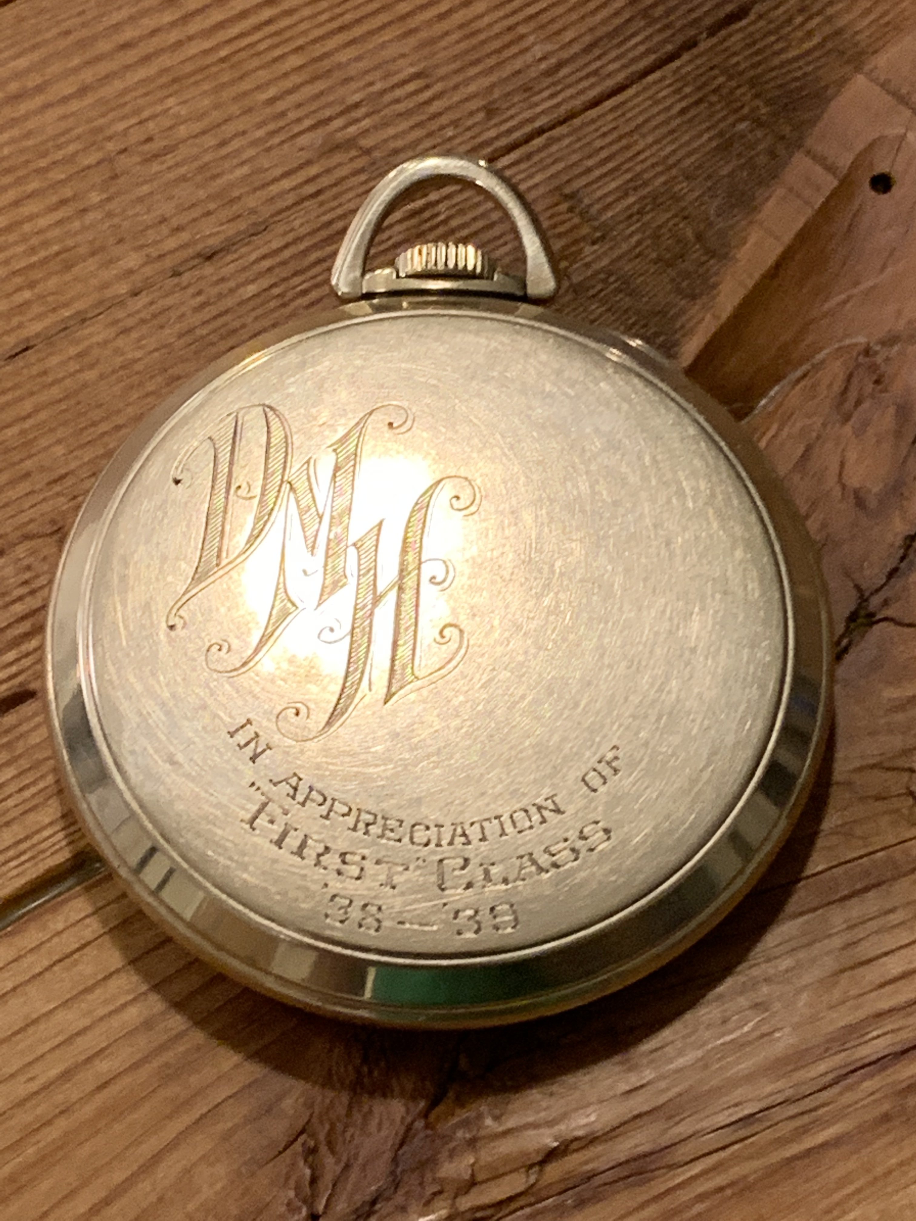 ·If you try to improve the worst areas, you run the risk of defacing the areas that are well preserved. Check with your shop and see what he says. But if it were mine, I’d leave it! (My Waltham Colonial from 1937 sends salutations.) mine came to me, complete with its original linen sachet with the Keystone Watch Case Co., label, the vinyl display case, and outer shell. It appears Mr. Kobel who received it as a presentation, never used it!