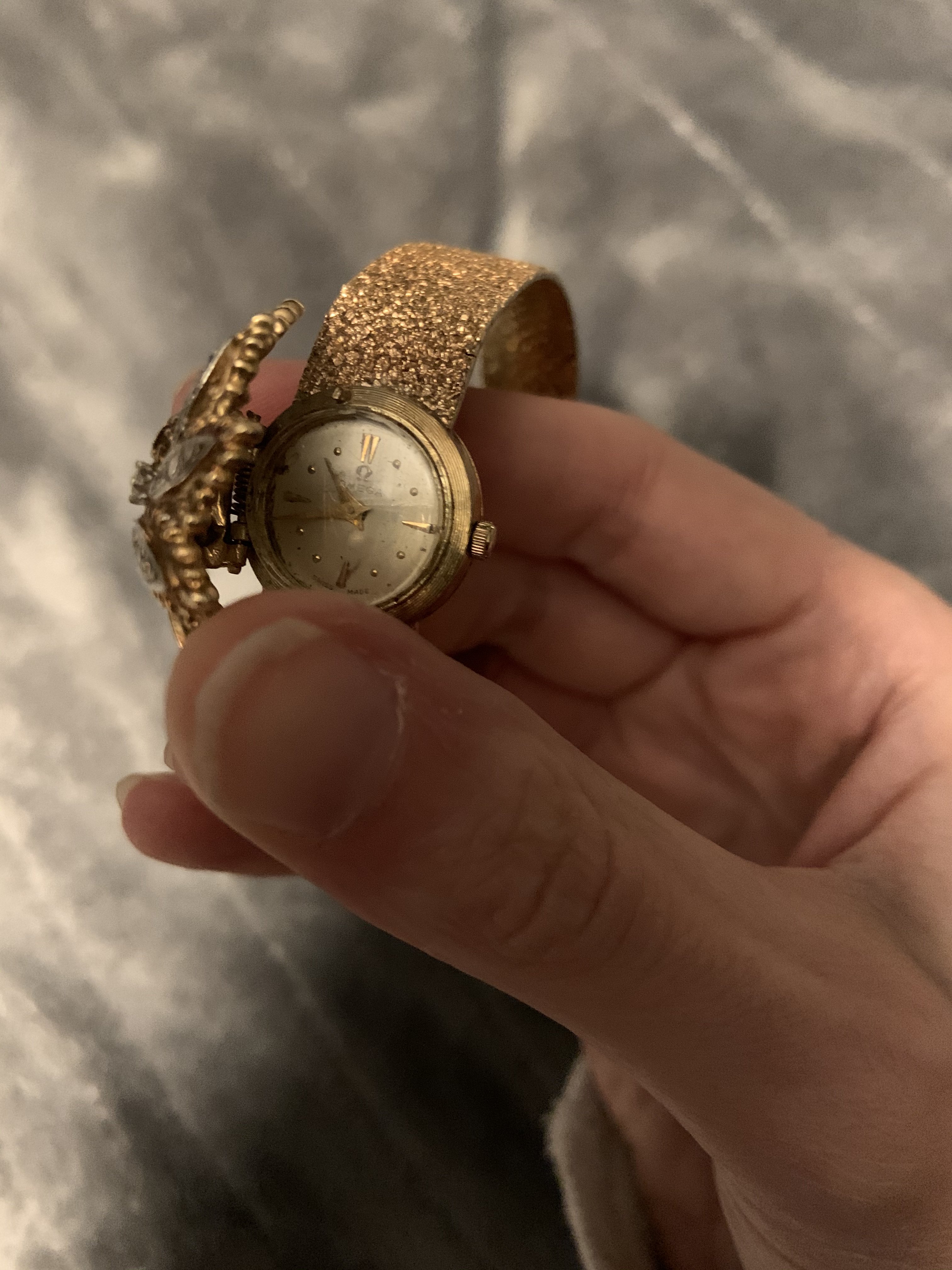 Posts 13,328 Likes 18,464 gatorcpa ·Dec 6, 2020·ΩF InvestiGator Ladies “bangle” watch from 1940’s through 1960’s. Omega made hundreds of different styles of these. Many are unique. You should take it to a watchmaker/jeweler and have the stones looked at for authenticity. gatorcpa