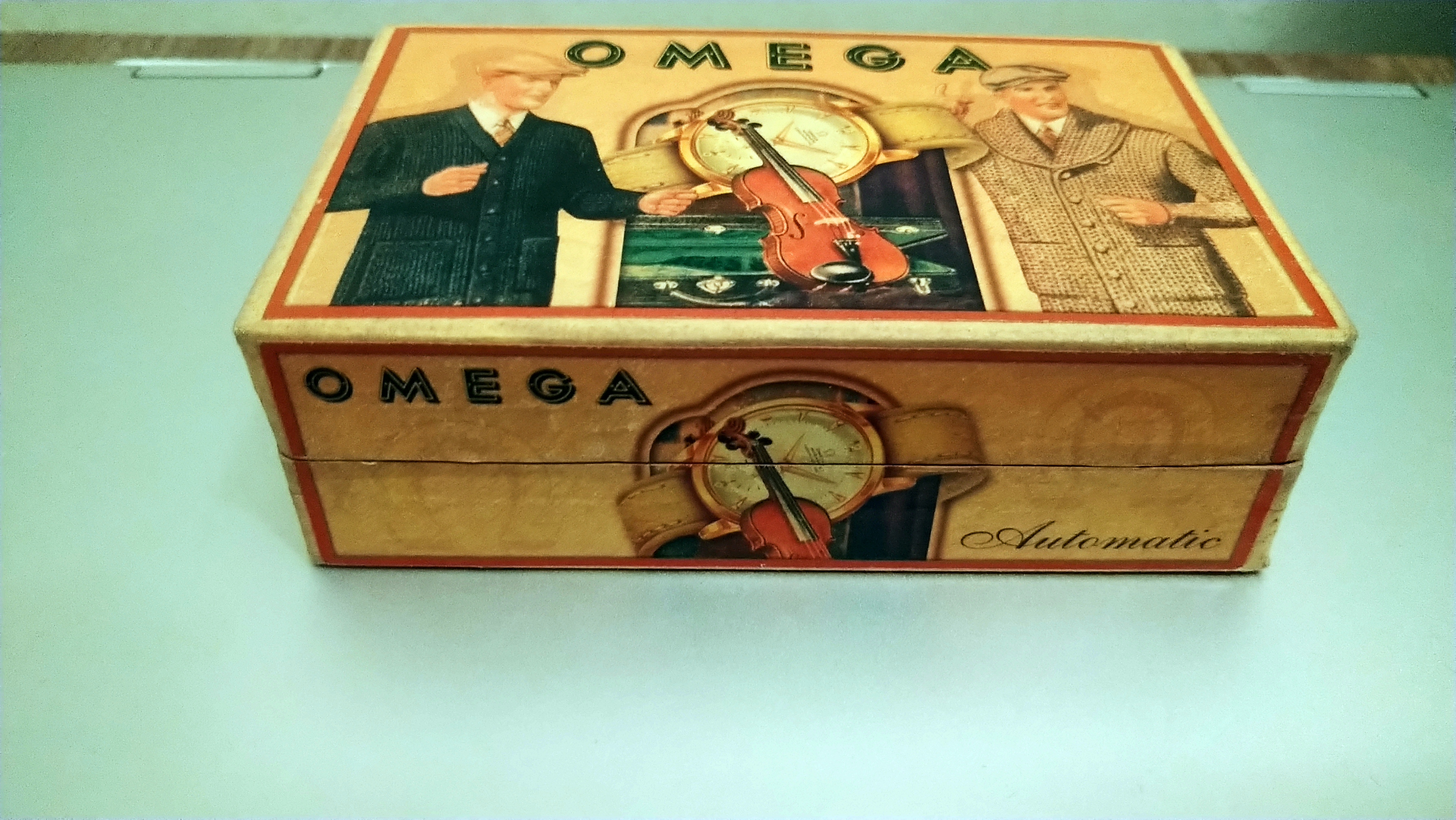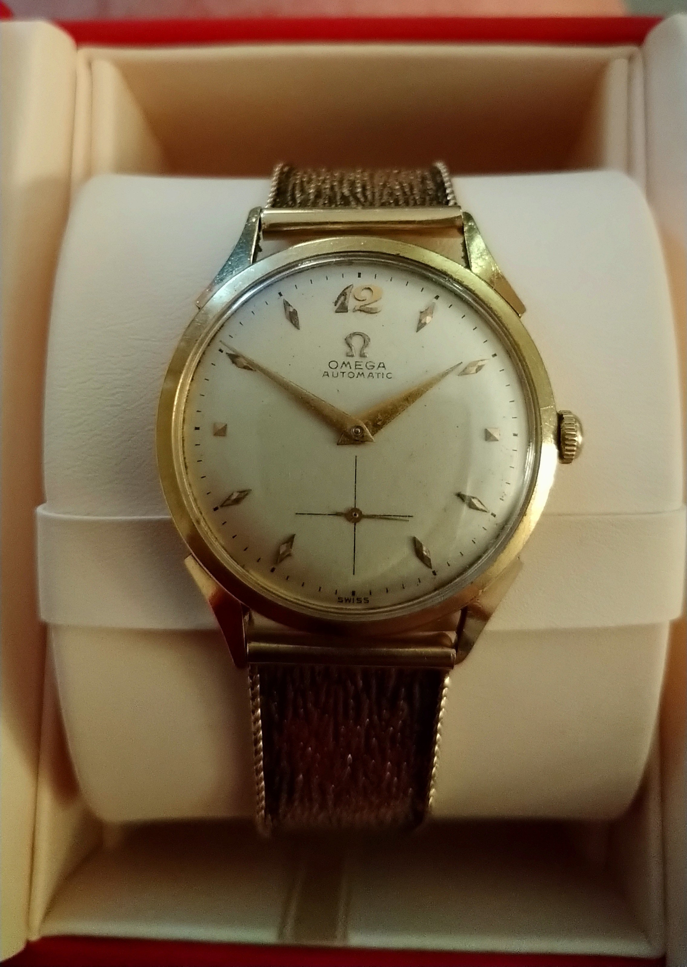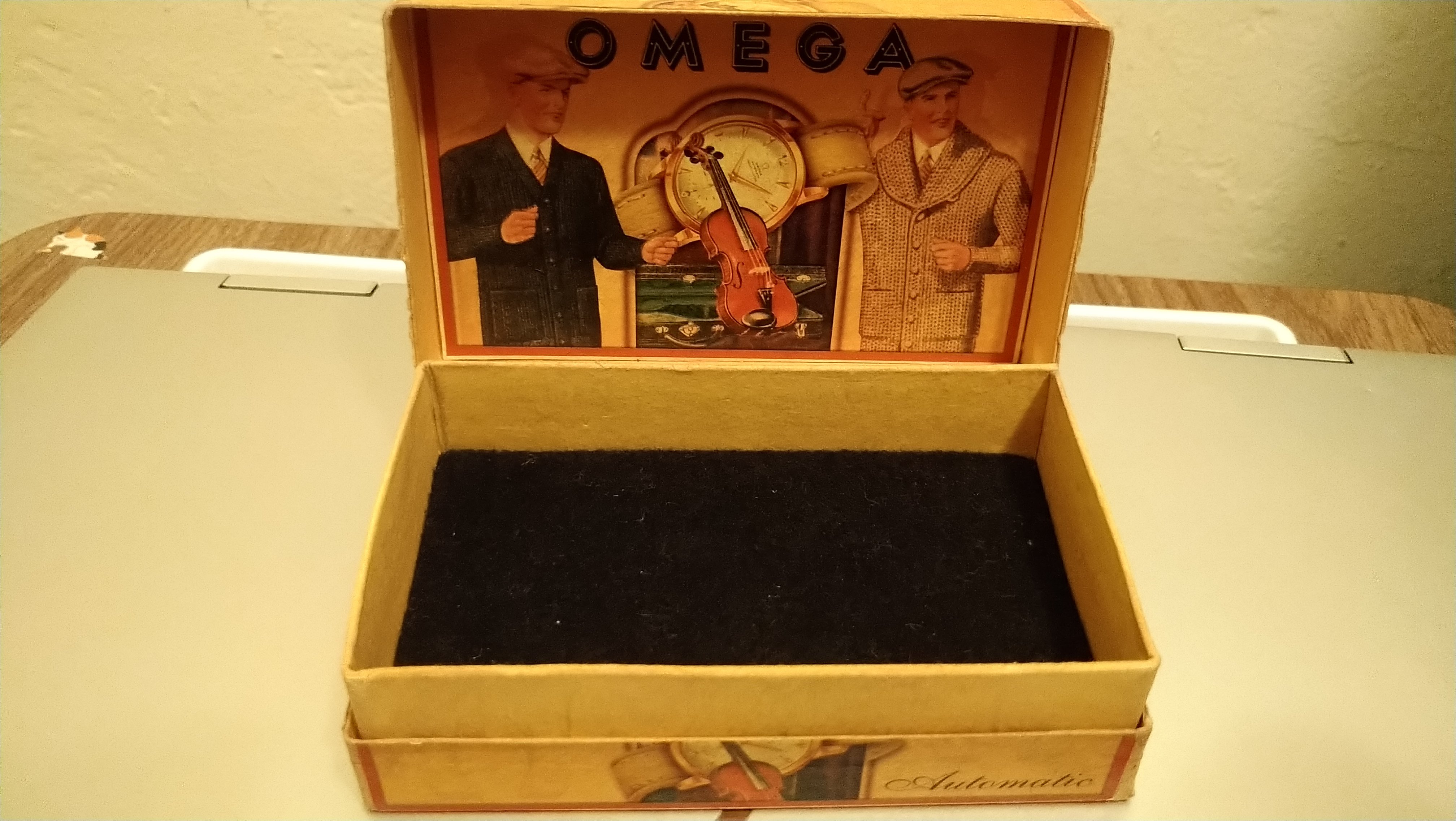 I was also looking for a vintage box to keep it in. Found this box (pics included) on Ebay for $25. Claims to be a late forties box. Is it legit? The watch in the box image looks very similar to my dad's watch, though it has more Arabic numerals on the dial. So I thought it would work well. Interestingly enough the guy at the official service center gave me a free modern Omega watchbox, so now I have two.