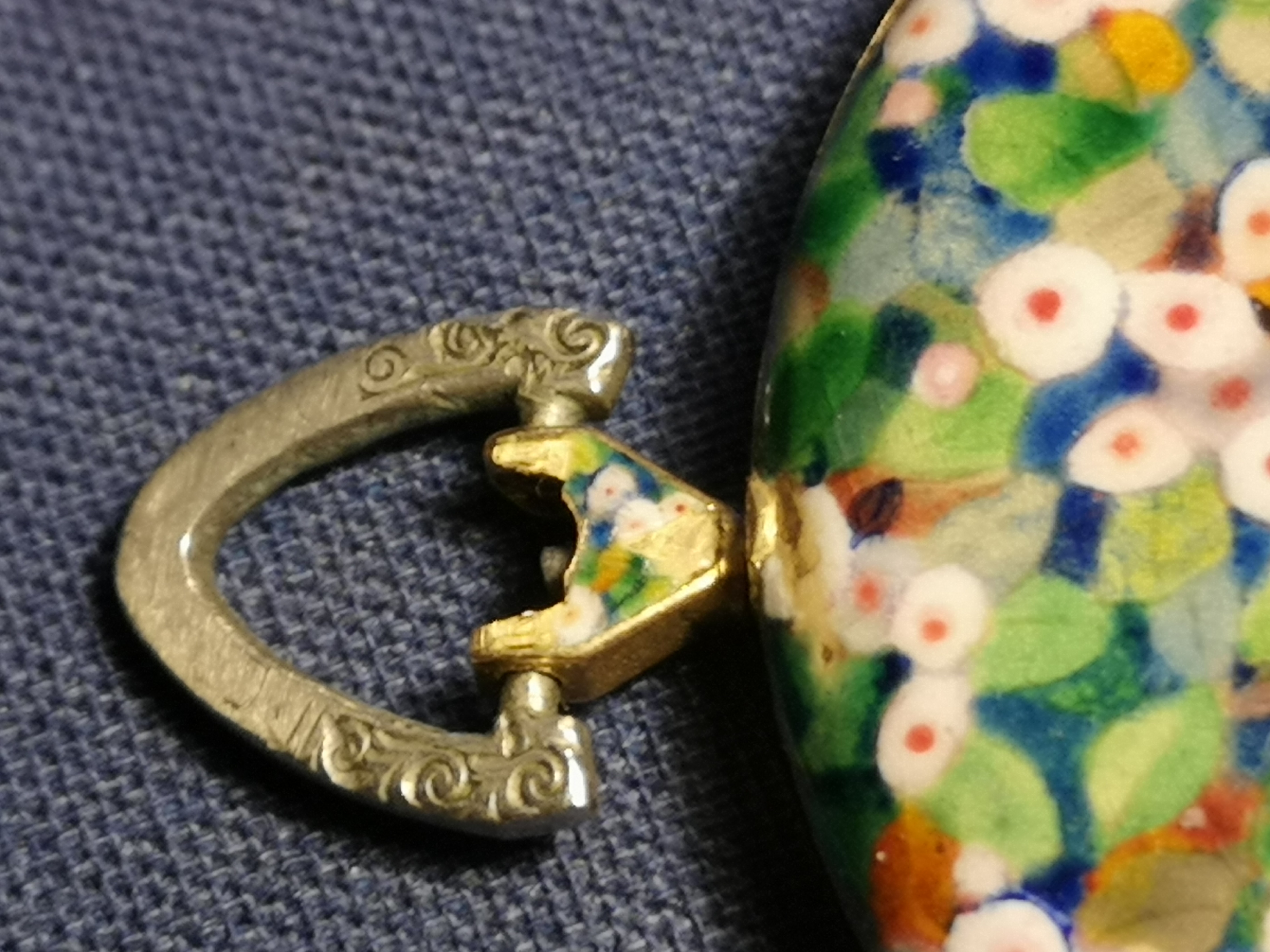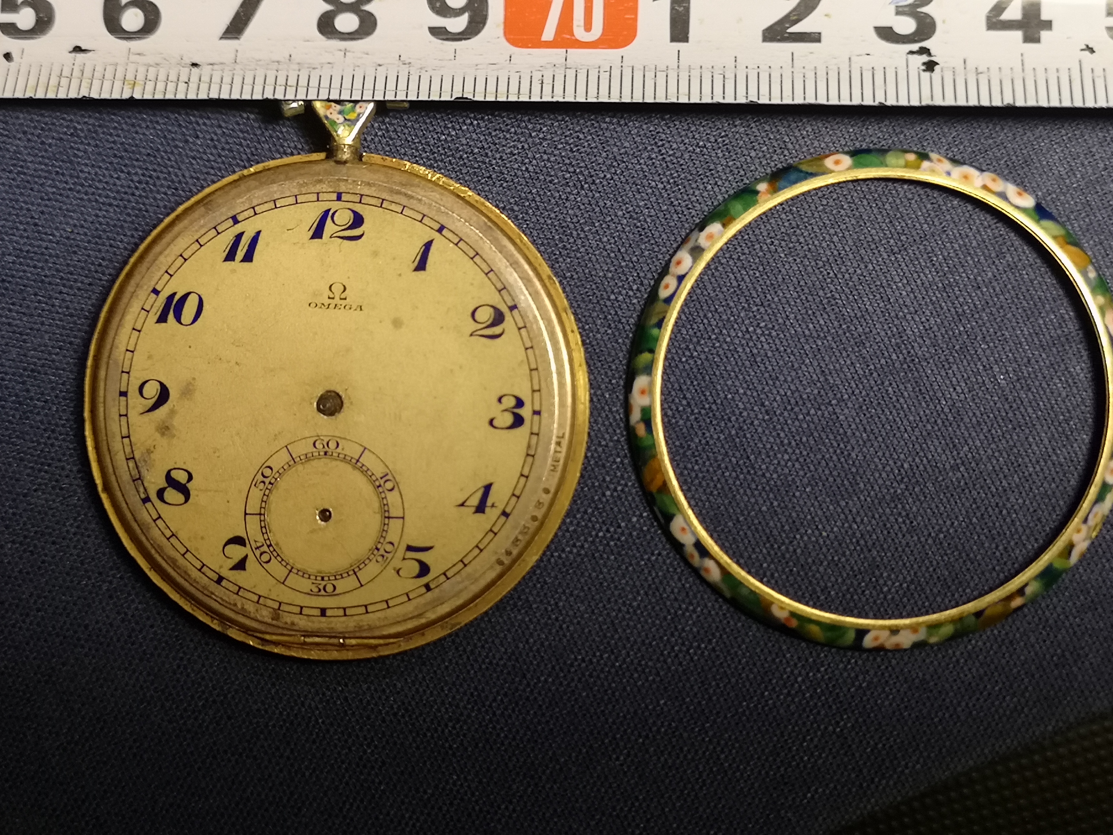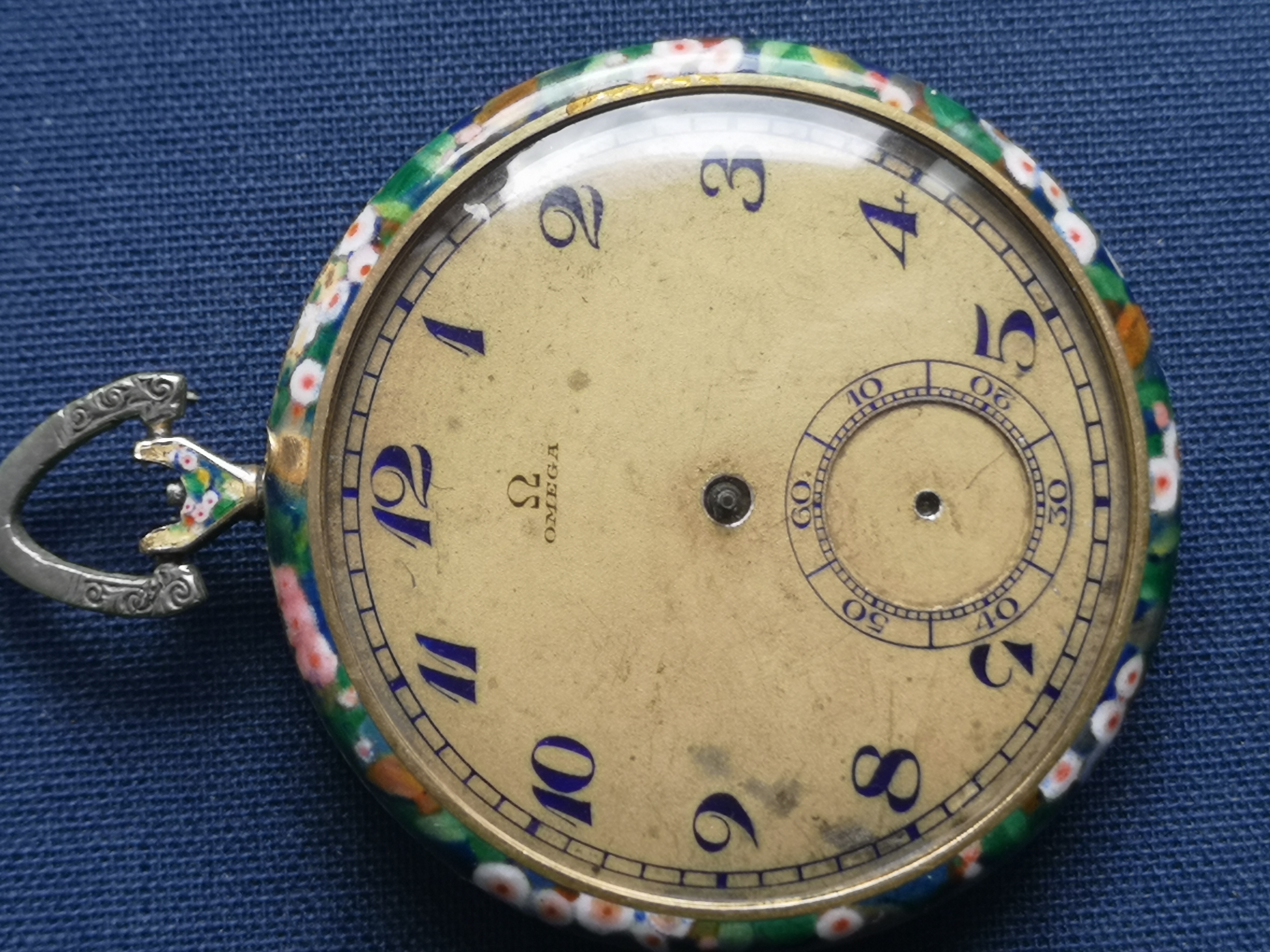 The case is decorated in what I would describe as Limoge enamel. Vari-coloured vitreous enamel, all hand painted. The amount of labor involved in producing such a splendid example would have been huge. I would guess there would be about six distinct colours of enamel, each colour would require a separate firing in a kiln. Vitreous enamel will last forever.......unless the item gets smacked around. The enamel on this one looks to be in superb condition. The cartouche with the black enamel appears to be done in cloisonnè enamel. The case is probably French. Worthy of being returned to operating condition!
