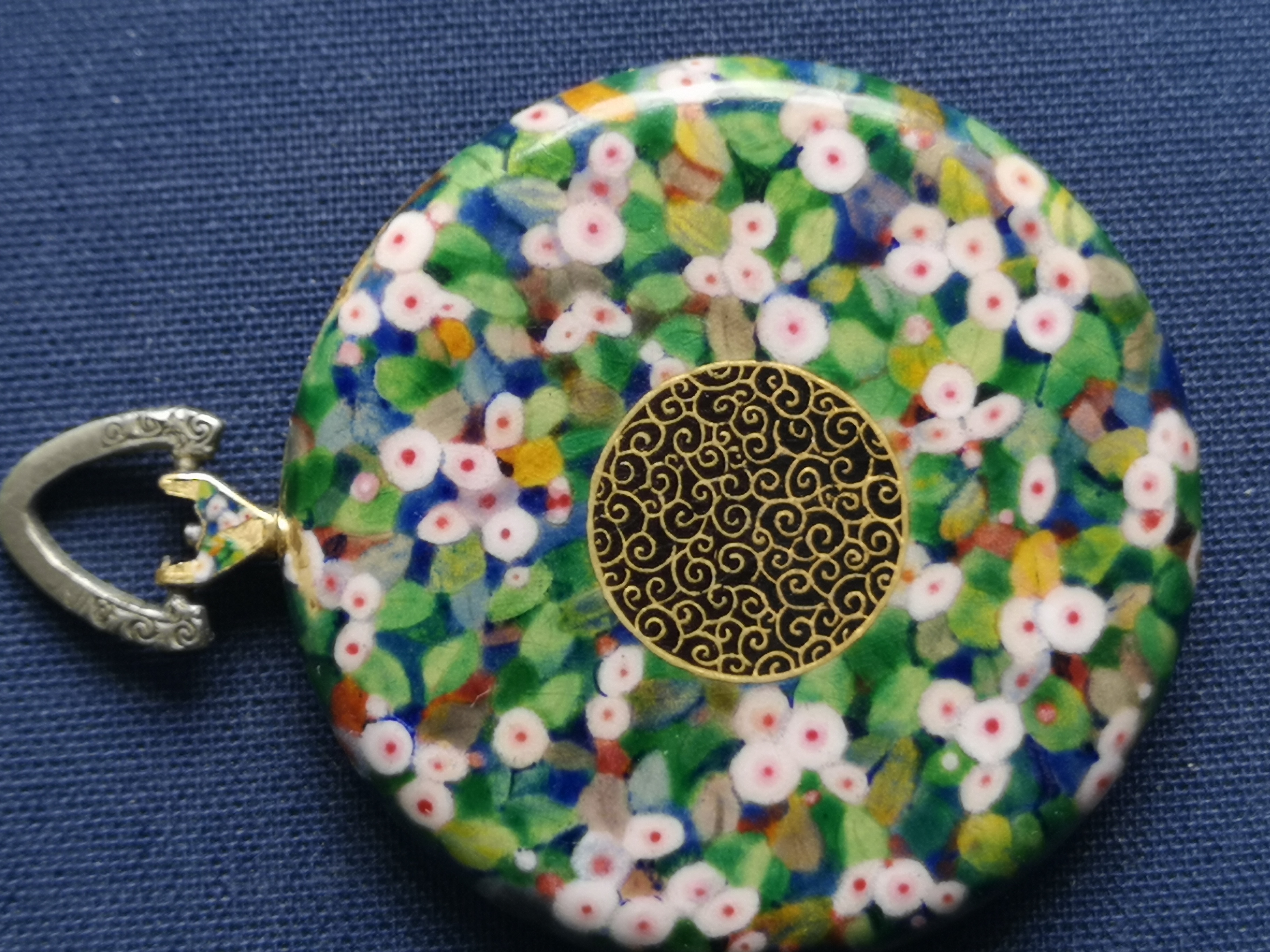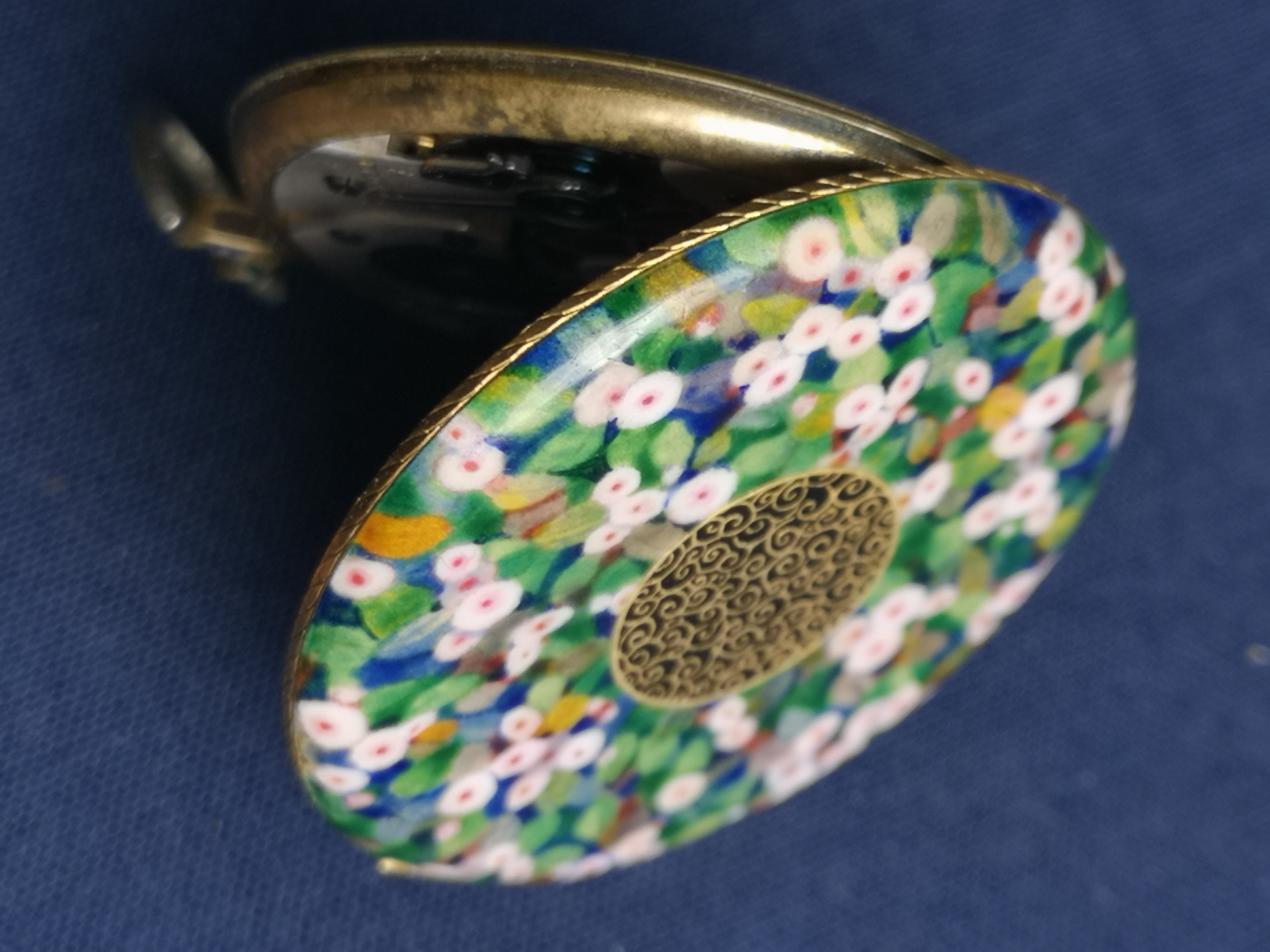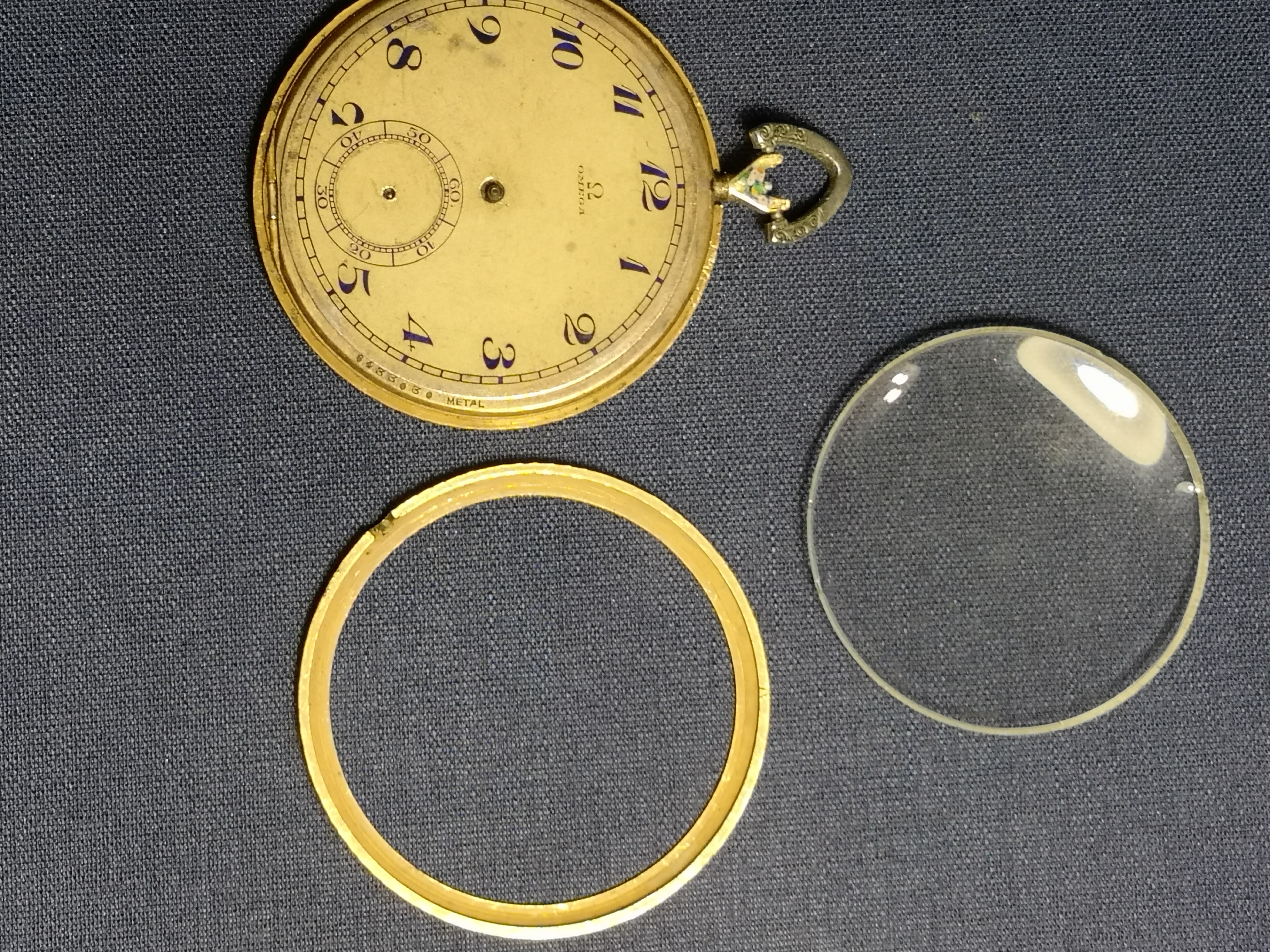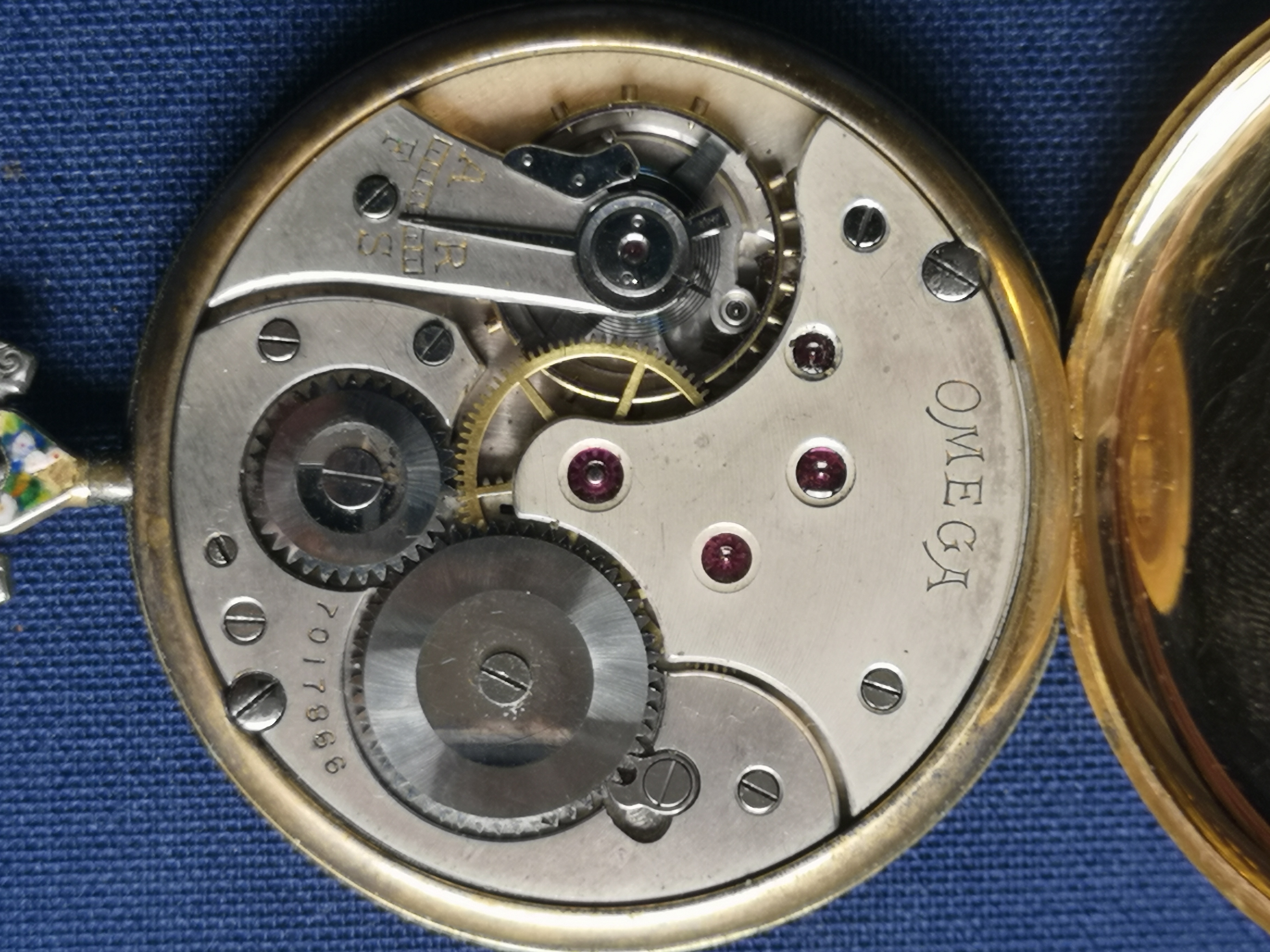 The case is decorated in what I would describe as Limoge enamel. Vari-coloured vitreous enamel, all hand painted. The amount of labor involved in producing such a splendid example would have been huge. I would guess there would be about six distinct colours of enamel, each colour would require a separate firing in a kiln. Vitreous enamel will last forever.......unless the item gets smacked around. The enamel on this one looks to be in superb condition. The cartouche with the black enamel appears to be done in cloisonnè enamel. The case is probably French. Worthy of being returned to operating condition!