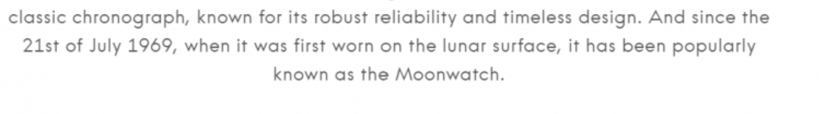 "And since the 21st of July 1969, when it was first worn on the lunar surface, it has been popularly known as the Moonwatch." I agree with you that "it's all one sentence with one meaning", so my read is that according to Omega, every Omega Speedmaster Professional ever manufactured per specs that were in-place on 7/21/1969 and all design iterations thereafter, have all "been popularly known as the Moonwatch." And that includes the 2021 model with the 3861 movement. I'm unclear on your personal position on the 3861 movement's entitlement to the honor of being called a "Moonwatch", it sounded to me as though you're in the "it's not a Moonwatch camp", but whatever it is you're certainly entitled to it. The debate was about Omega's position on the matter, which I think is clear from the sentence.