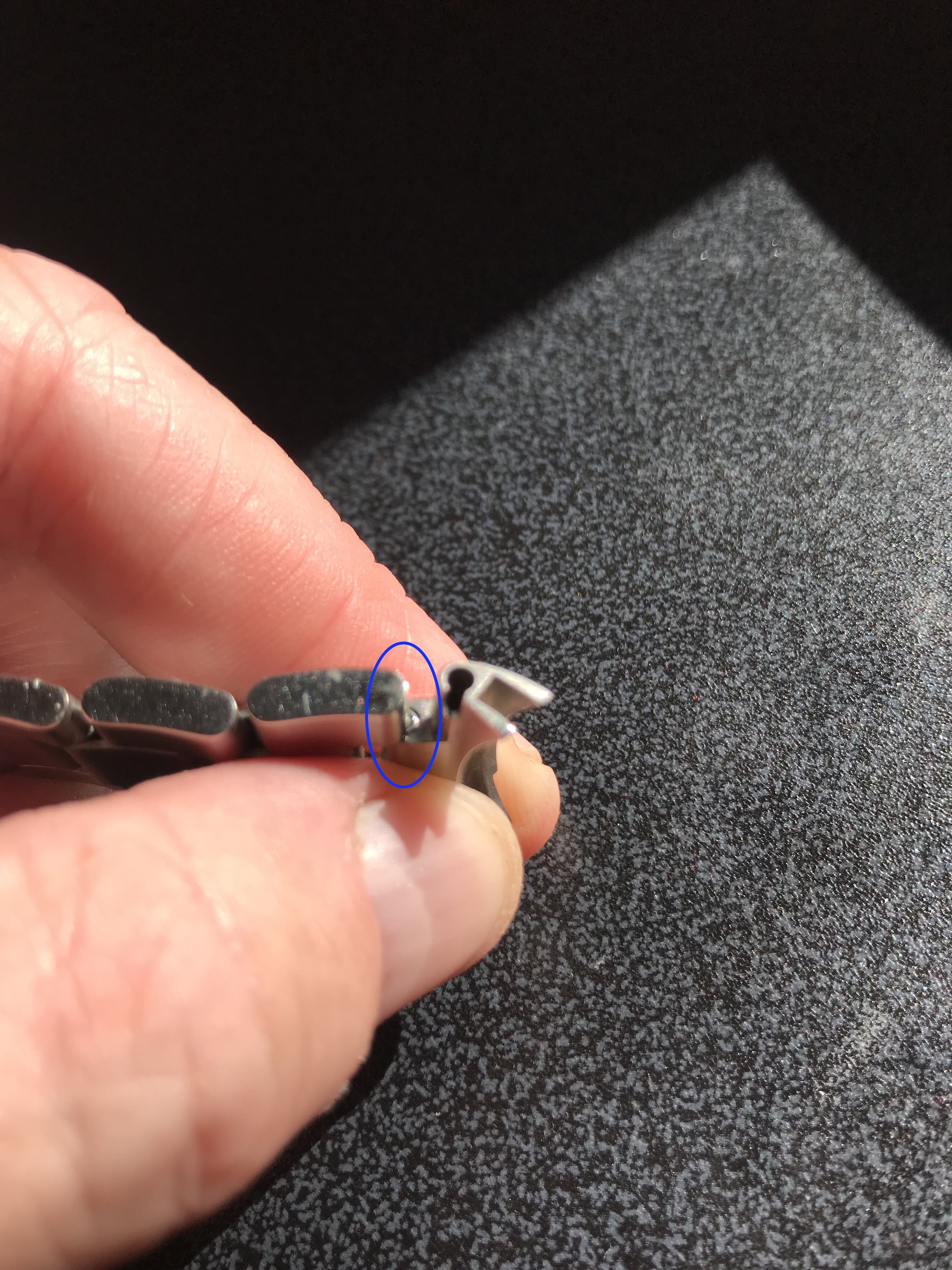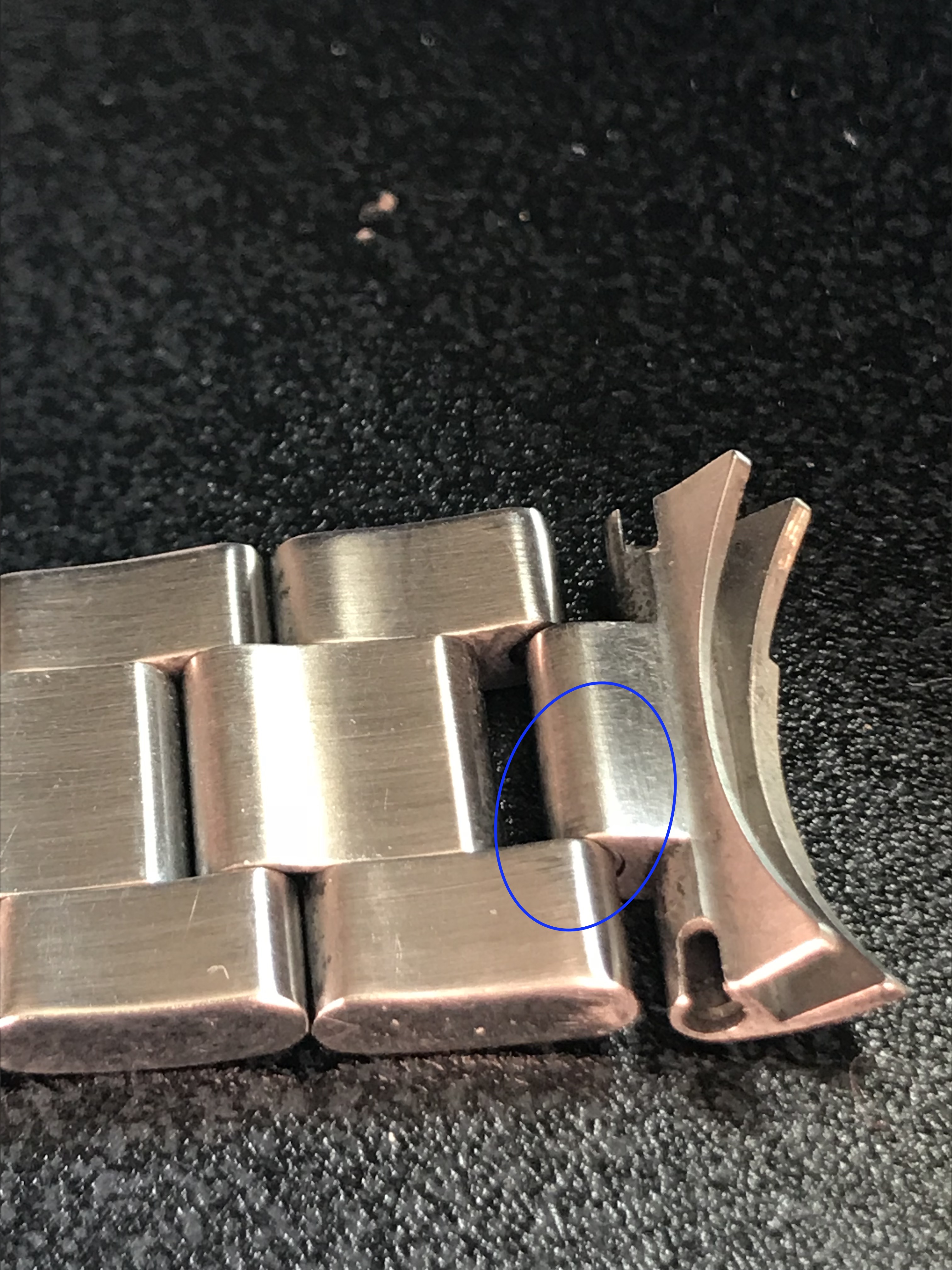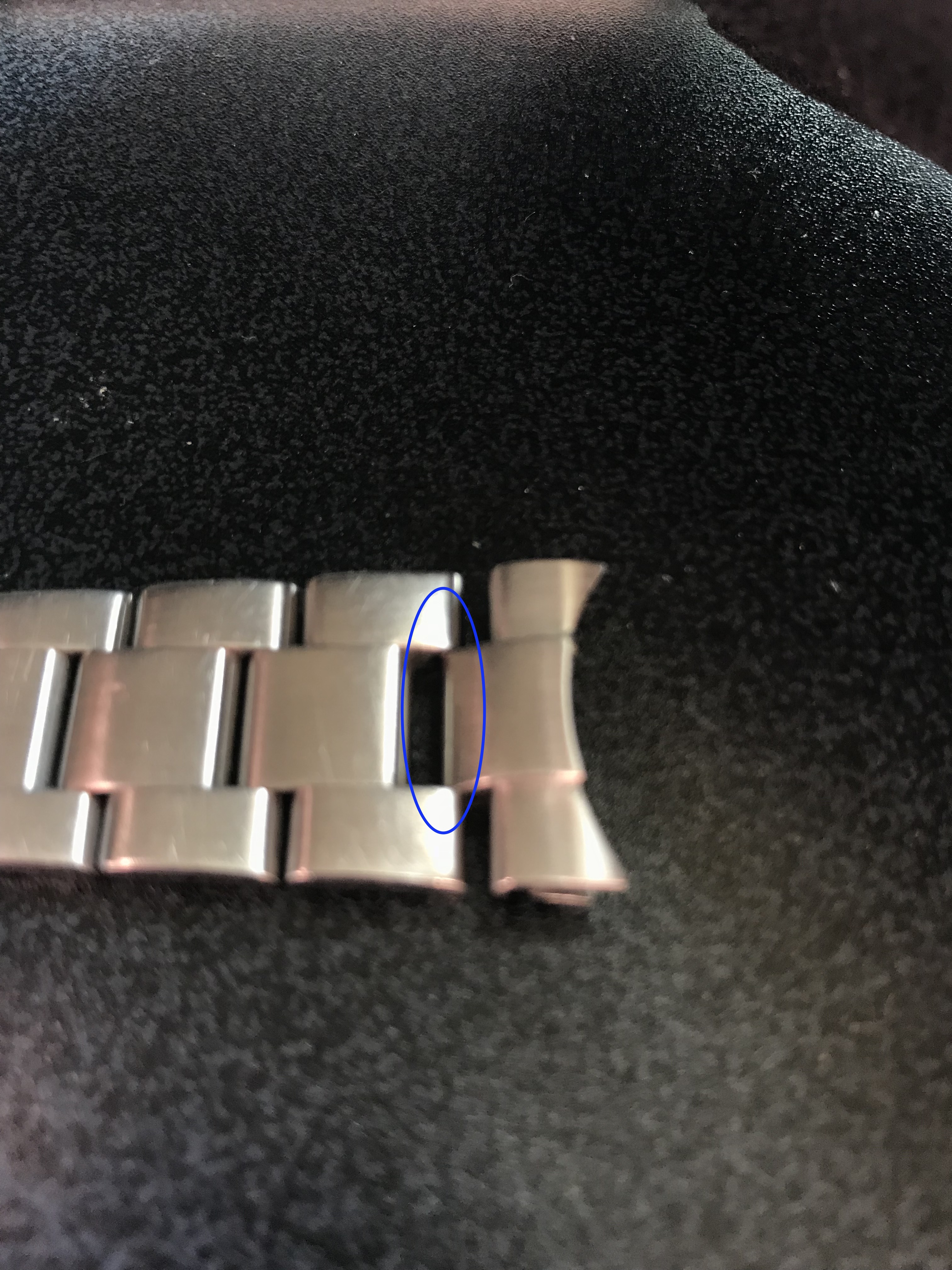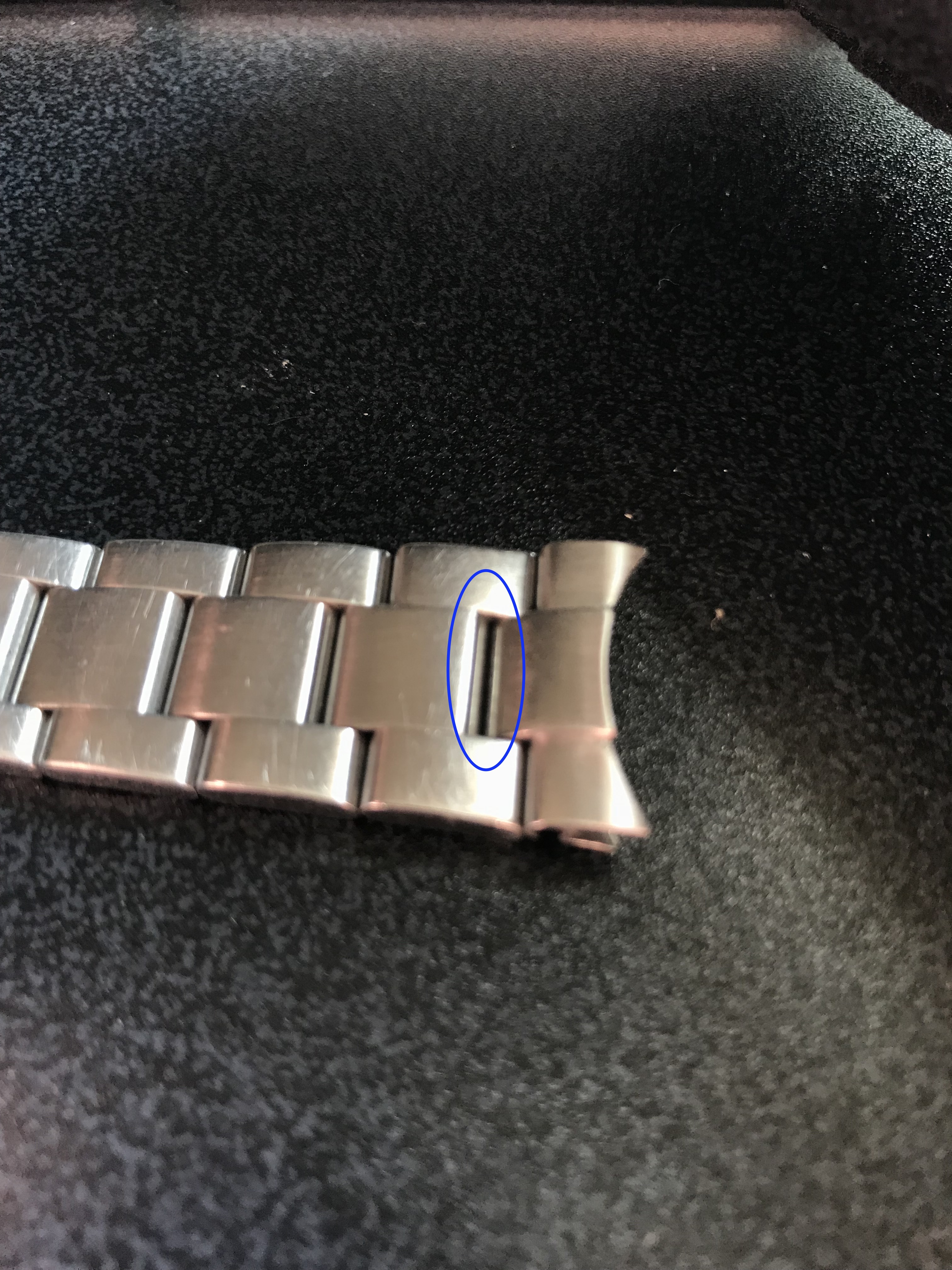 ·While shaving the other morning, I noticed in the mirror that there was a gap at the 12 o'clock side between the end link and the next "permanent" link. Upon examination, it seems that the pin in there has somehow got bent and there's now 2-3mm vertical "travel" between the two links. I have no idea how this happened, but I've just got it back from a "non-official" service centre where they were recalibrating the watch. I don't remember this gap being there before, but I can't be certain. Anyway. Here's a couple of pics..