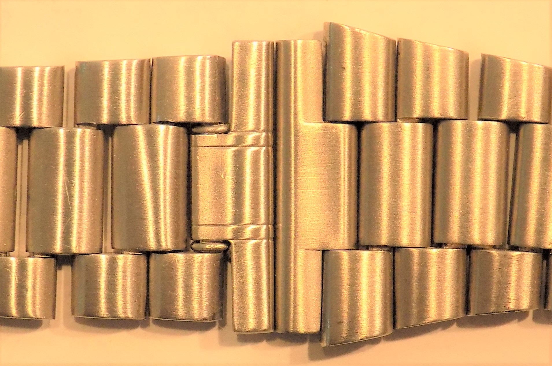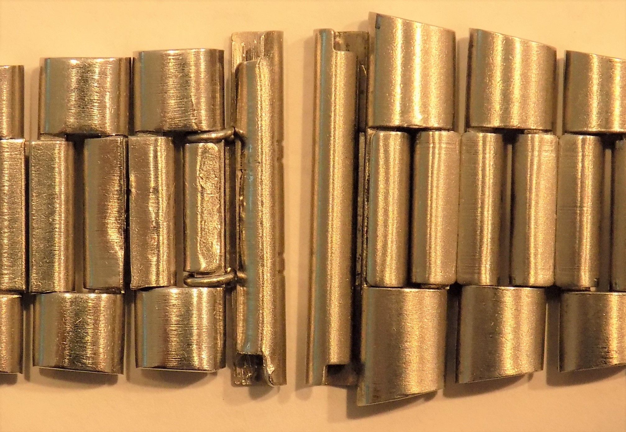 ·I received a vintage Omega 1171 bracelet recently but with the wrong end links. Someone has removed the originals and attached the ones shown on the left in these photos. On the right is a 1162 bracelet with 172 end links. They both have the same 21.7mm width but the replacement link has a smaller attaching link segment measuring between 8.0-8.5mm wide as best I can measure. Spacers were meticulously made out of wire to make the links fit. The replacement also has 4 parallel grooves cut into the links center portion whereas the 172 is plain. They both have the same brushed finish. It does seem to be an Omega link.