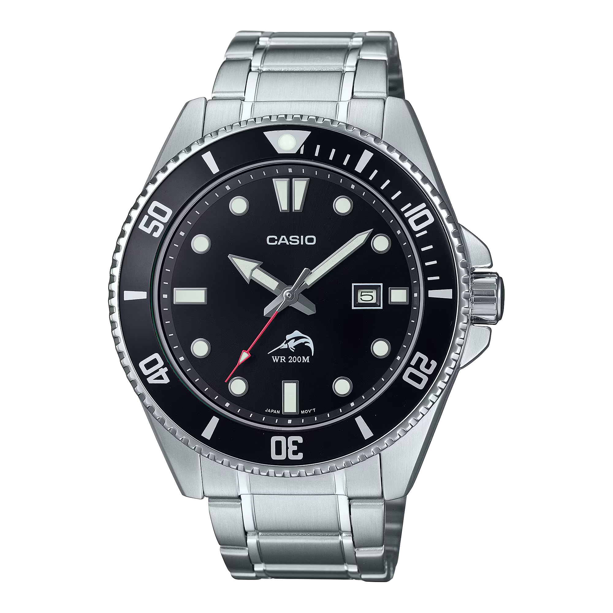 Final option and I'll shut up: Casio MDV106-1A. Although Casio lists the diameter as 44mm, that _includes_ the crown. Actual diameter is ~ 41mm, 12.1mm but 22mm lug spacing. Under $50
