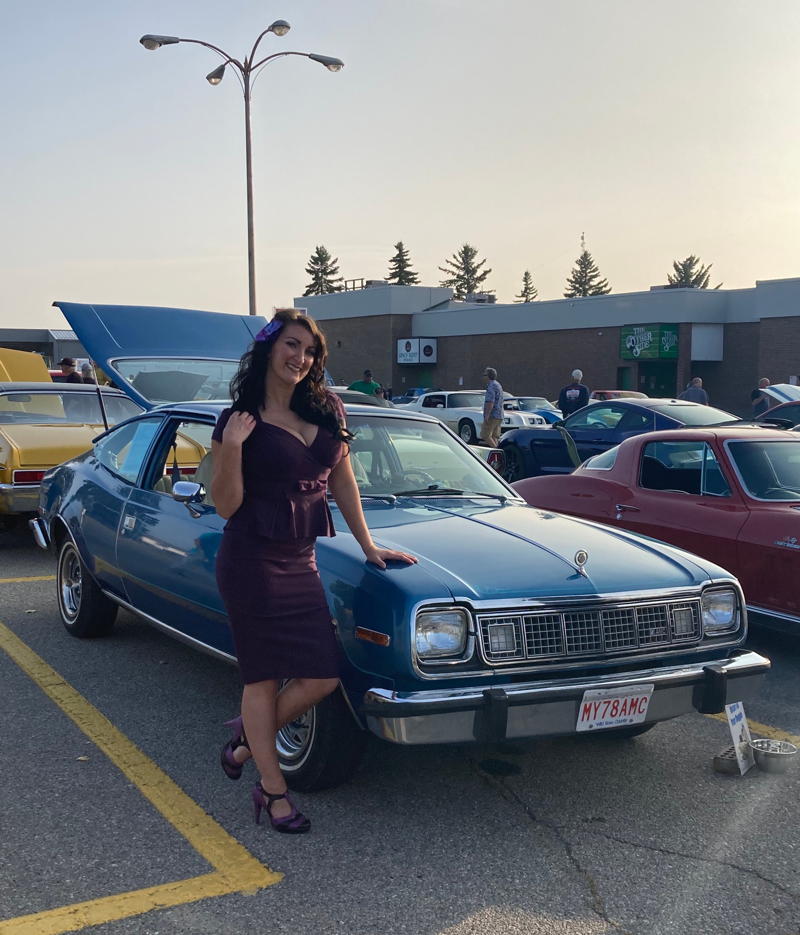 My son and I had my 1978 AMC Concord fastback out to a local s & s last night. He is acquainted with a group of young women who like to dress in 40s vintage clothing and shoes, with (often) fishnet stockings, 40s vintage hairstyles (often with a glamorizer of some sort), 40s style make up, etc. They get their giggles by cruising the car show with professional photographers, posing with cars. Graeme knows “Debbie” (see picture), and he asked her to pose with my car. Car and model of about same vintage. She has two teen aged kids.