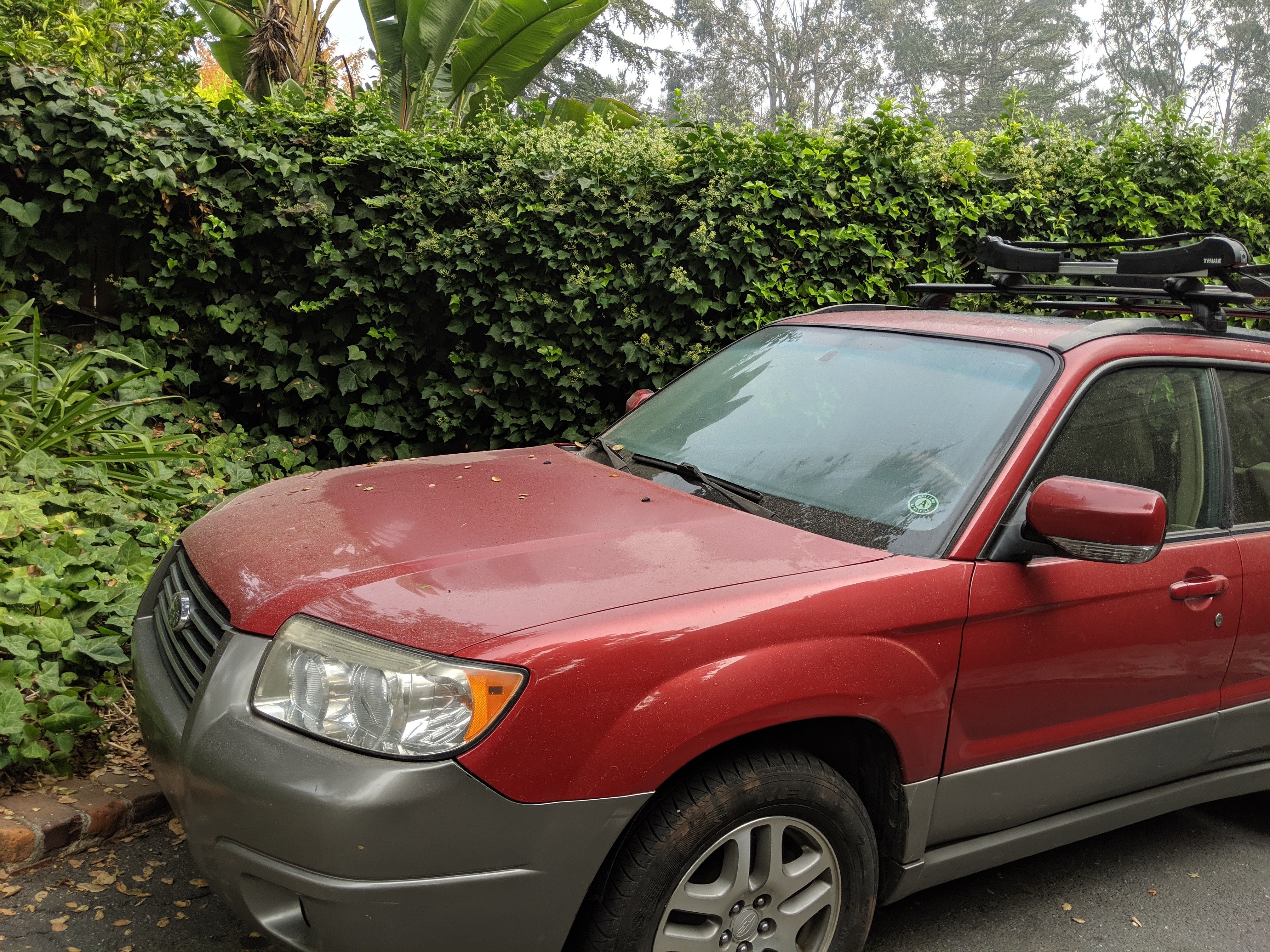 2006 Subaru Forester, currently covered with a fine dusting of ash that used to be a forest. There's poetry in there somewhere but it's hard to appreciate at the moment. Anyway I love having an indestructible and fully depreciated car, it's a nice sense of freedom. And the craziness of my watch being worth more than 2000 lbs of metal is just delightful!