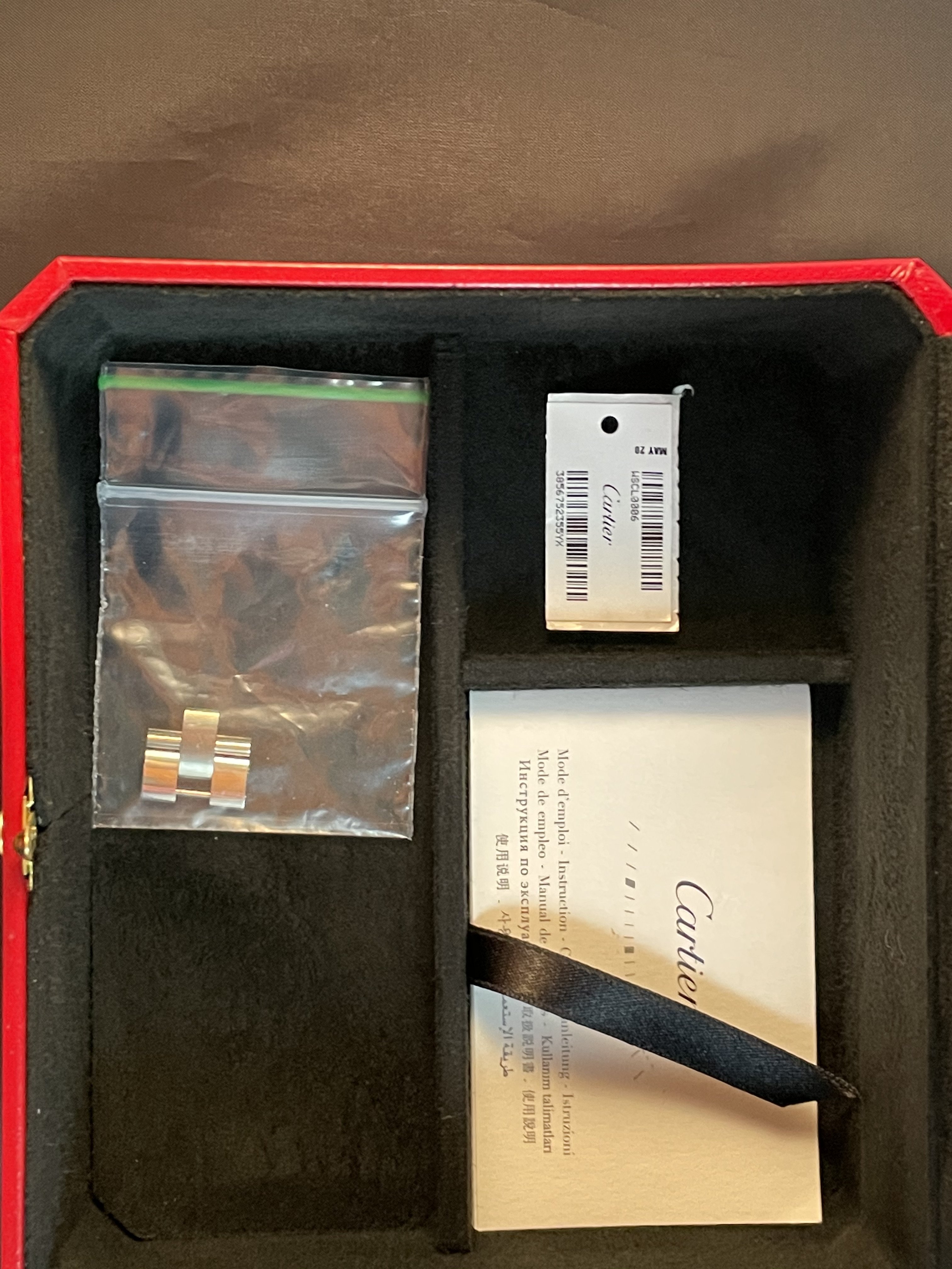 Comes with tags, box, papers (other than Cartier Warranty). My wife bought this for herself as a Birthday present but never wears it so she wants to sell it.