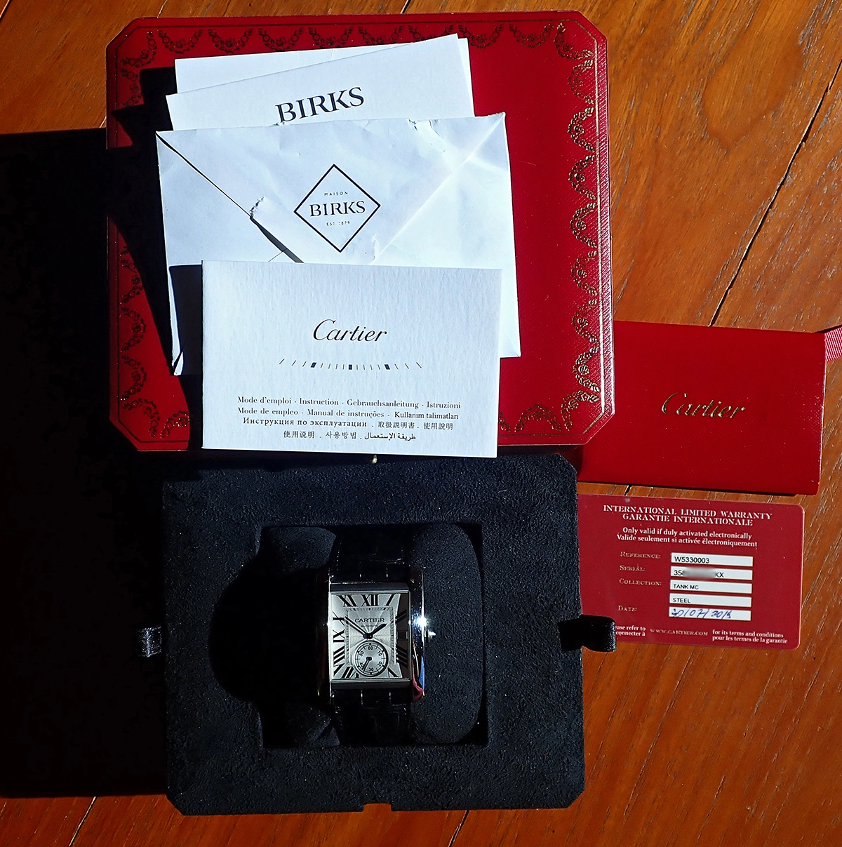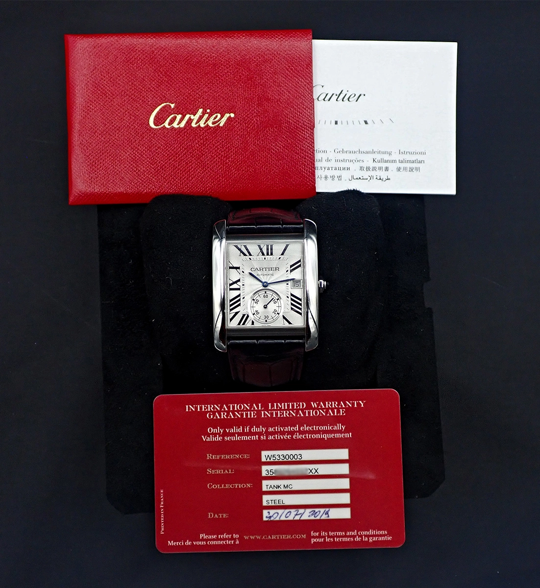 I am the second owner and this Tank MC also comes with red Cartier box and original papers, including International Warranty Card with correctly matching case serial number, mini instruction booklet, as well as paperwork & purchase receipt from Birks Montreal from 2019, confirming original purchase for $9,700 Canadian.