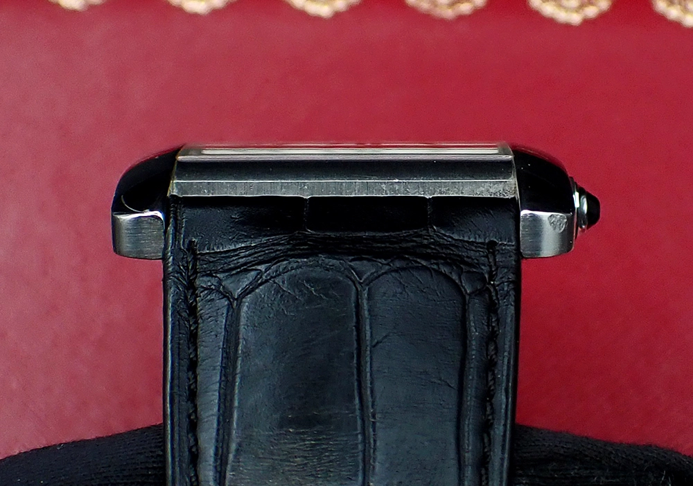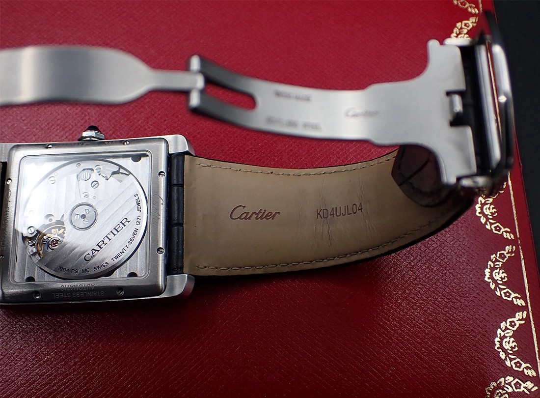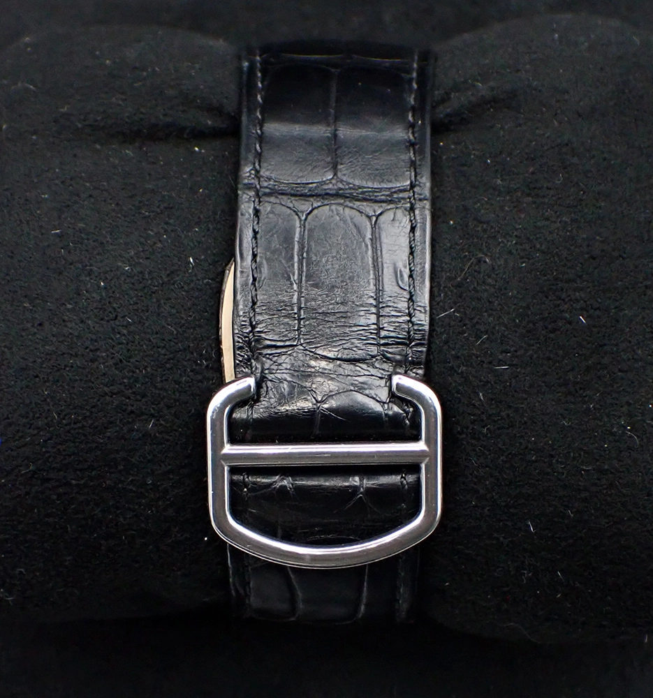 As a de facto new watch, it has not been serviced that I’m aware of and all functions run very well, including timekeeping and power reserve, quickset date, instantaneous date change at midnight and hacking seconds. As mentioned above, the rotor is a bit noisy at times, but I believe this is a known characteristic of the 1904-PS MC (perhaps due to the ceramic ball bearings?). The very specific genuine Cartier black croc strap has been worn and is nicely broken in and very supple, albeit obviously not new and showing light wear. The steel Cartier-signed deployant closes crisply and firmly, as designed.