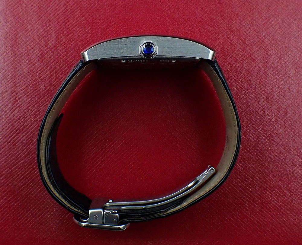 In any event, the Tank MC is by far the most classical and, to my eyes, most handsome of these “Manufacture Cartier” models, with its oversized but still recognizable Tank proportions and design, albeit a bit of a hybrid between the classic Tank Louis and the Tank Americaine. Make no mistake, this is a large rectangular watch at 34mm wide x 44mm long lug tip to lug tip that wears big for sure. But with its ergonomic curved case and the thinness of the movement, it is still only around 9mm tall at its highest point. And with its gorgeous “wave” pattern silver guilloche dial, bold Roman numerals and sunken, engine turned sub-seconds register, not to mention the oversized blue sapphire cabochon-set octagonal crown, it is absolutely stunning on the wrist, as well as being unmistakably Cartier stylistically. The 27-jewel caliber 1904-PS MC is nicely decorated - if also a bit noisy - and easy to admire through the display back. It comes on its original black Cartier crocodile strap with the patented adjustable steel Cartier deployant buckle, which makes proper fitting a breeze for any wrist size just by sliding the strap and then locking it down it via the U-shaped tines.