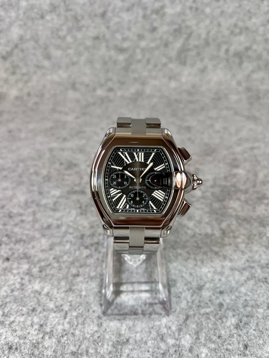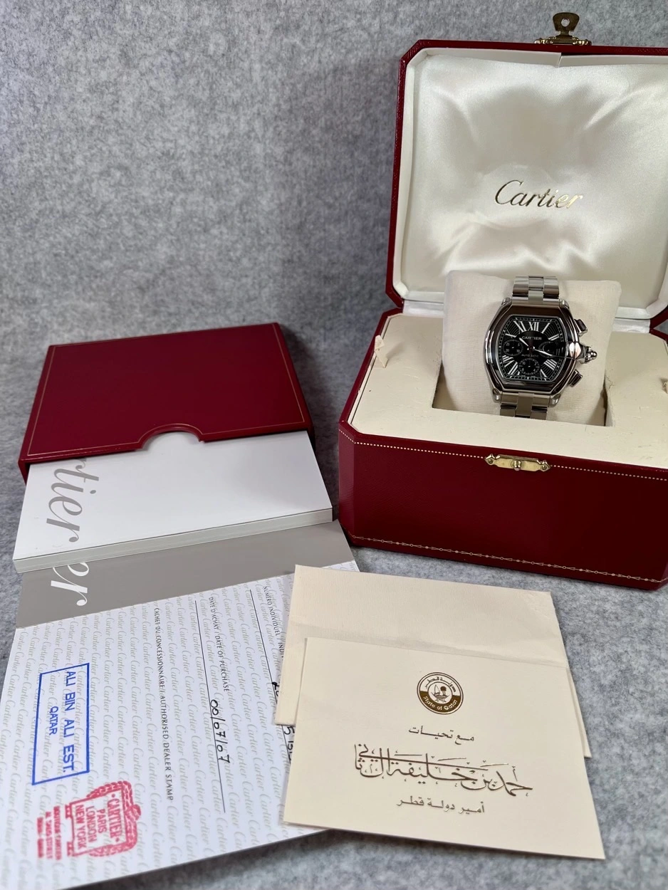 Up for sale is my 2007 Cartier Roadster Chronograph ref. 2618. Asking £4,499 OBO. I am the second owner; the watch was originally purchased from a Qatar Cartier AD in 2007. This watch is in excellent condition worn minimally and carefully, always stored properly. It comes as a full set including Cartier boxes, manual, warranty booklet, watch was originally given as a Qatari Royal state gift (card/ paperwork regarding this is included). The Roadster features a distinctive tonneau-shaped stainless steel case inspired by 1950s sports cars. Its black dial showcases bold Roman numerals, luminous sword-shaped hands, and three subdials, all protected by a sapphire crystal with an integrated cyclops lens. A notable feature is its quick-release bracelet system, allowing effortless strap changes without tools, enhancing versatility and ease of customisation. The watch has been well maintained and runs flawlessly. It has been kept in my PELI 1450 watertight case (not included) in a temperature-controlled room, opened once a month to give the movement a full wind.