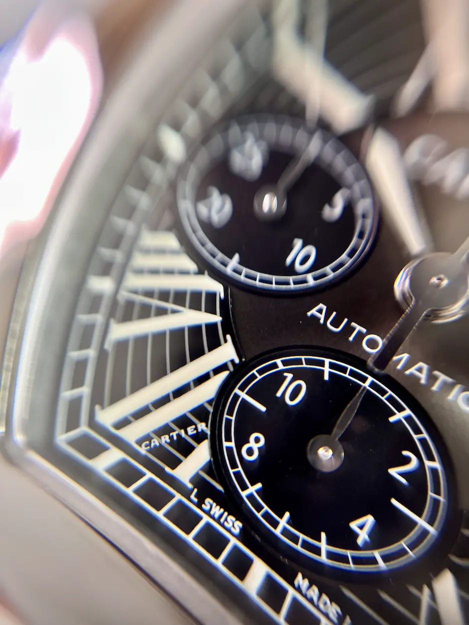 Features: Chronograph, date at 3 o’clock, screw-down crown, tonneau case design