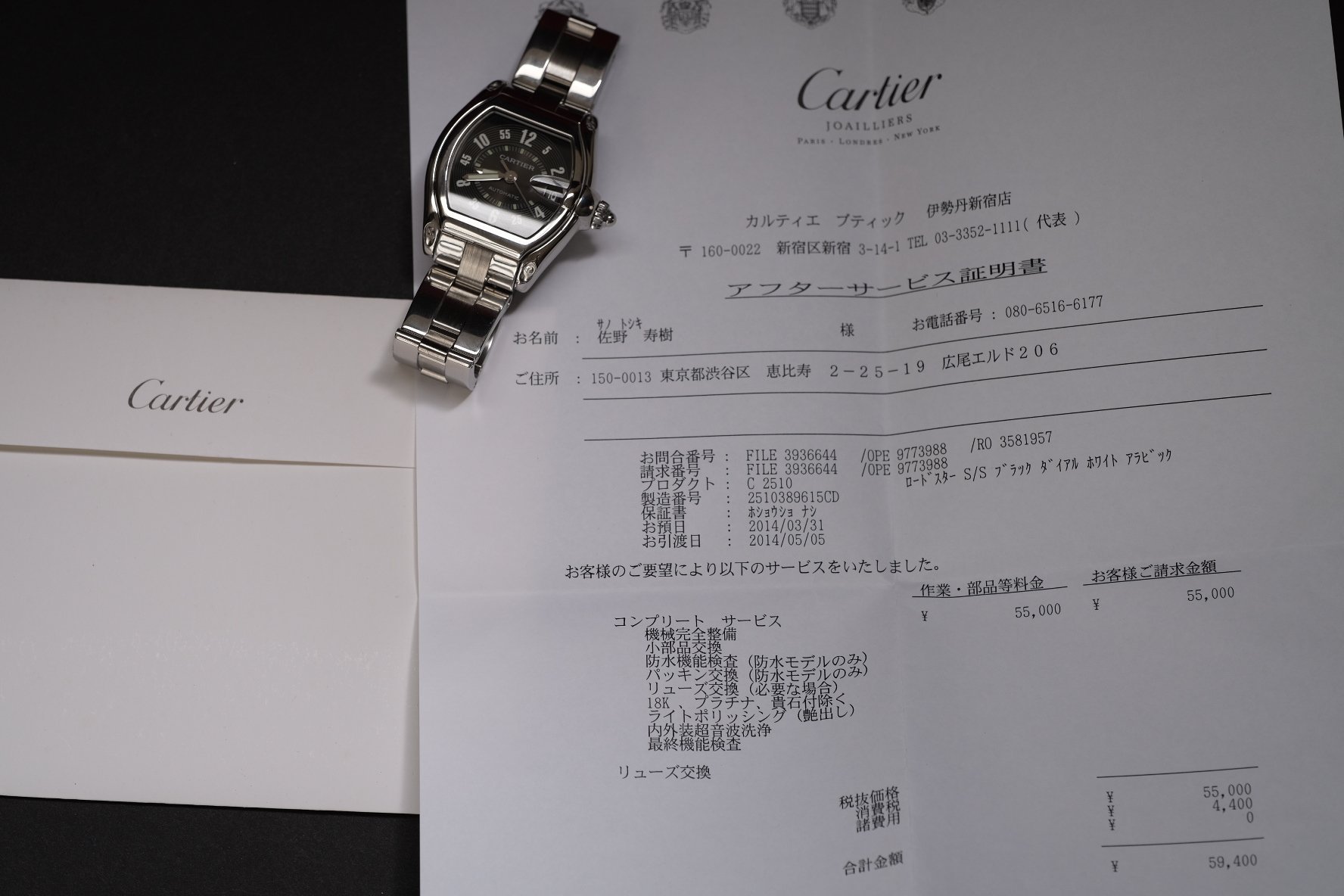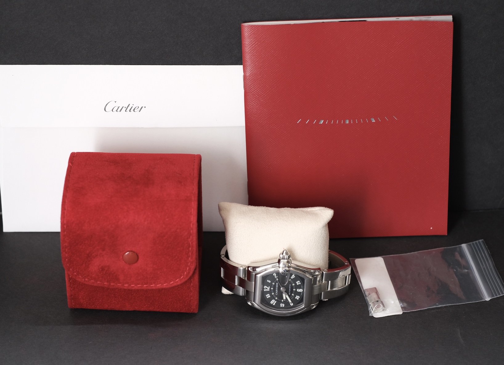 ACCESSORIES: Watch on bracelet with Cartier service papers (from Japan - thanks to google translate I believe this was for a full service in either 2014 or 2019!) Cartier service pouch, Cartier dealer booklet, and extra half link.