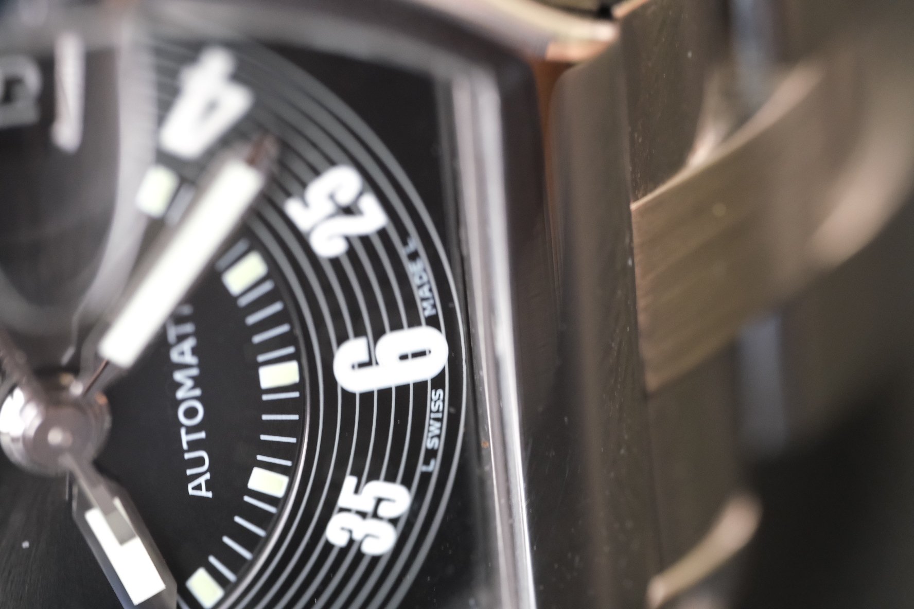 DIAL: So sweet! Full stealth black dial, concentric circular outer track with modern numerals juxtaposing the fluid case around it makes for a killer combo! In great condition with a whole lot of lume that still shines bright! Under a loupe/macro can see a few specs/dust, etc, common with black dials, but looks great on the wrist and all protected under sapphire crystal with only very light wear as well.