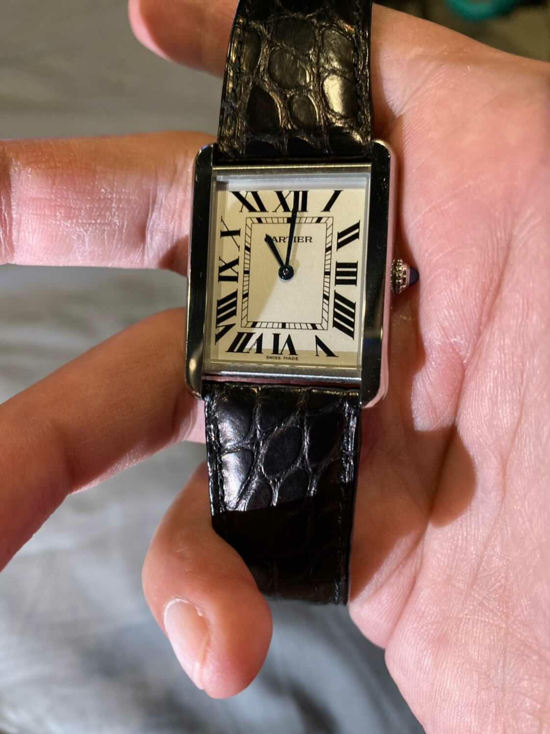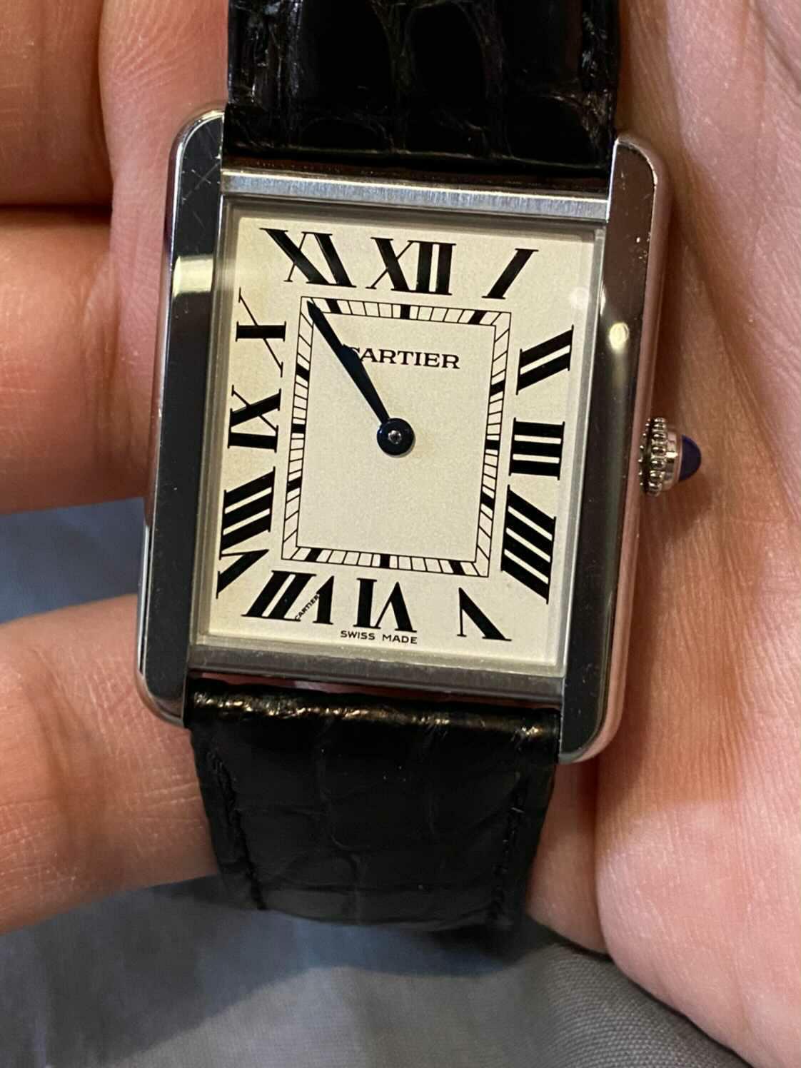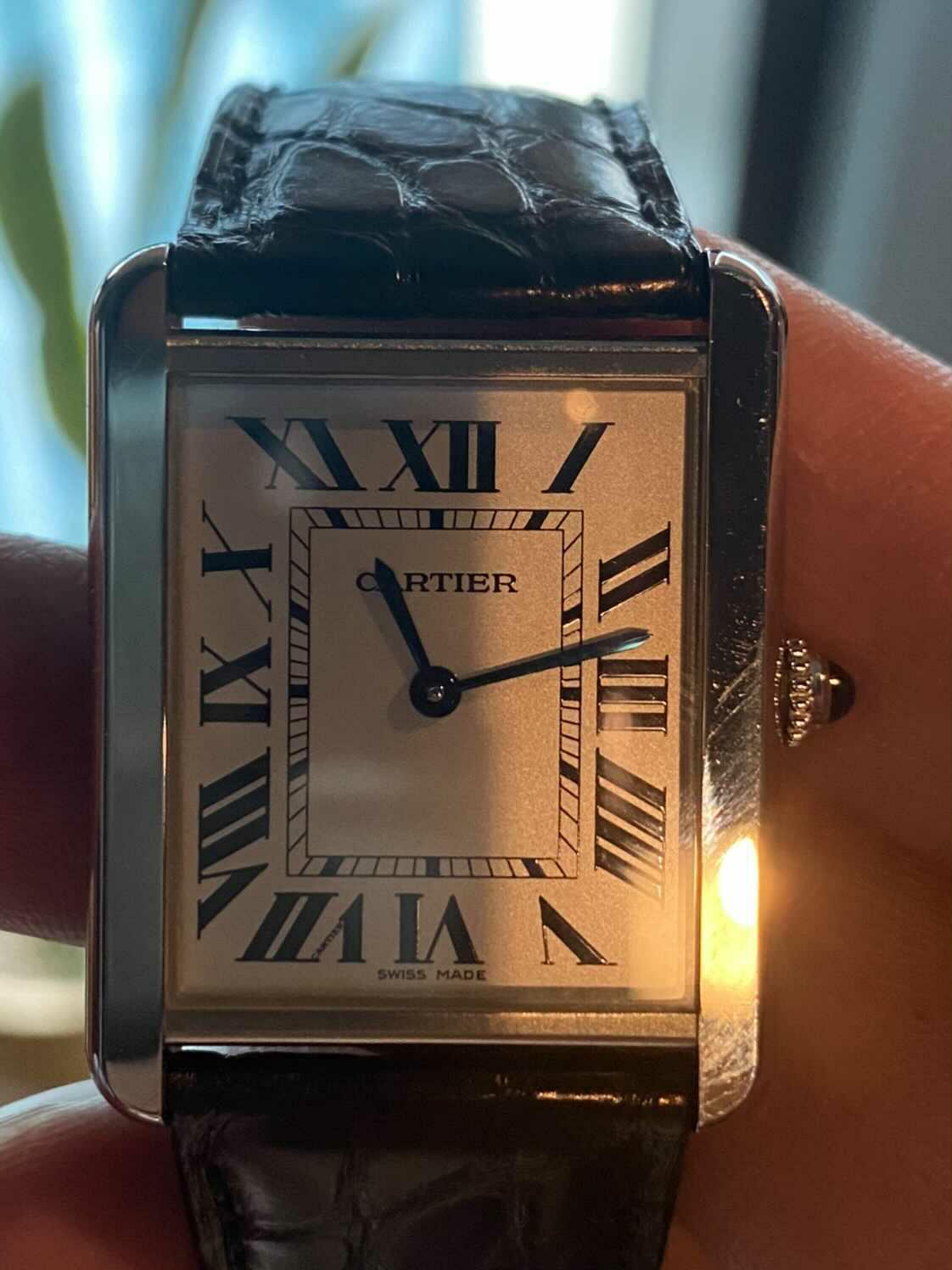 To determine authenticity of a Cartier Tank I’d need a much closer and brighter shot of the dial. Authentic dials have very fine serifs.