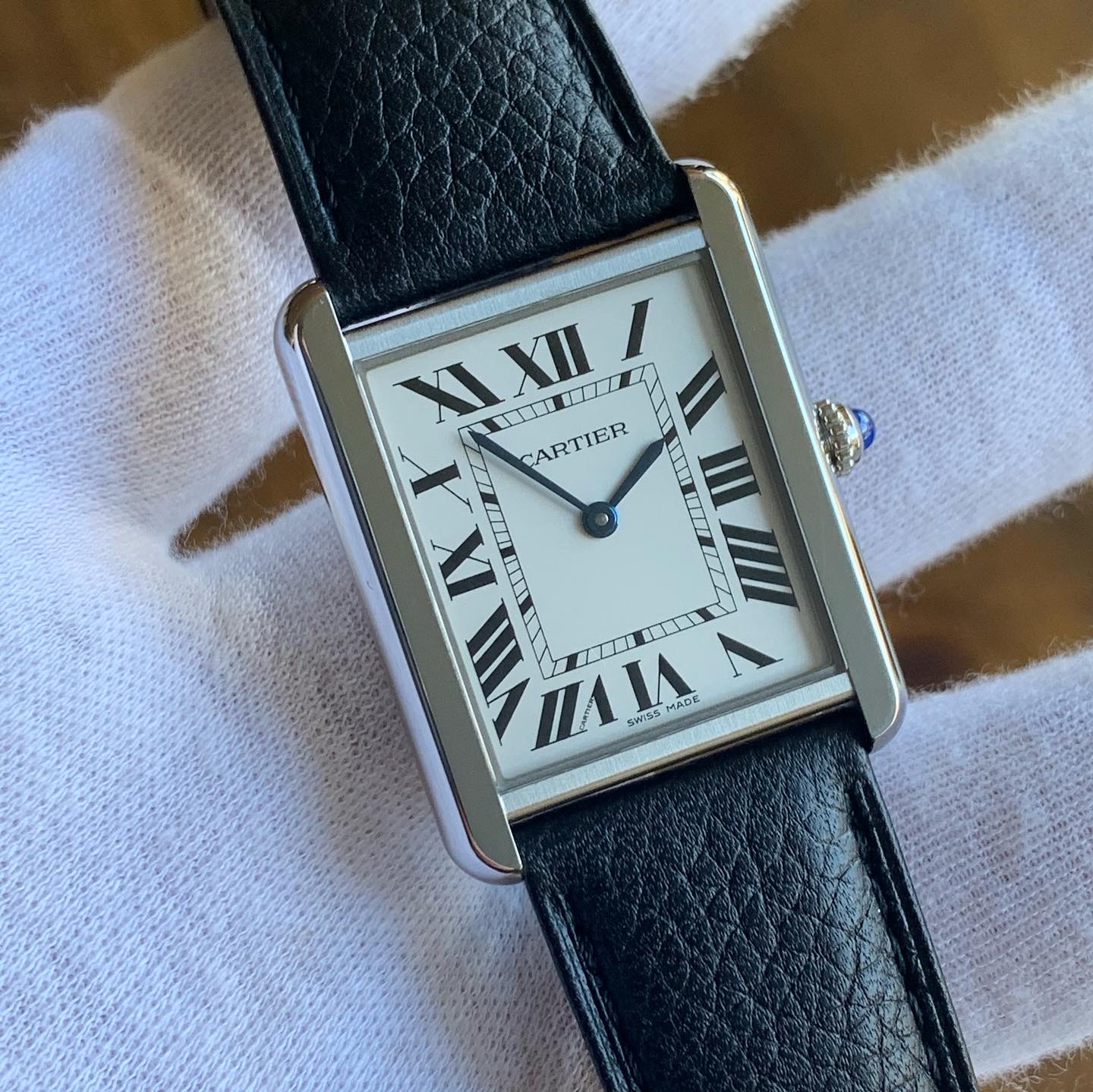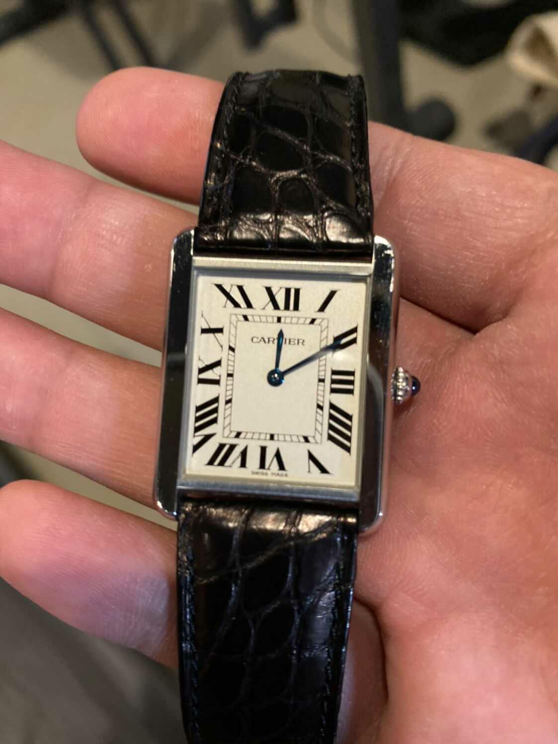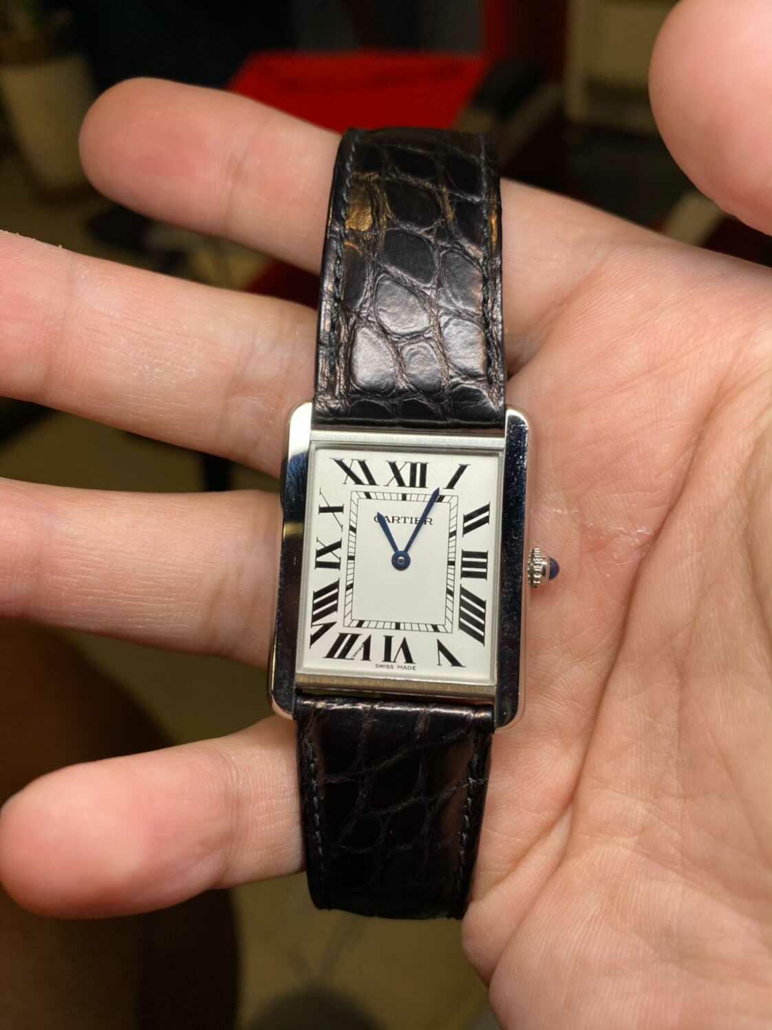 To determine authenticity of a Cartier Tank I’d need a much closer and brighter shot of the dial. Authentic dials have very fine serifs.