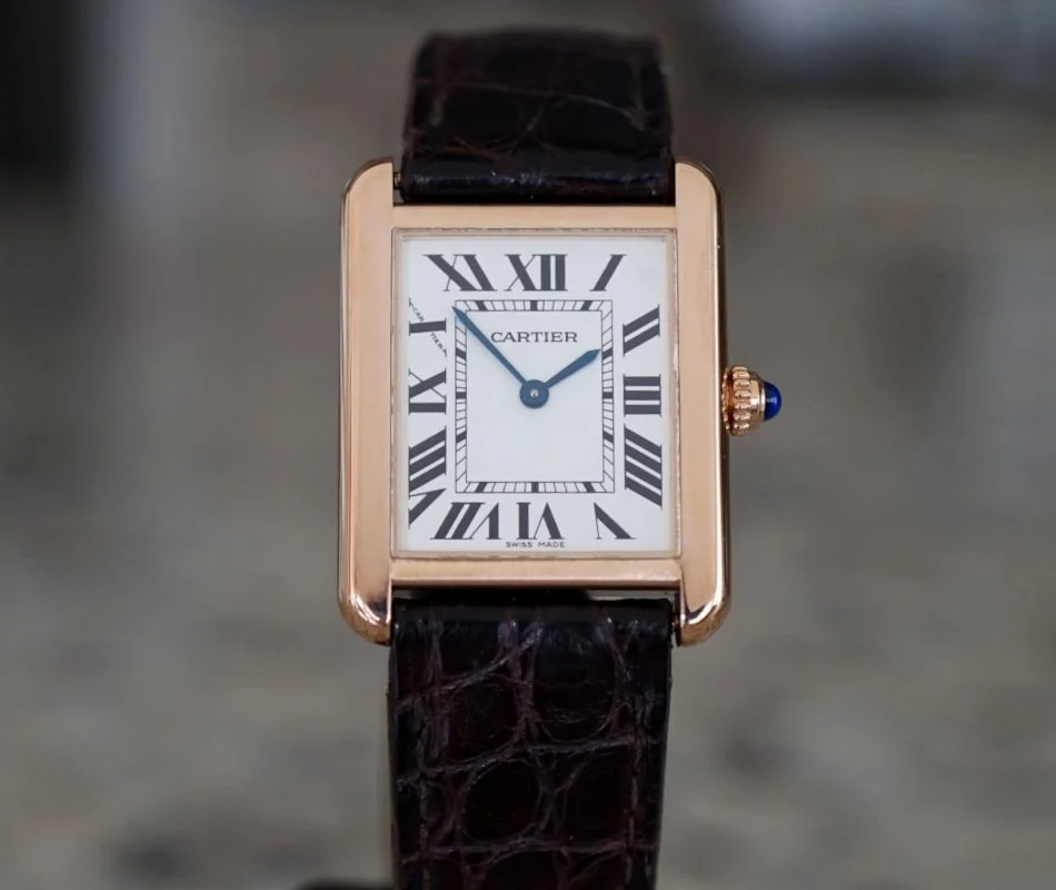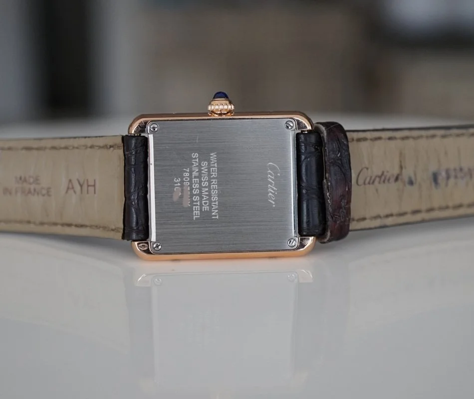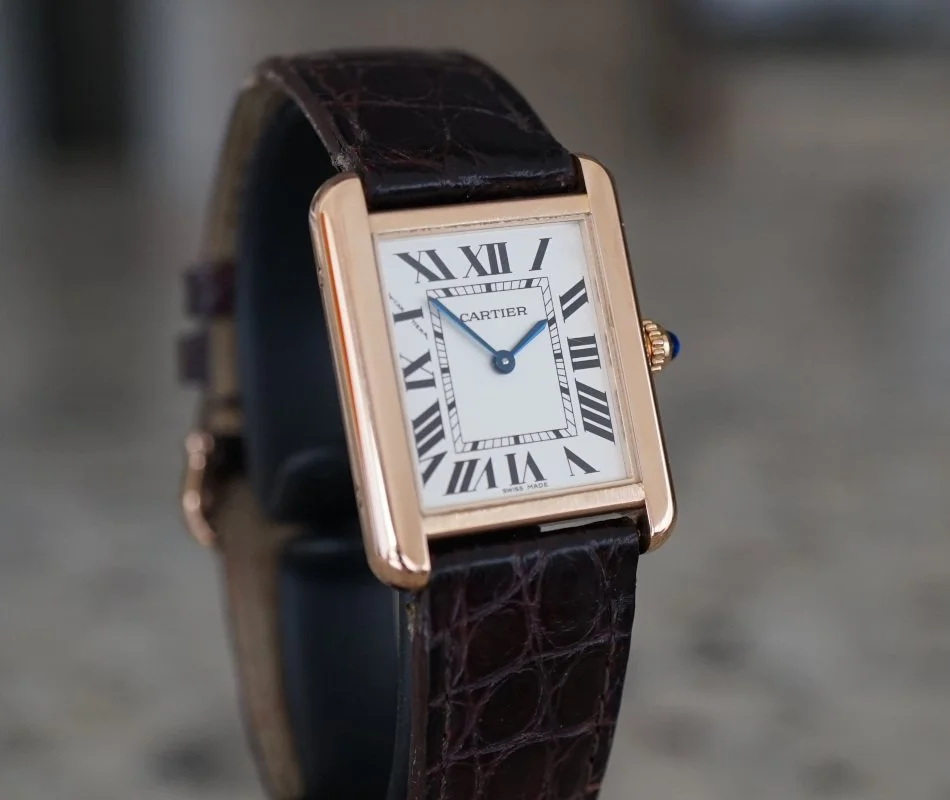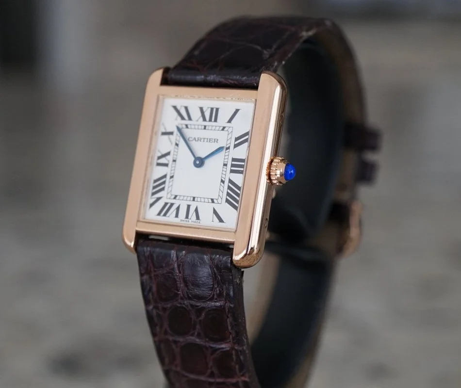 ·Cartier Tank Solo Ref 3168, 18K Rose Gold Case measuring 24mm x 31mm, stainless steel case back, quartz movement, silver opaline dial with roman numerals, sapphire cabochan crown, leather strap (worn) on a Carier rose gold tang buckle, watch only
